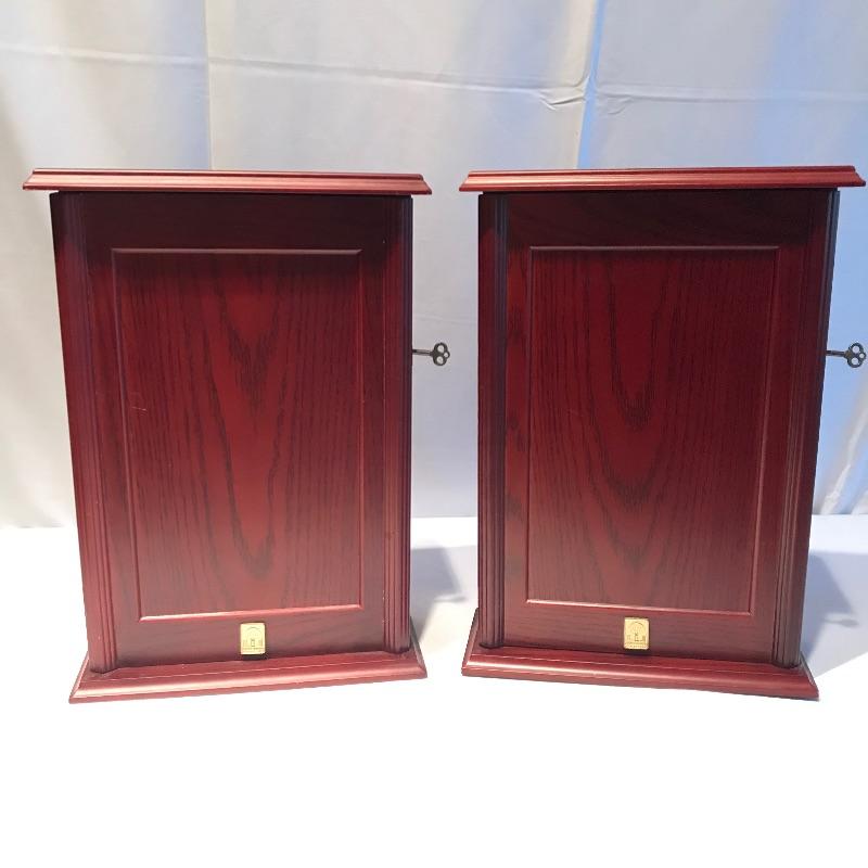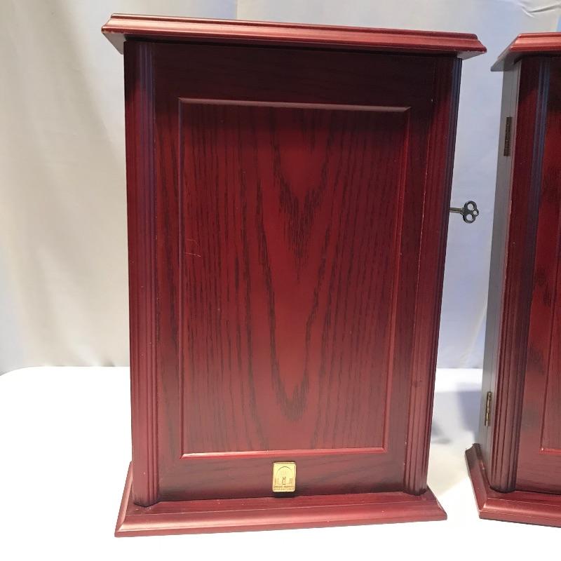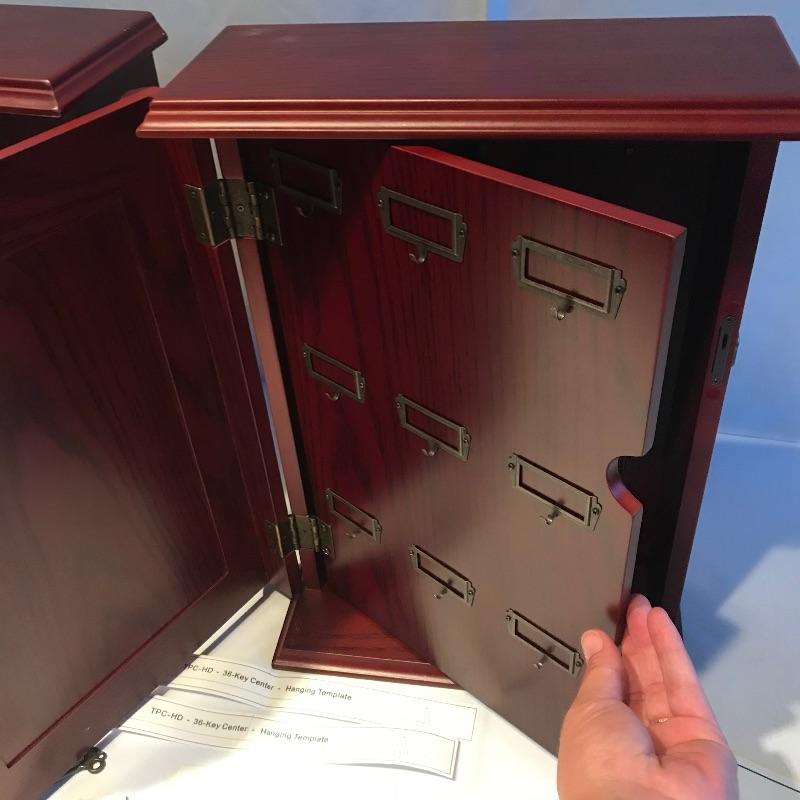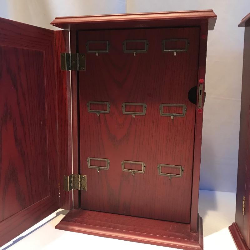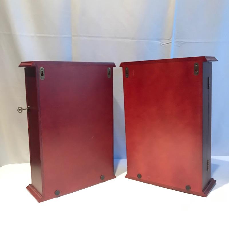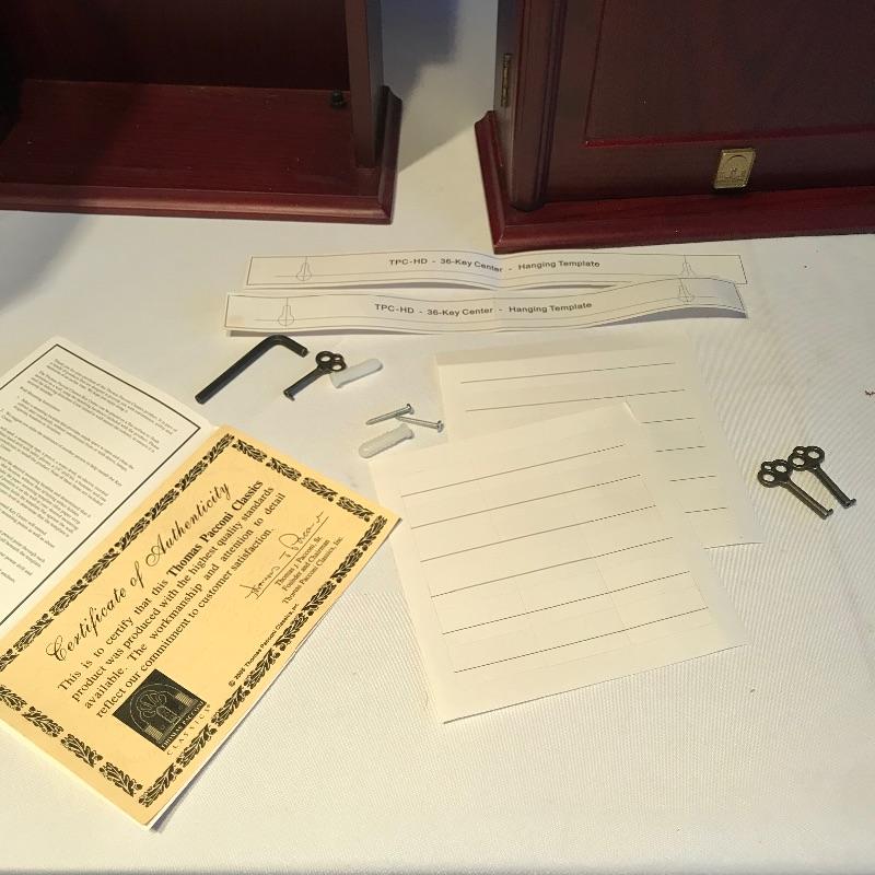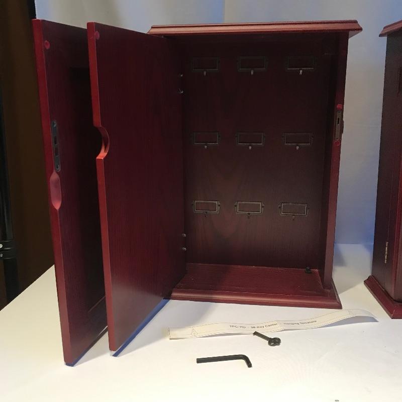 Two beautiful Thomas Pacconi Classics Key Centers model TPC-HD-36. These are a matching pair with a total of 36 hooks for the security of your keys. They each have paper hanging templates for convenient wall hanging and enough paper tabs to label each hook. One cabinet has hardware, but the other will need hardware. The right cabinet has one key, the left has two keys and a COA. Neither cabinet appears to have been used and only a couple small scuffs were found. Both have eighteen hooks, nine in two separate compartments. They measure 12” x 4.5” x 17” and appear to be pressed wood with a deep red finish. Local pick up only.