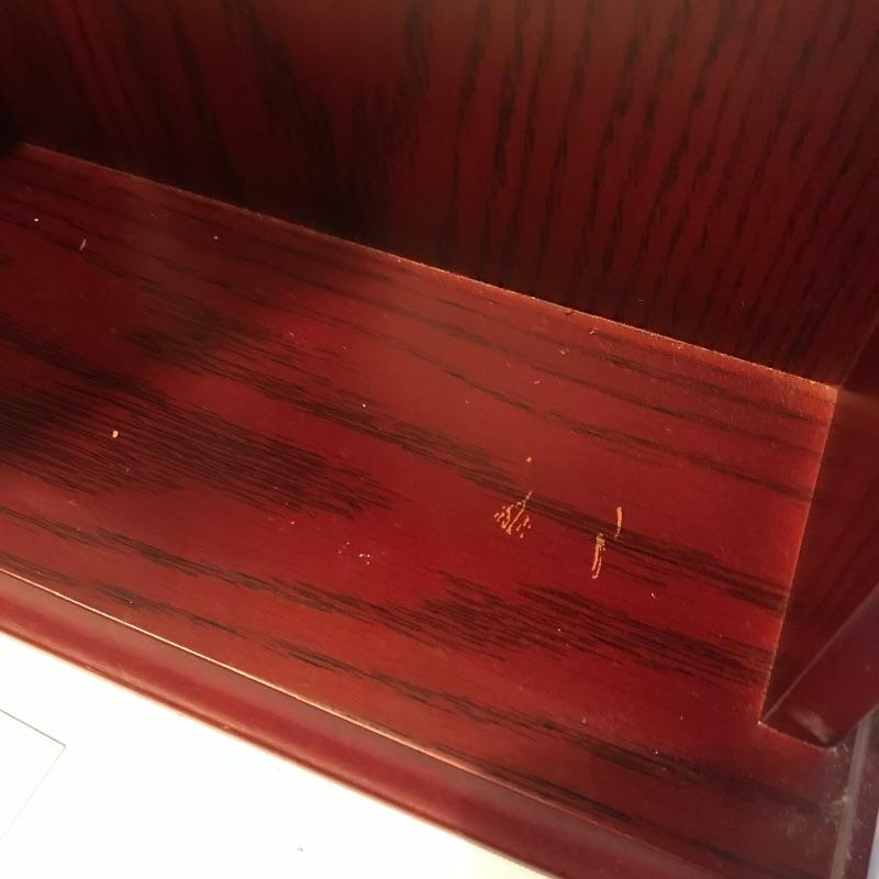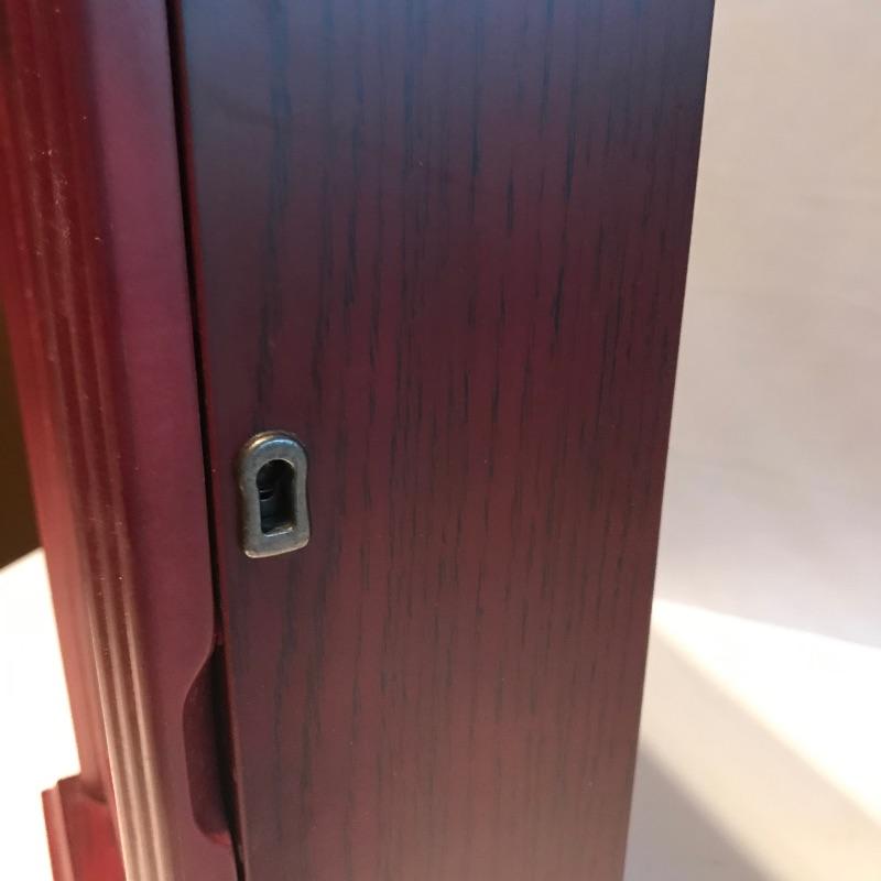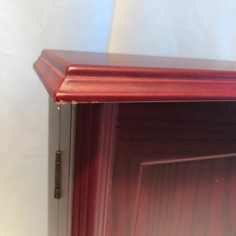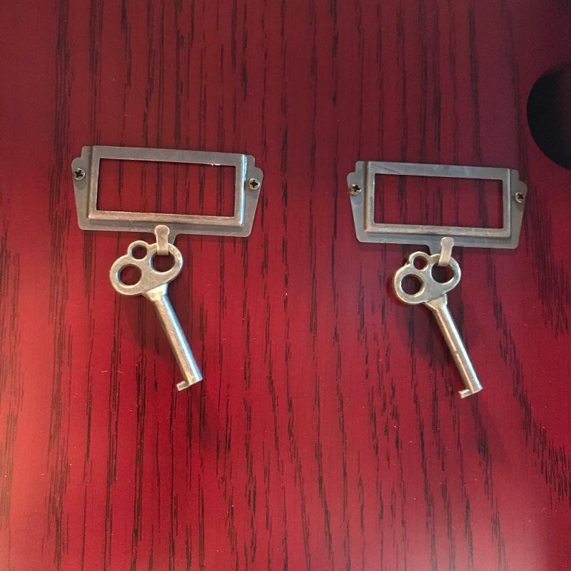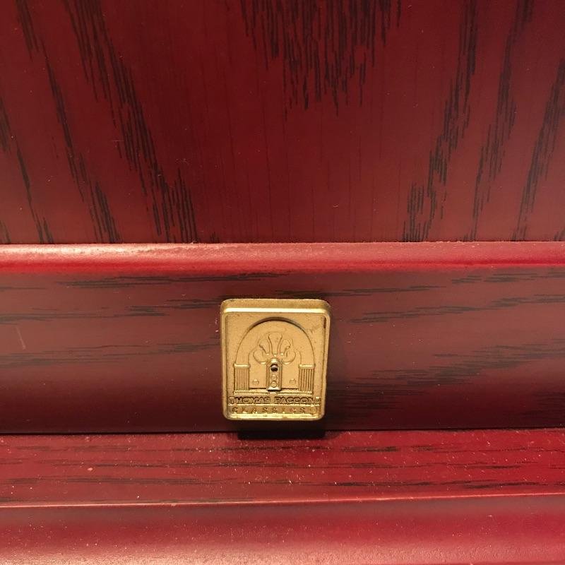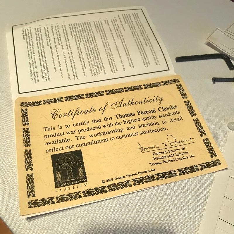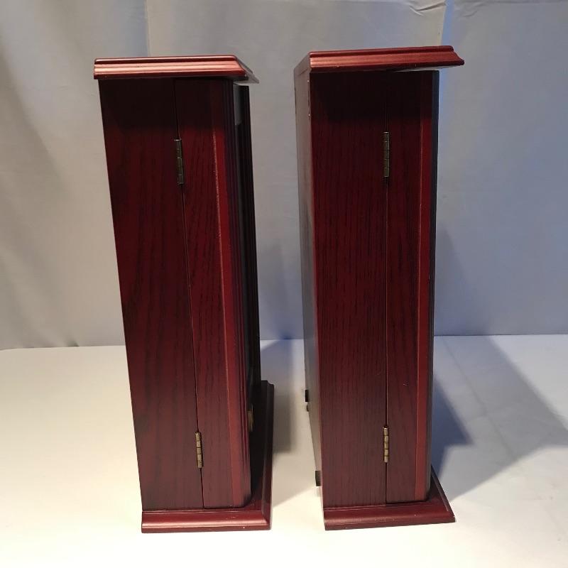 Two beautiful Thomas Pacconi Classics Key Centers model TPC-HD-36. These are a matching pair with a total of 36 hooks for the security of your keys. They each have paper hanging templates for convenient wall hanging and enough paper tabs to label each hook. One cabinet has hardware, but the other will need hardware. The right cabinet has one key, the left has two keys and a COA. Neither cabinet appears to have been used and only a couple small scuffs were found. Both have eighteen hooks, nine in two separate compartments. They measure 12” x 4.5” x 17” and appear to be pressed wood with a deep red finish. Local pick up only.