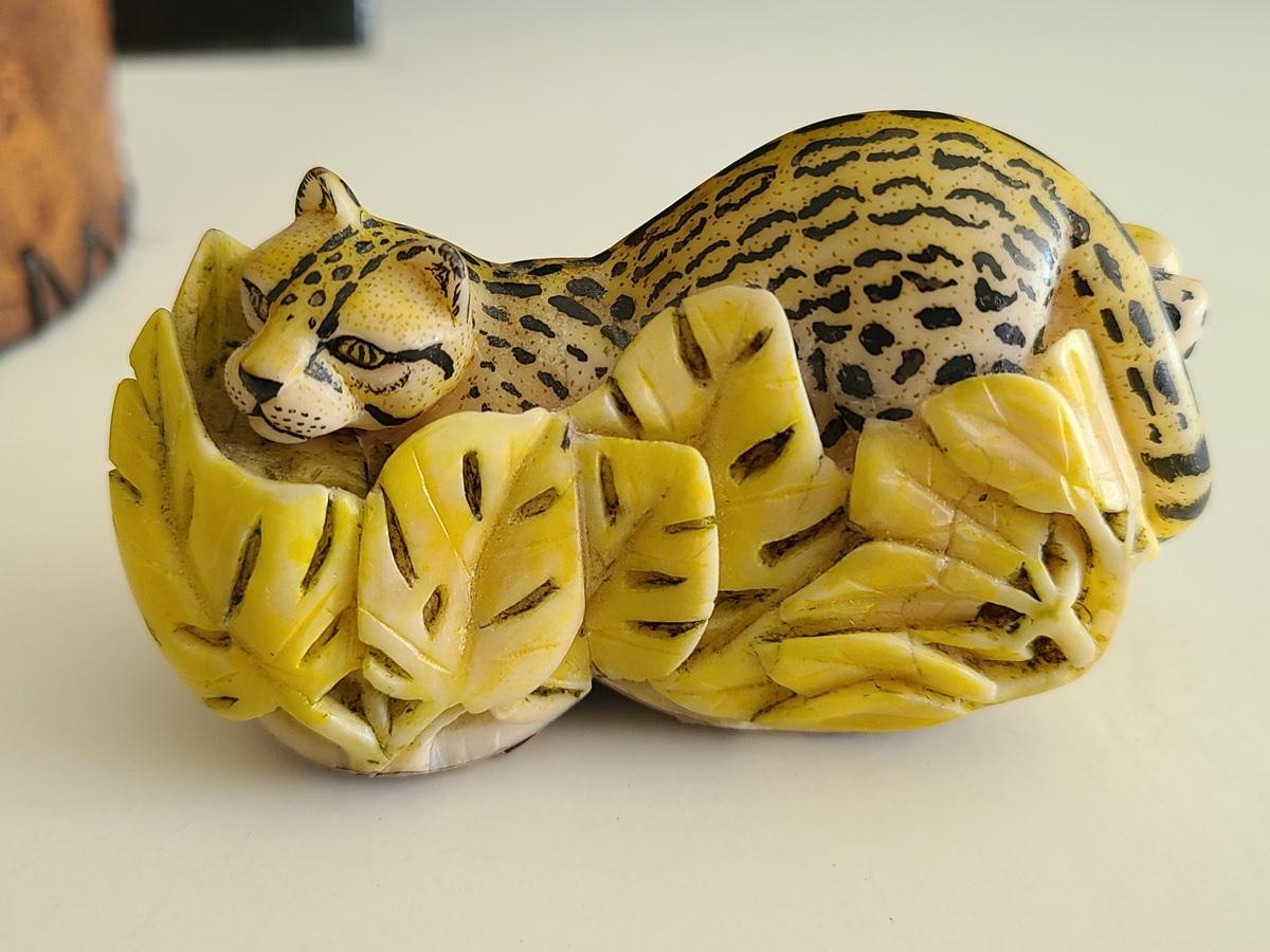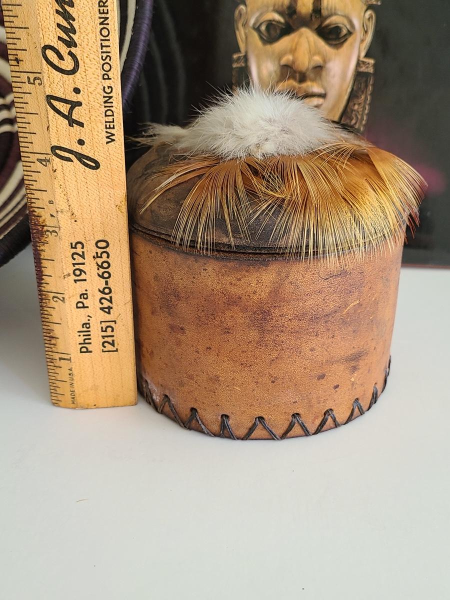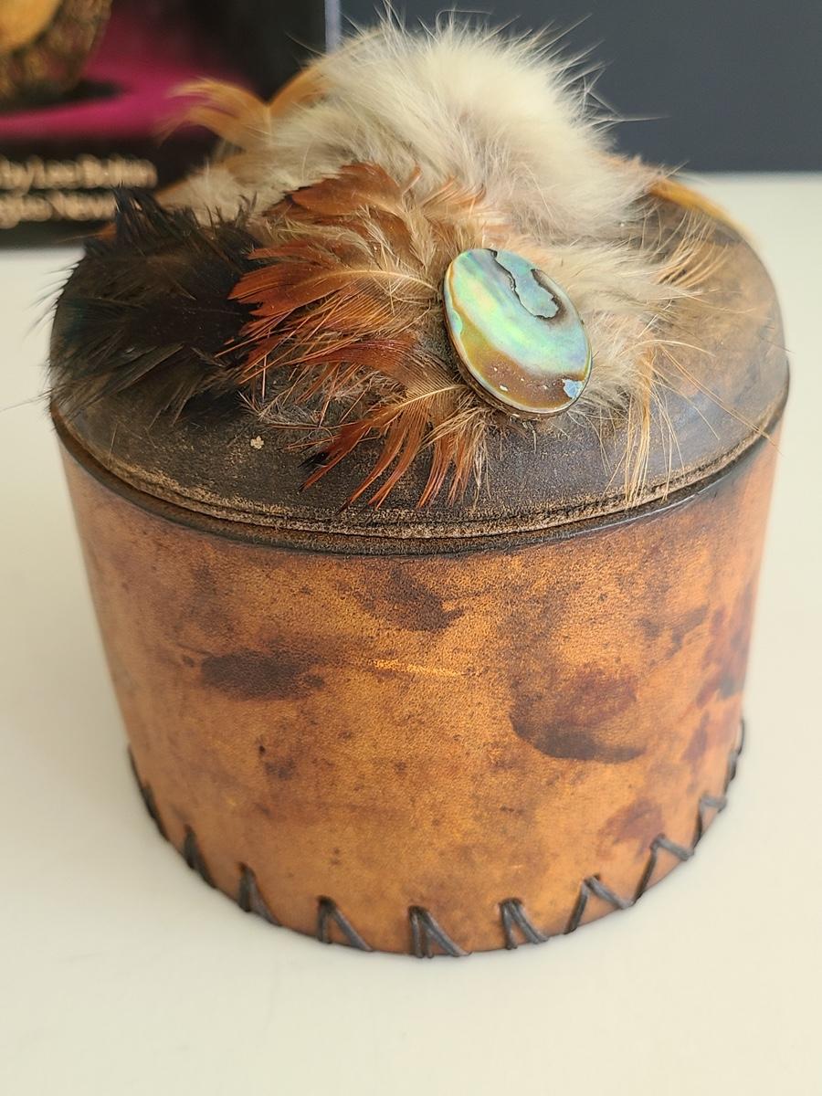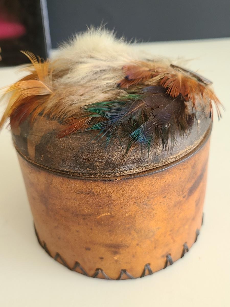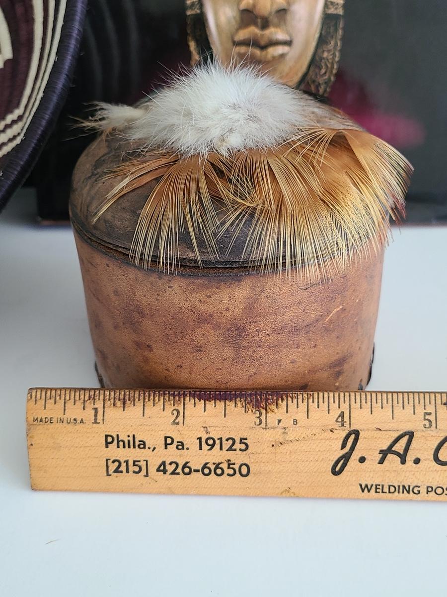 Unique works of handmade arts including a carved from bone ocelot, Rwanda Path to Peace Basket, and a leather and feather trinket container lined in fur. These are pieces are art, please see the pictures for the details and craftsmanship! Please see all pictures for content of the lot, condition of the lot, and measurements if taken. Pictures are the best representation of the items listed and items are untested unless indicated in description. Thank you for looking and have fun bidding![