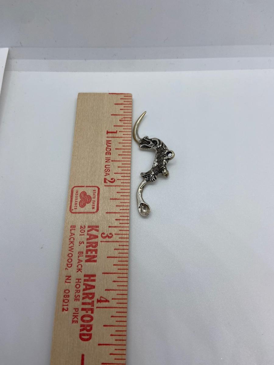 This is an interesting pin! A fish swallowing another fish and a small snuff spoon on the end. The small hole on top indicates it could also be a charm or pendant. Medicine Spoon, Snuff Spoon ,Powder Scoop Mini Spoon for Filling Vials with Medicine, Sand, Salts or Herbs. Specialty Spoons have also been used for clearing sweat from the brow or for nasal congestion. One thing is certain, it's quite a conversation starter!