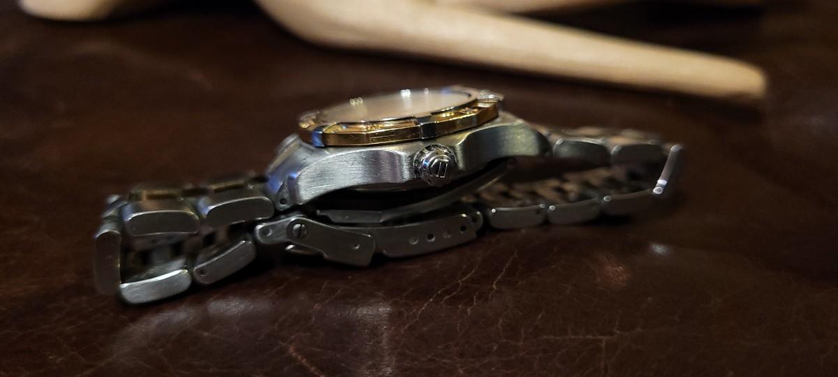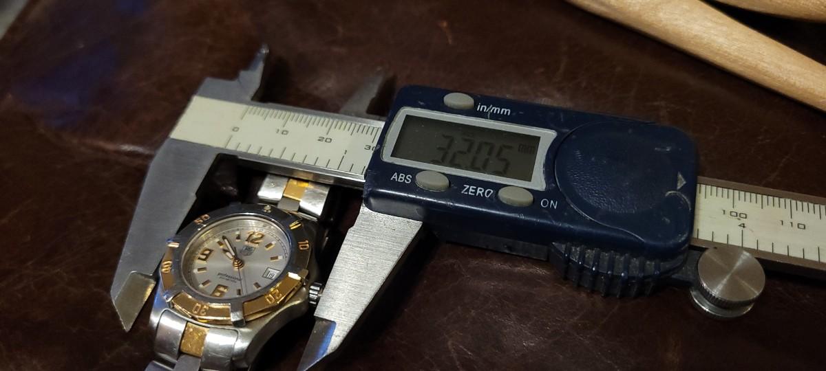 Just had a fresh battery installed (2 year) at the local Batteries Plus (reciept shown). This watch keeps great time and looks beautiful on the wrist. About 32mm. Includes original manual and Box with extra links. Bezel rotates as designed. Classic timepiece from a very respected maker.