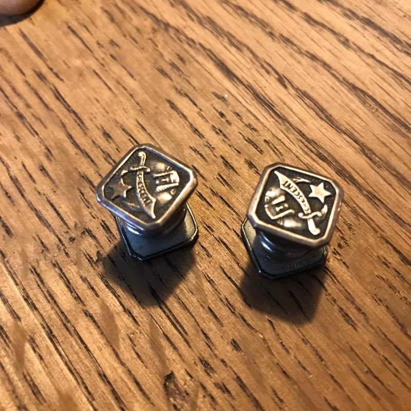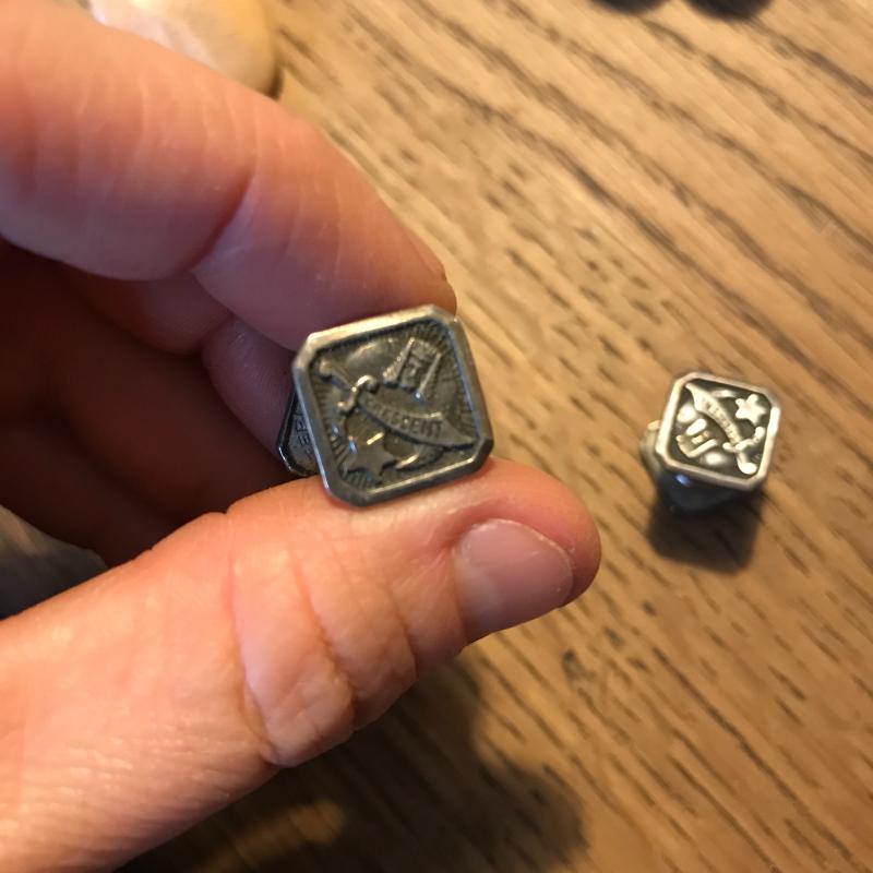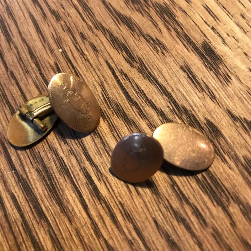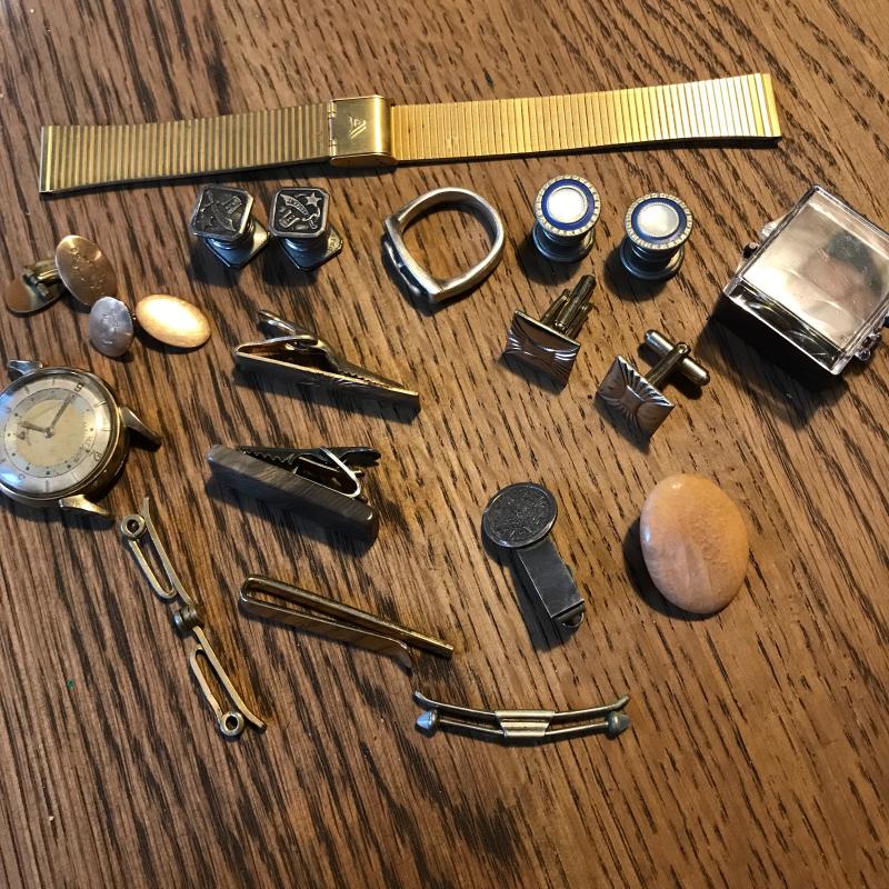 This lot contains five sets of cuff links, one ring, four tie clips, one watch band, one watch face, and two collar clips. Shipping available or local pickup in Flat Rock, NC.