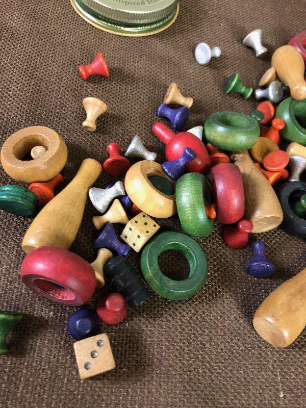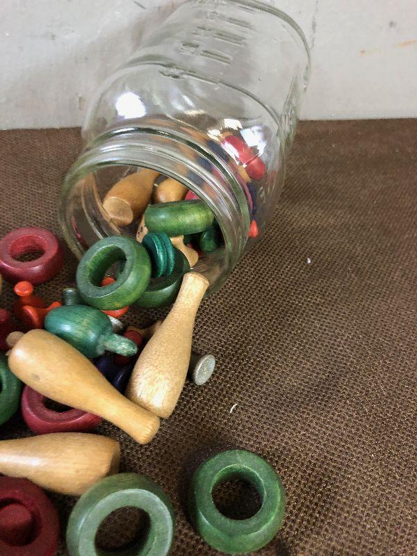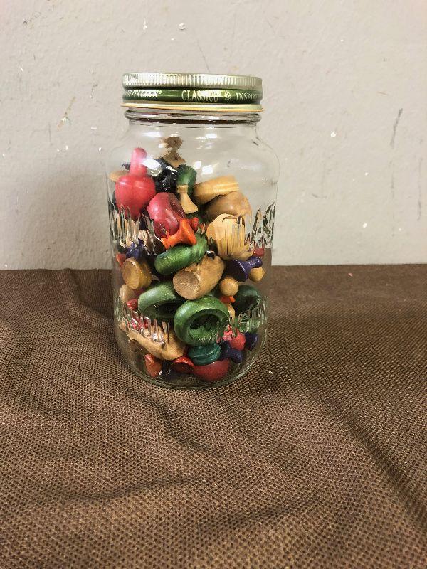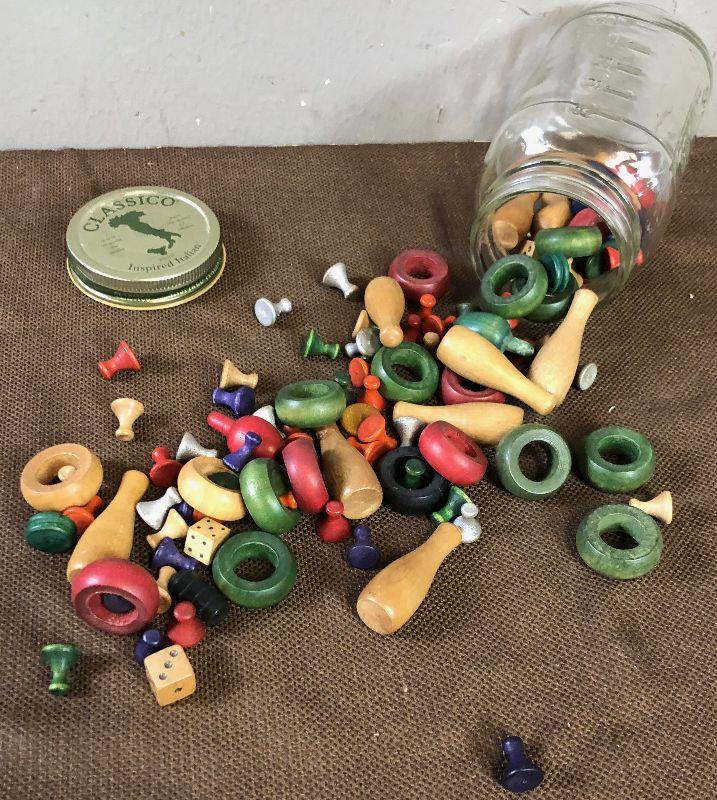 Lot #88 Antique Jar full of Vintage Wooden Game Pieced