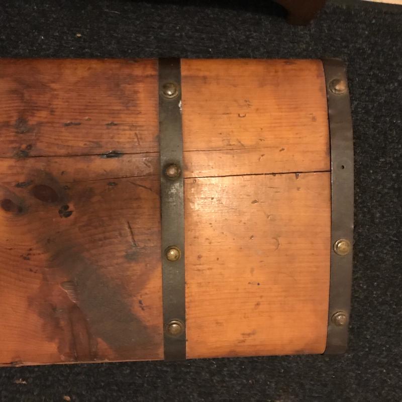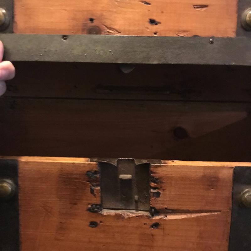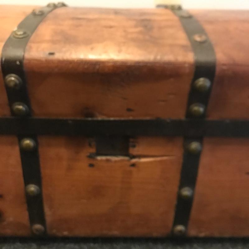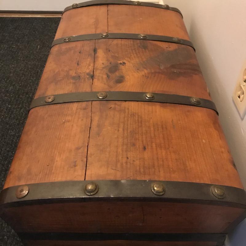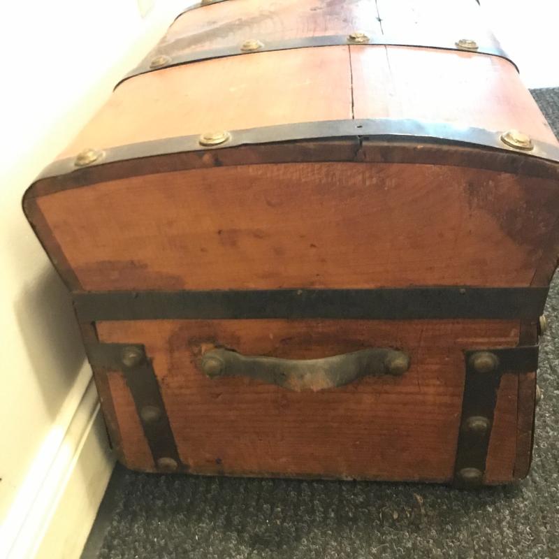 Nice looking trunk with metal detail. Latch is a bit quirky but works. One leather strap is broken and one metal button on top is missing. Slightly rounded top. Nice storage accent piece. Measures 28” x 16” x 15.5” No shipping