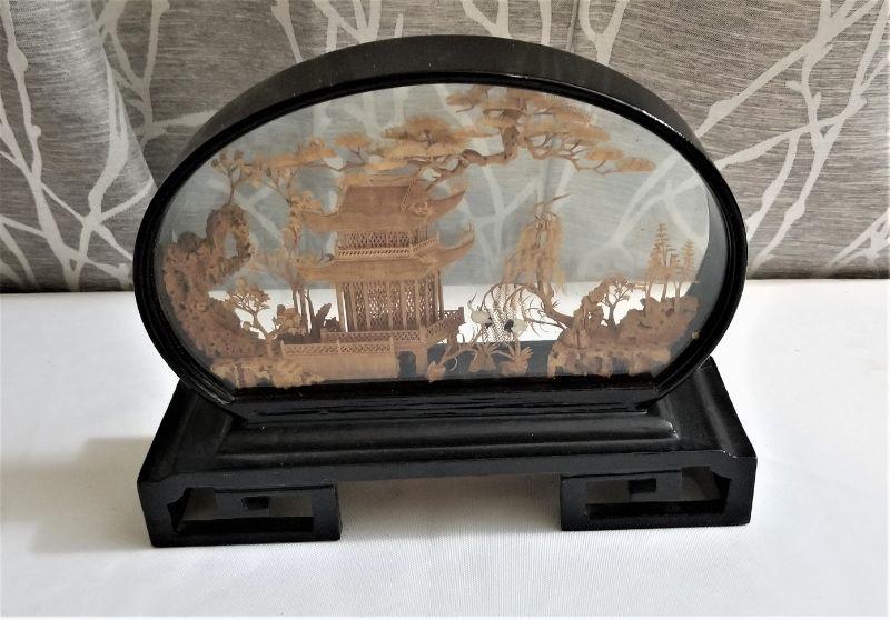 So delicate - entire temple scene done in cork - excellent condition. Black lacquer base, curved case. 8" long, 6.5" tall.