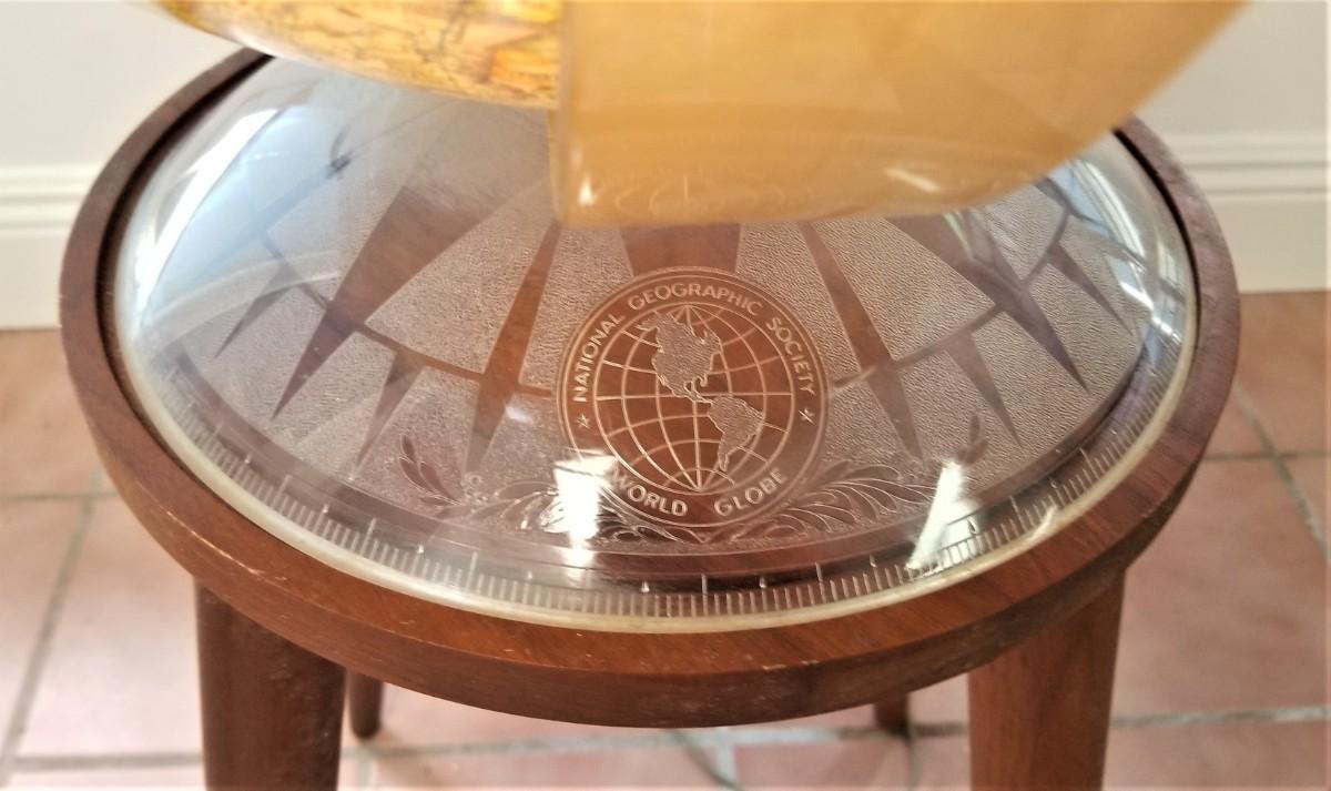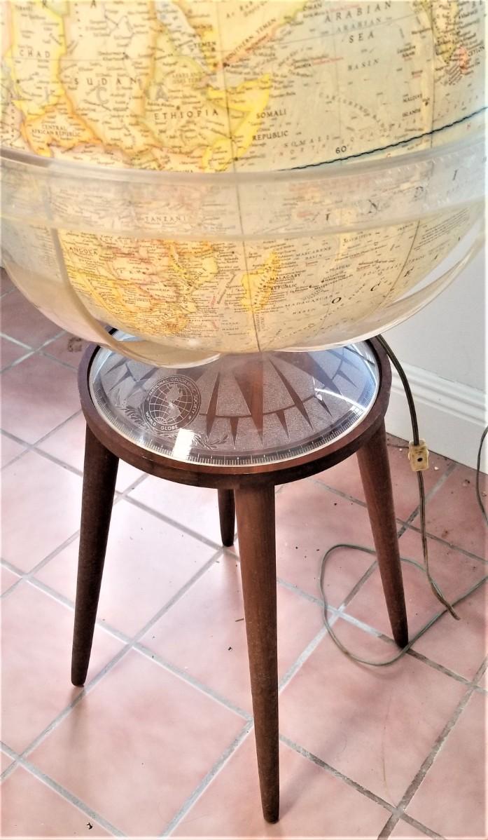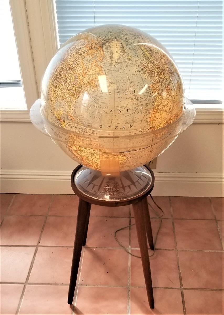 This National Geographic World globe is dated 1969 - lights up - on stand, can be used as a table-top globe. Has lift off plastic cover on top. About 38" tall - a real beauty!