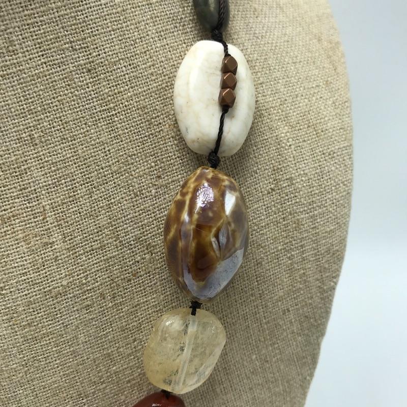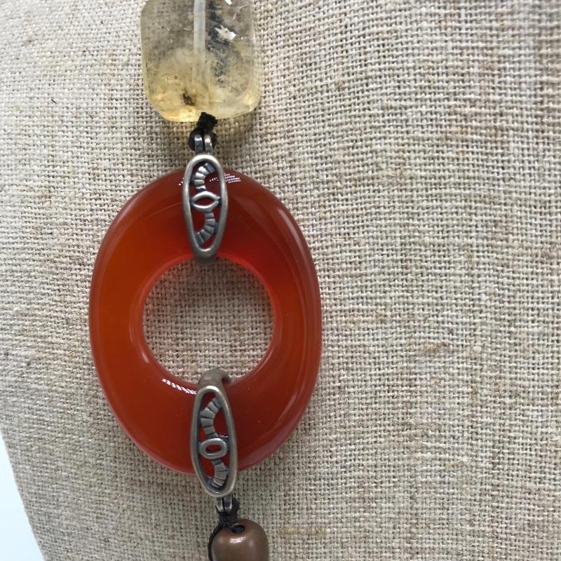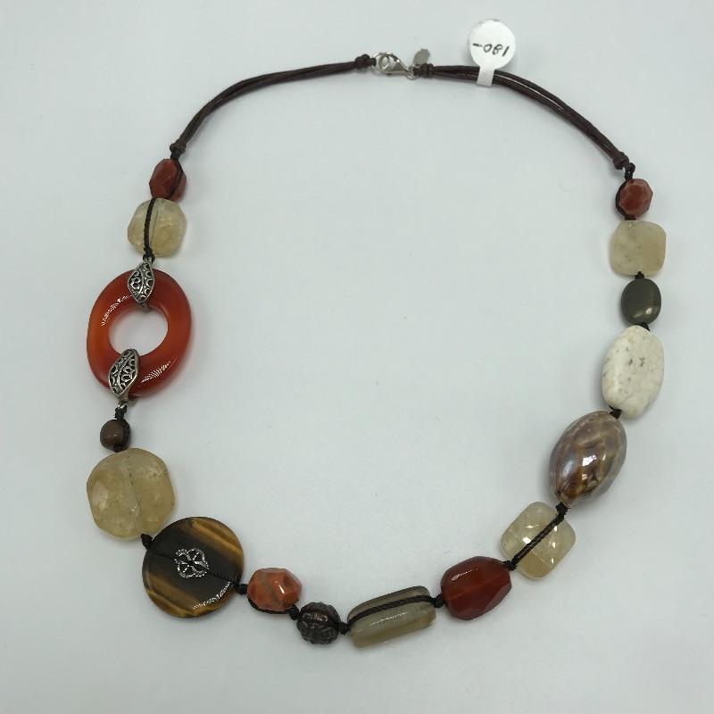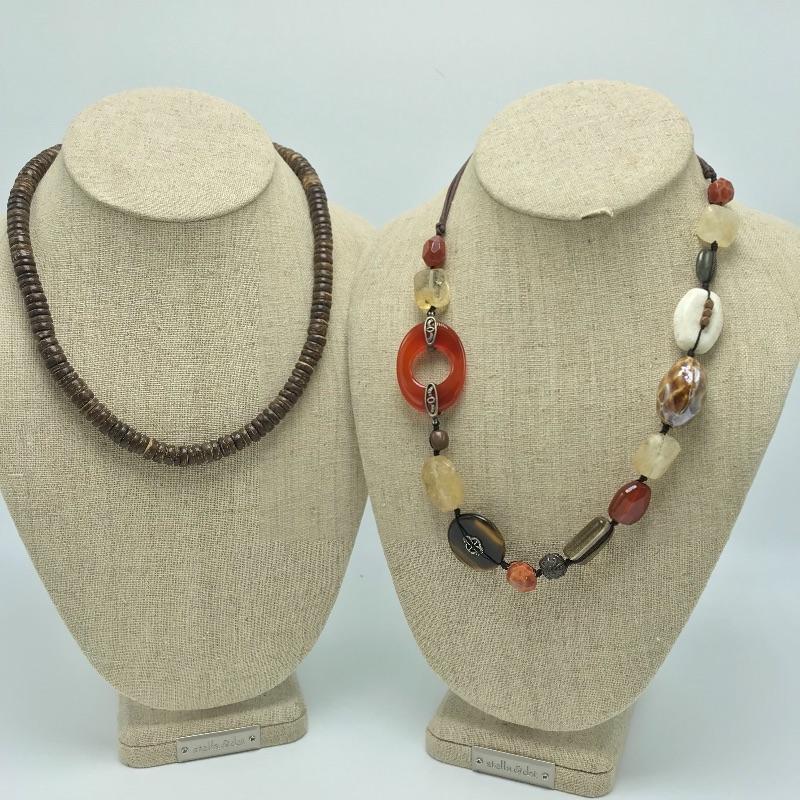 Lovely brown 18” bamboo beaded necklace by Silpada paired with a multifaceted long unique Silpada strand. At 20”, this necklace layers nicely and has sterling, copper, magnesite, ceramic, pyrite, tiger’s eye, glass, and agate. See photos.