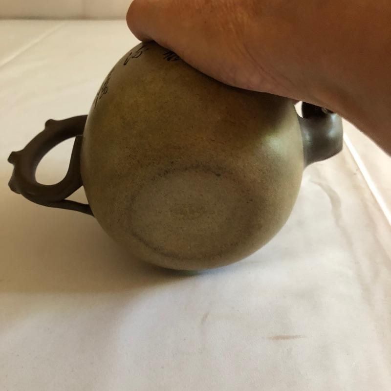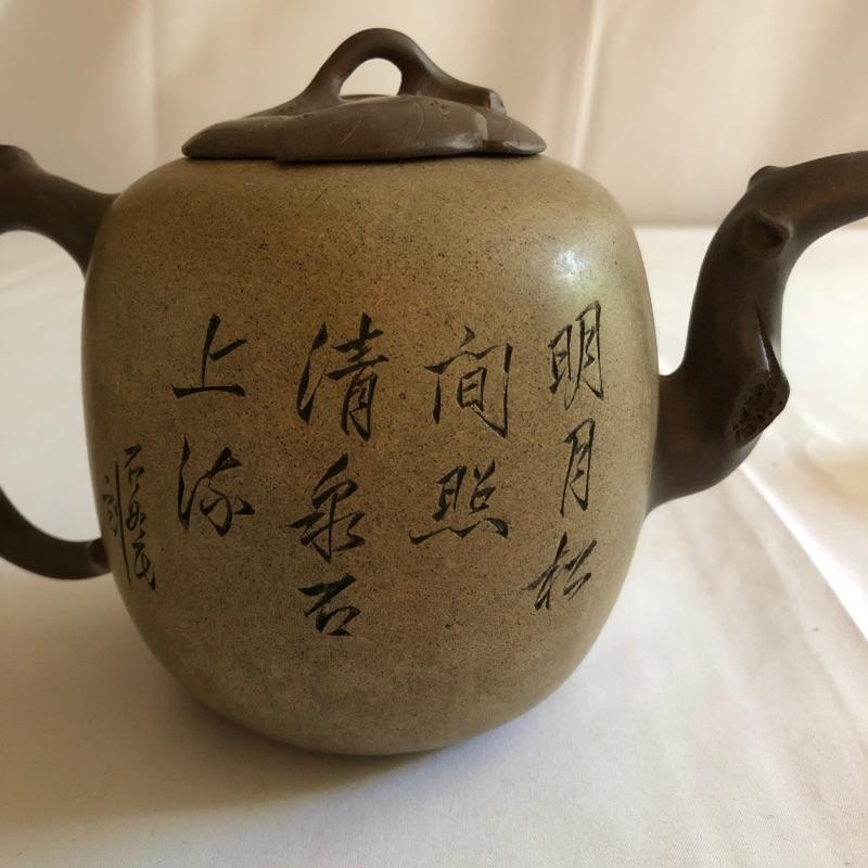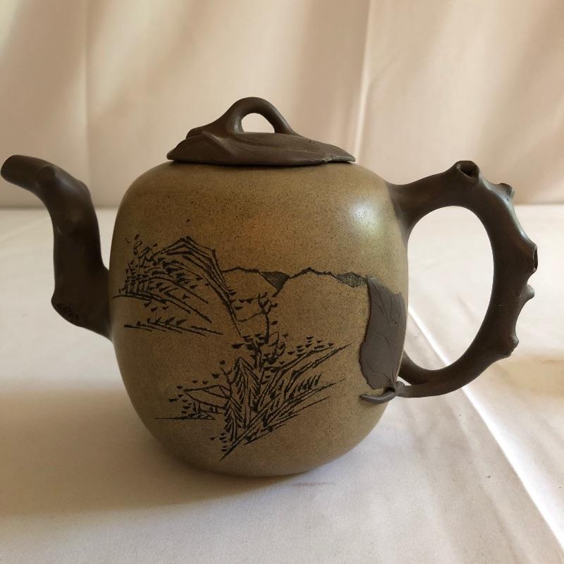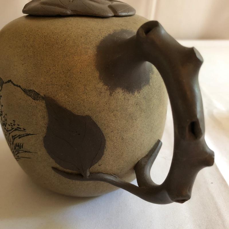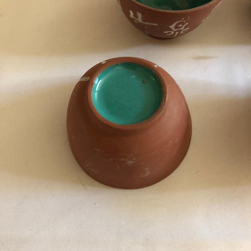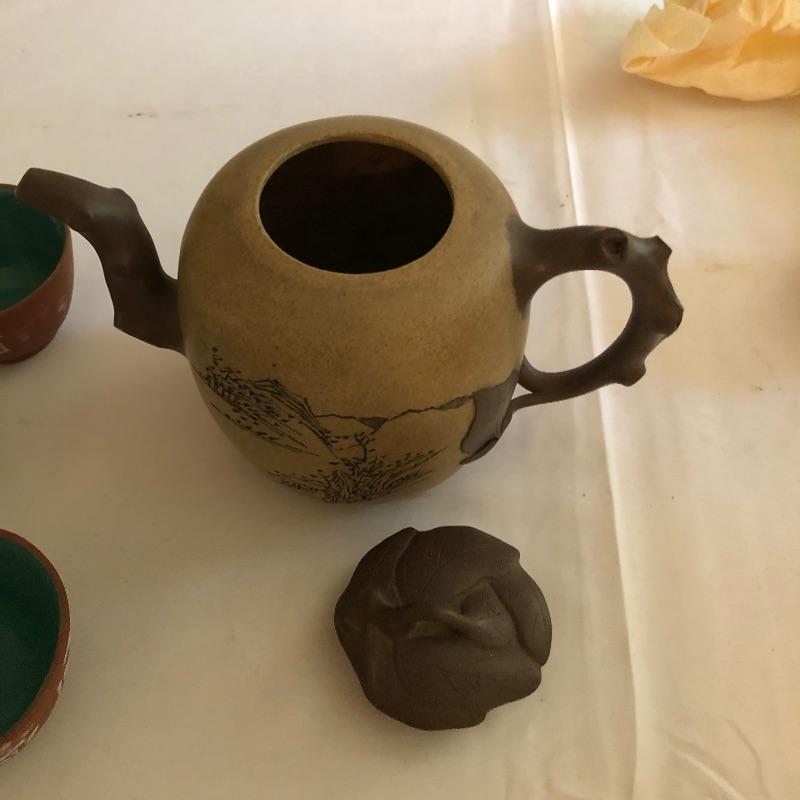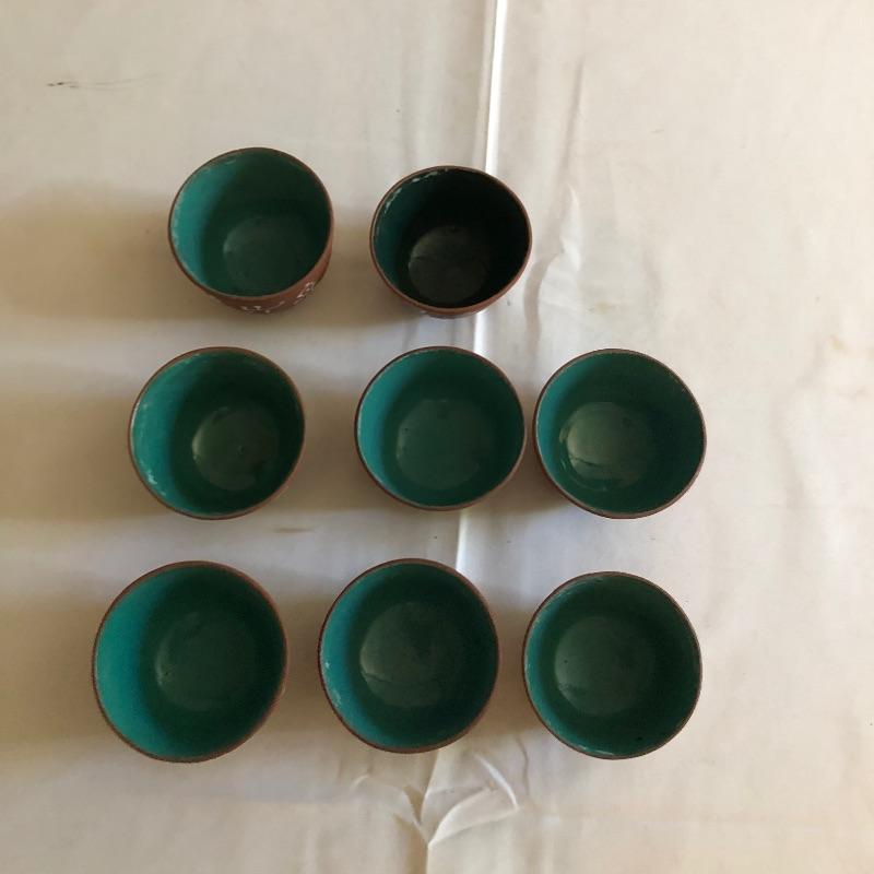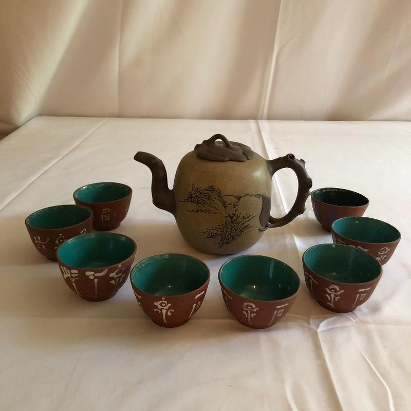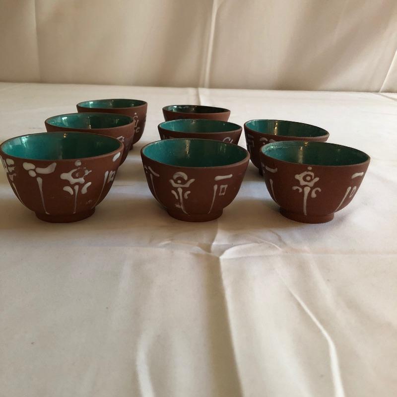 This teapot and eight cups may not be a match set but they look amazing together! The ceramic teapot has intricately carved designs on both sides and a branch like handle and spout. The cups are finely crafted terra cotta clay; 7 of the 8 have a teal colored interior glaze, the 8th cup is a dark green.