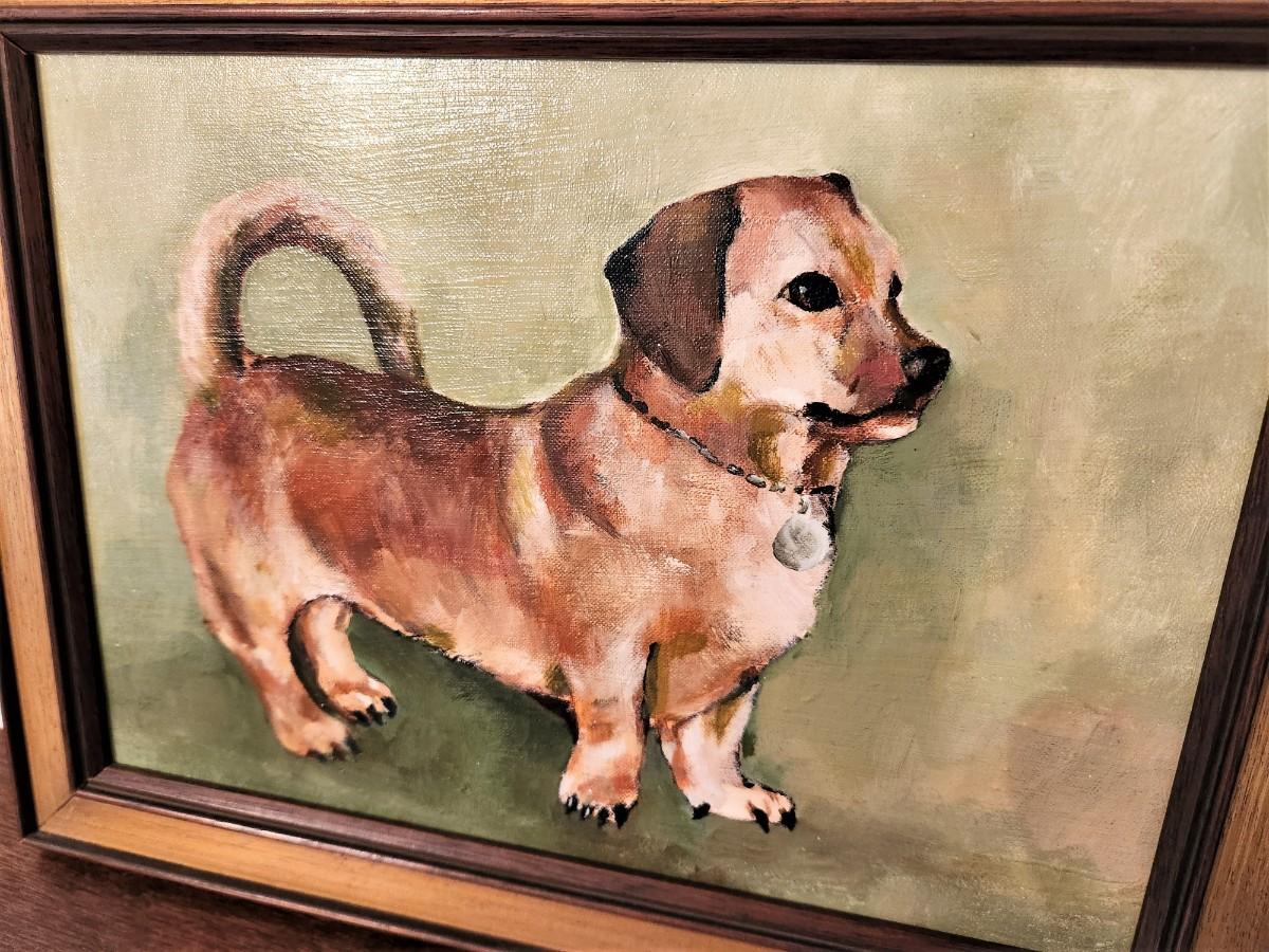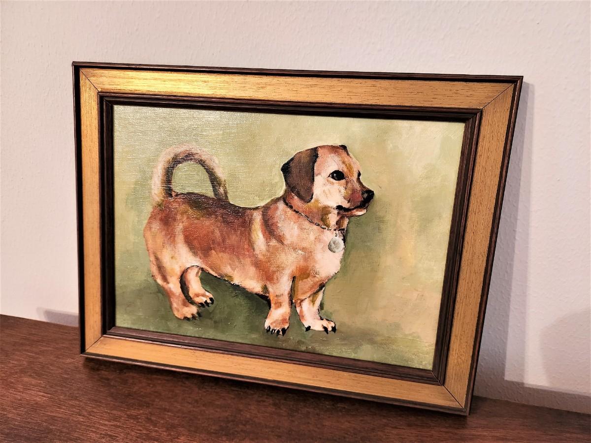 No signature, but super cute original painting of a small dog - no doubt a beloved pet. Acrylic on artist board. 12.5" x 16.5", good condition.