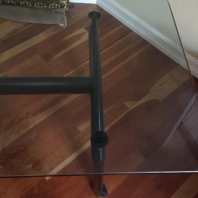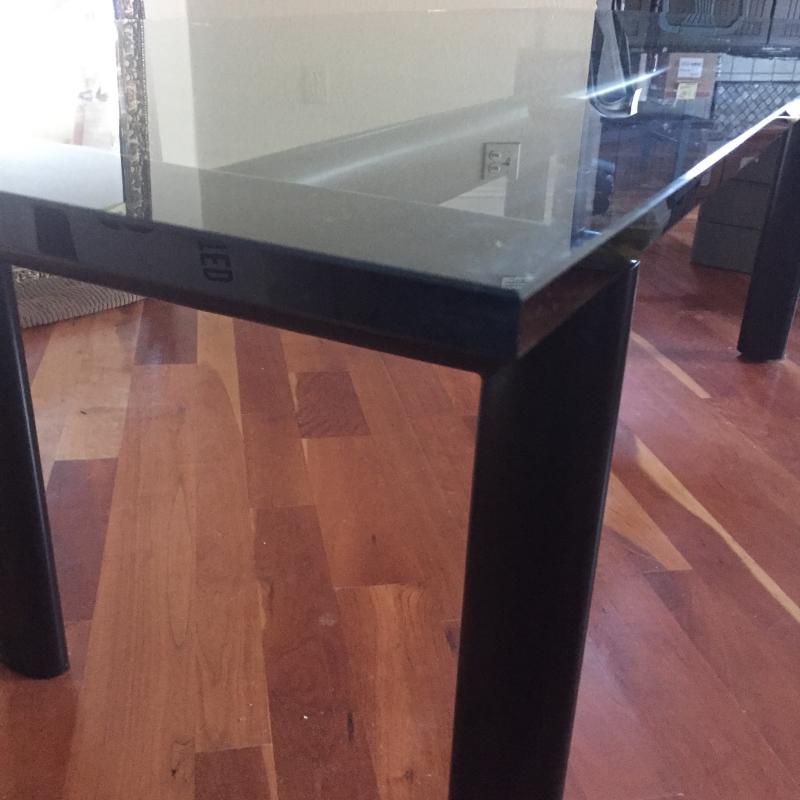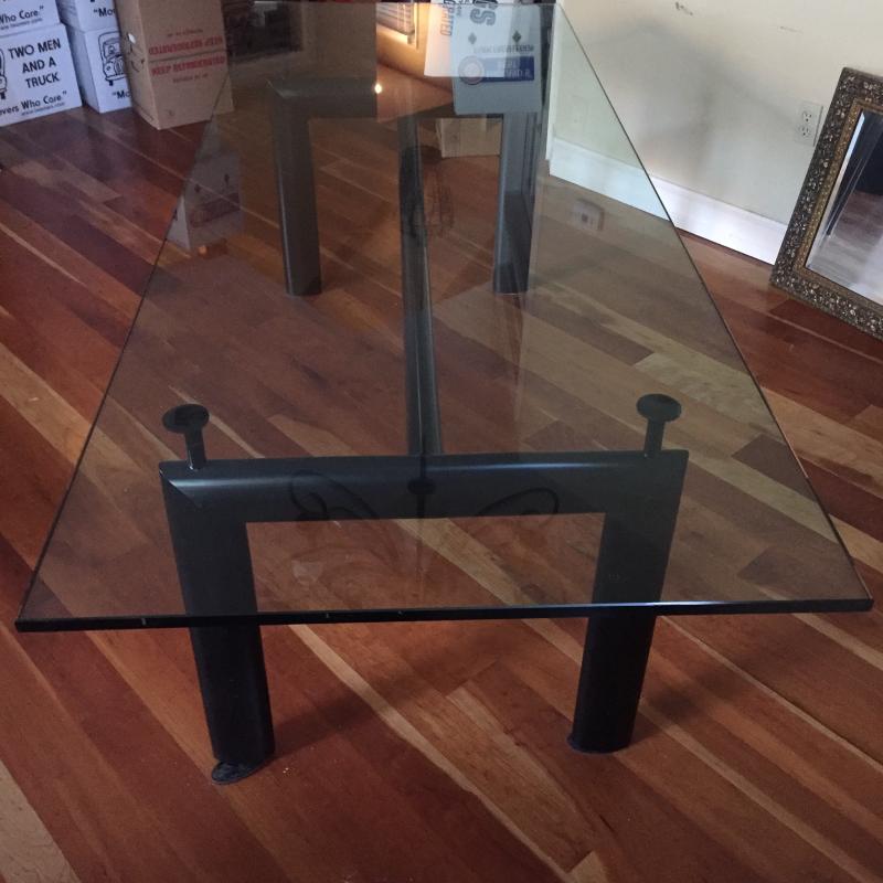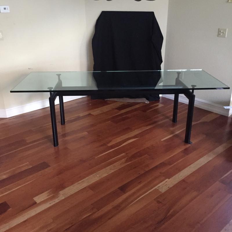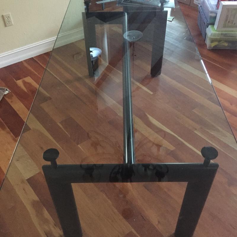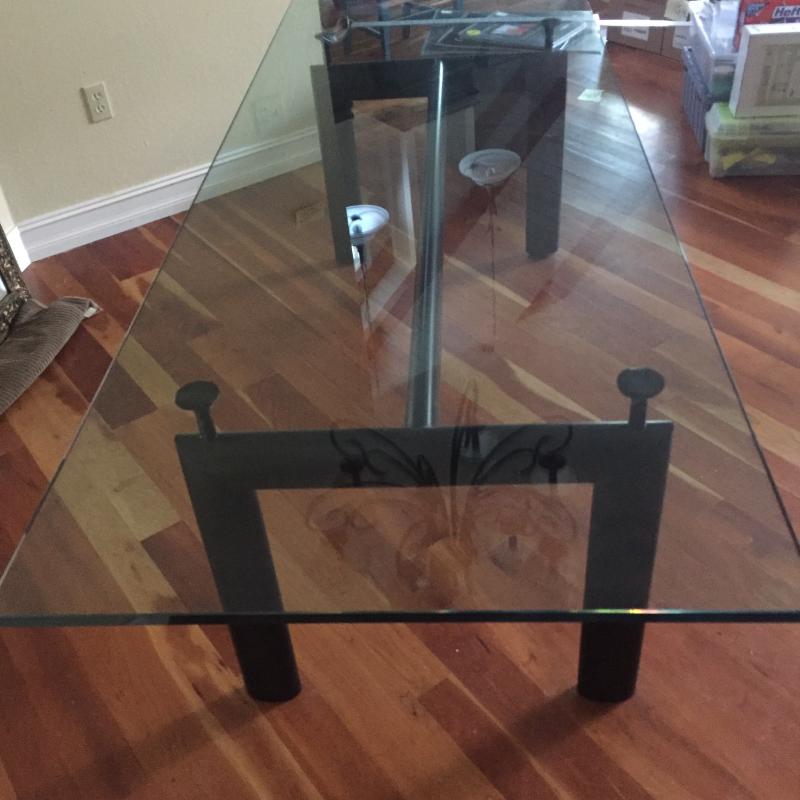 Substantial Glass topped dining room table. You can fit a lot of family around this beauty. Table measures 33.5” x 90” x 28”. Glass is .75” thick.