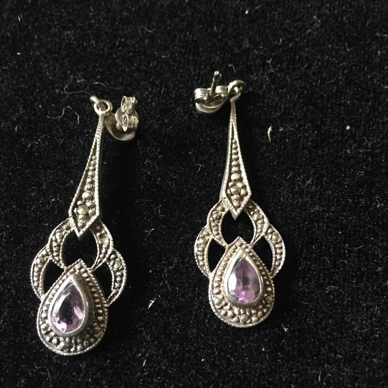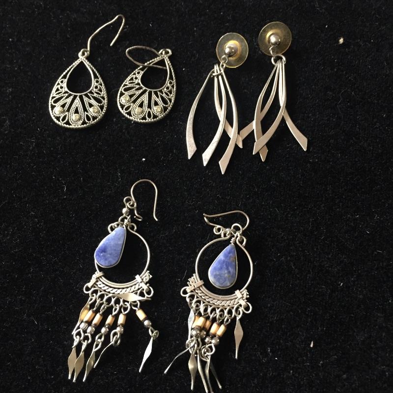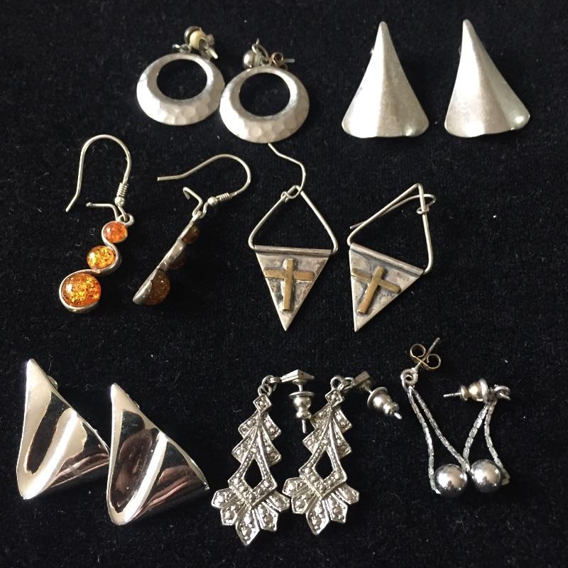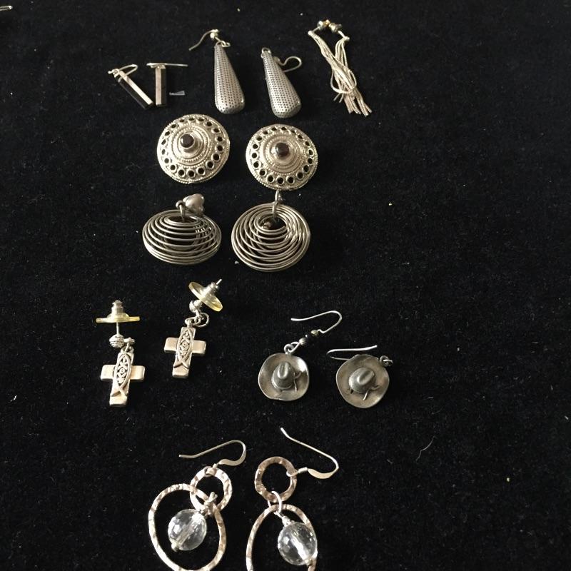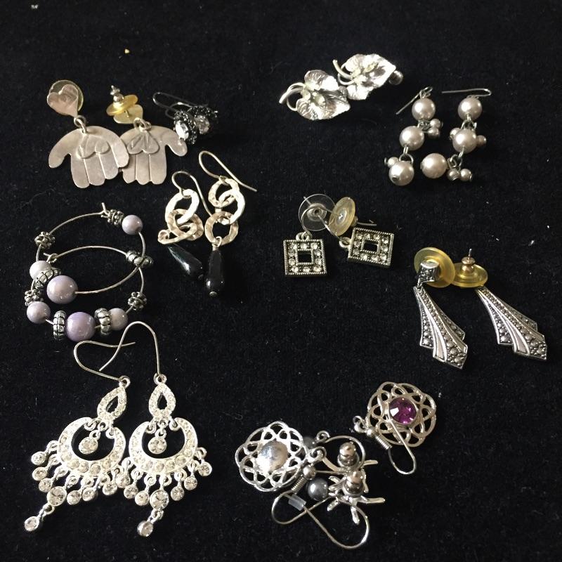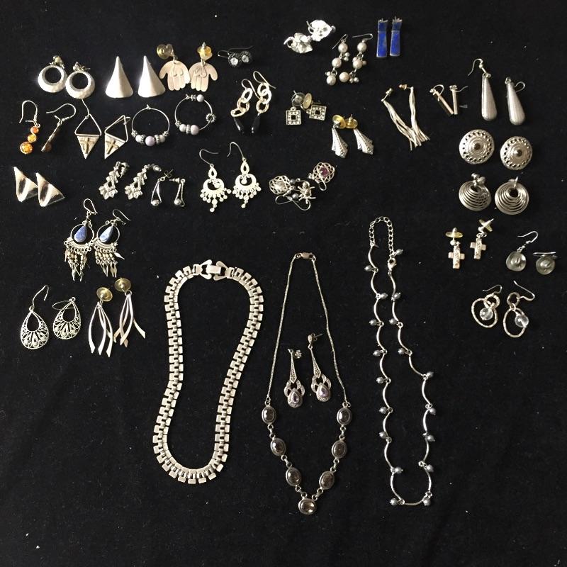 Large array of earrings in lots of shapes and sizes and four necklaces.