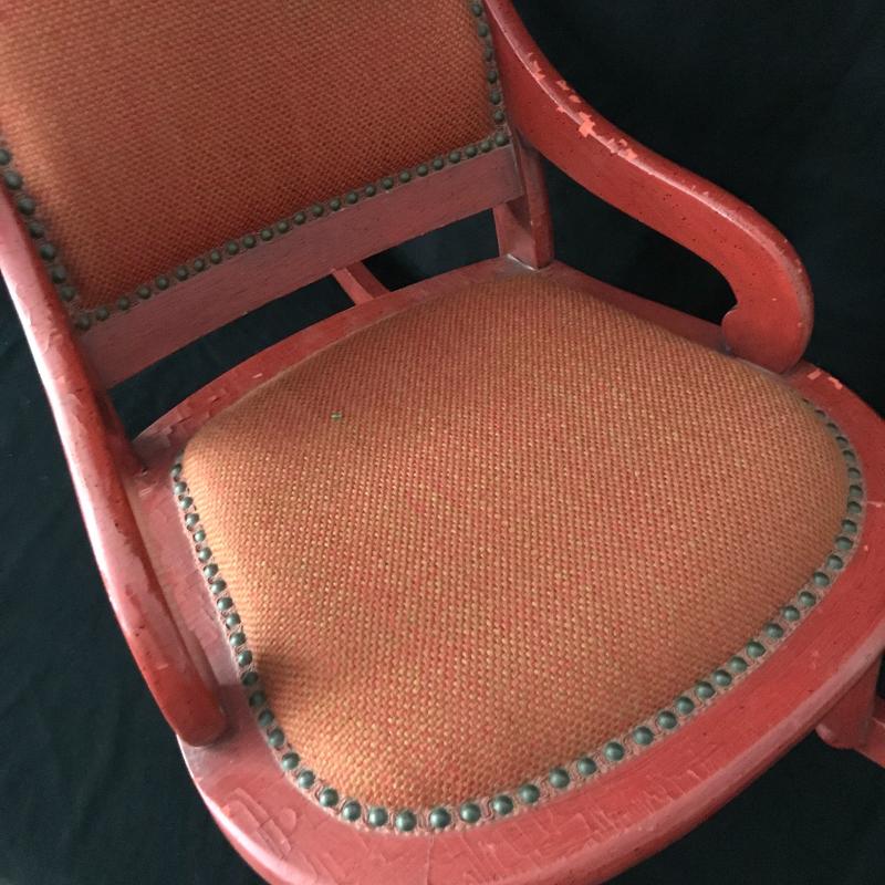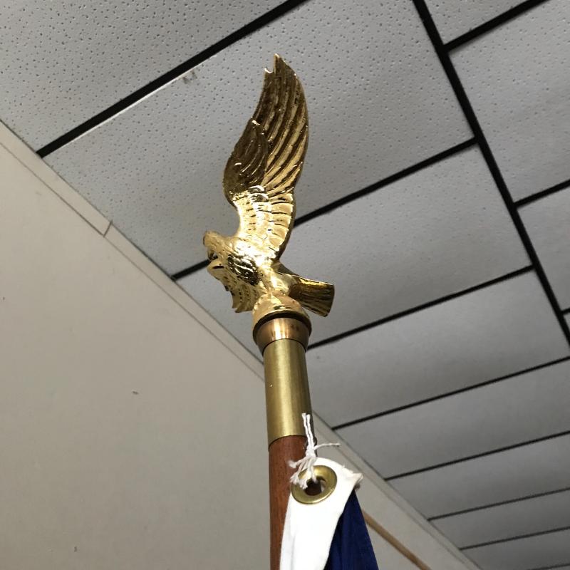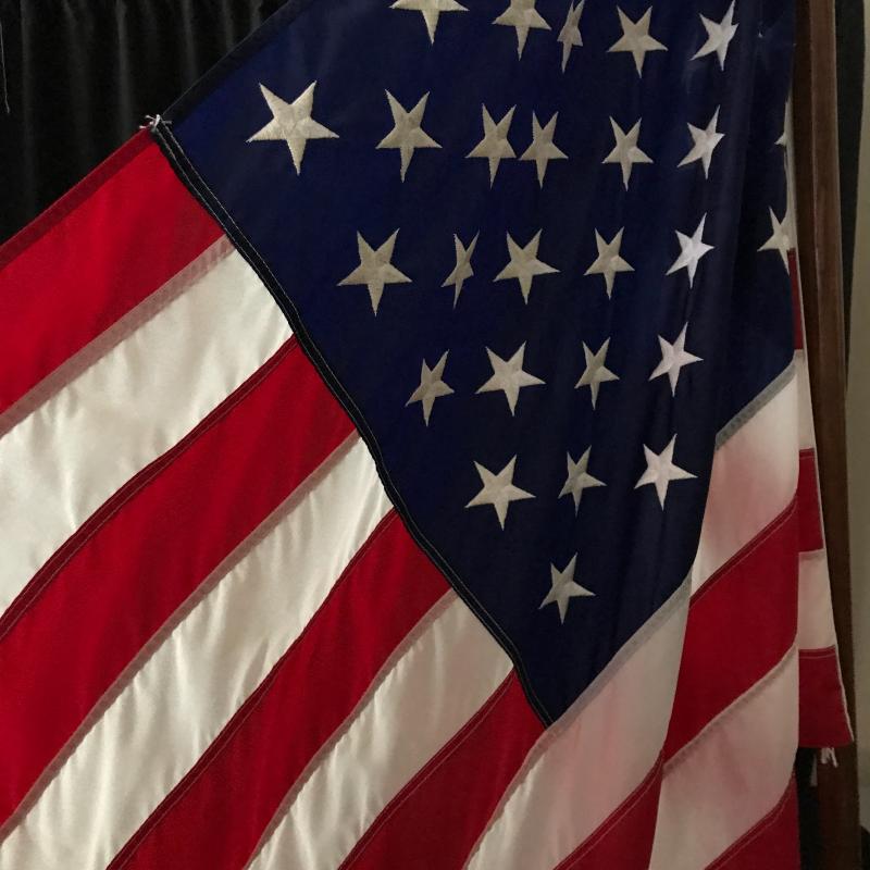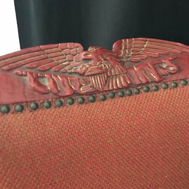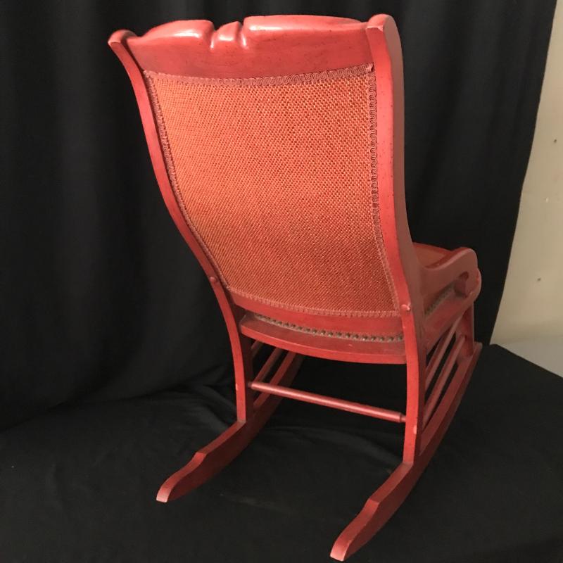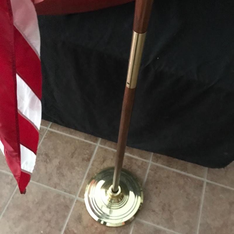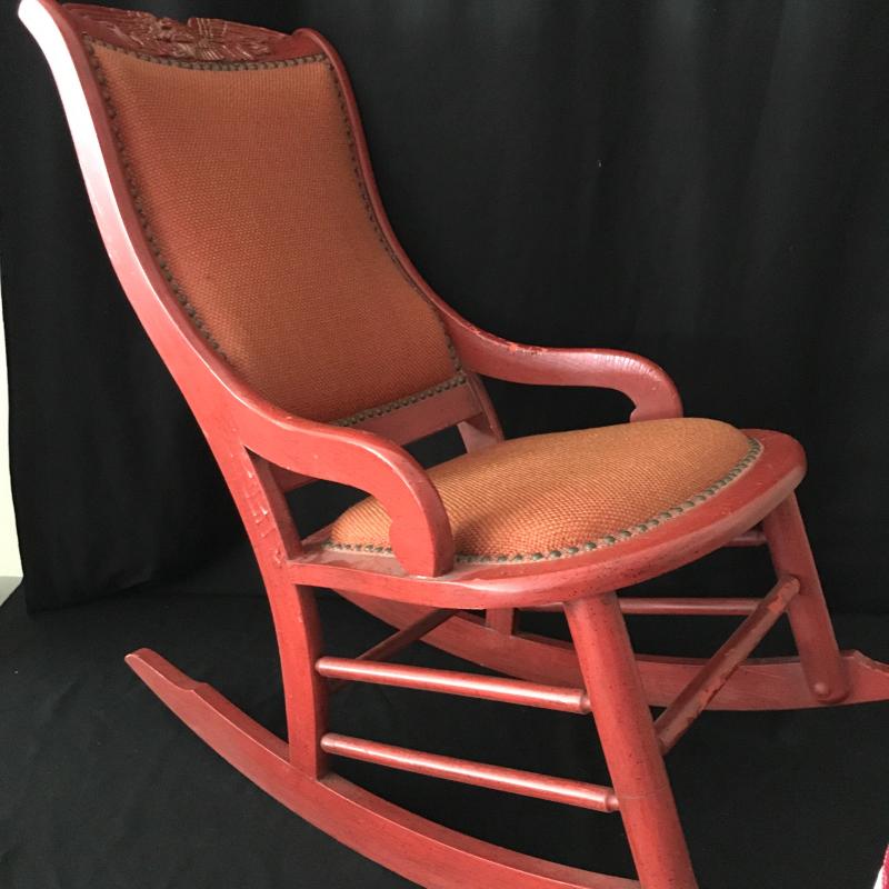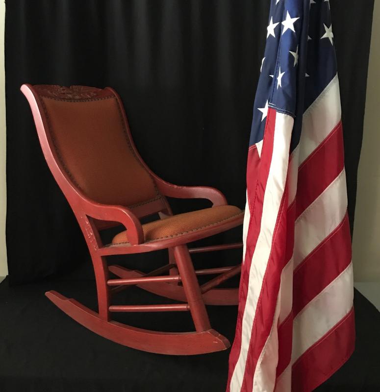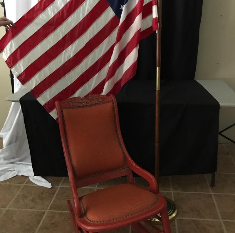 Red rocking chair has eagle embossed on top back rest. Tweed and button fabric. Measures 32” x 16” x 33”h. Flag itself measures 60” x 34”. Flag stand is 95”h with 12”d base. No shipping. Local pick up only in Maggie Valley.