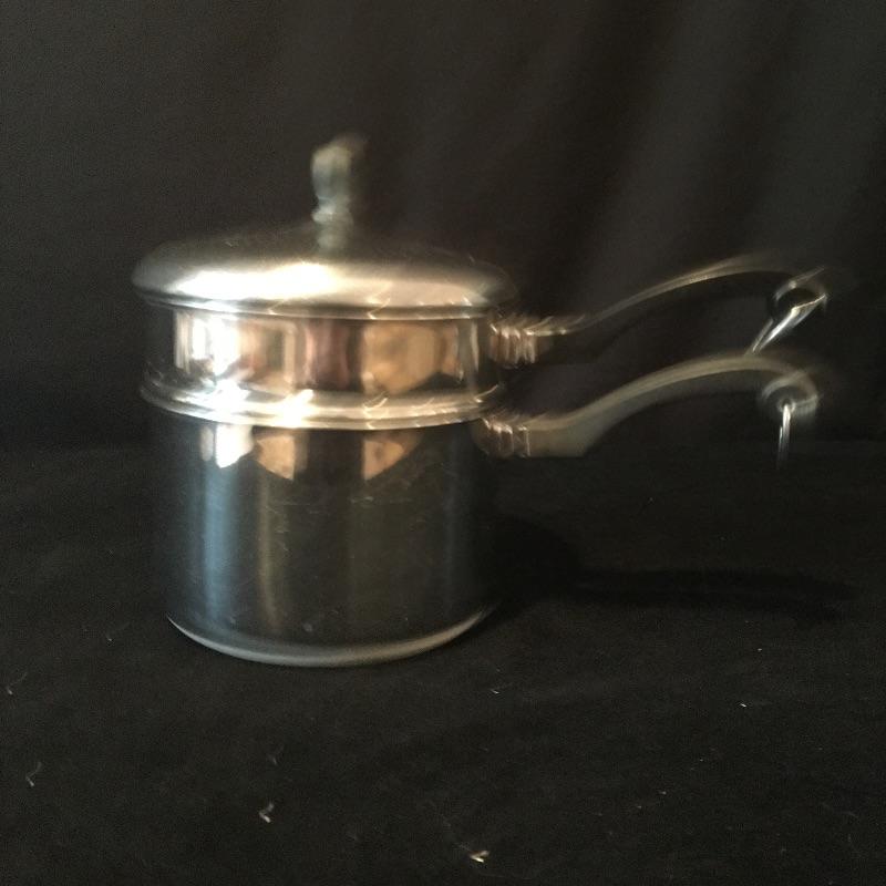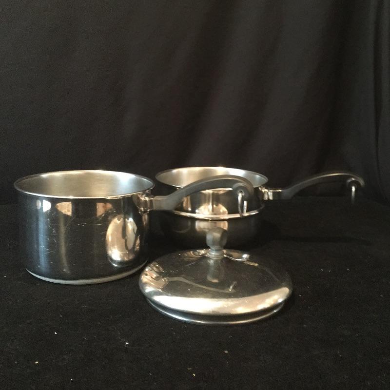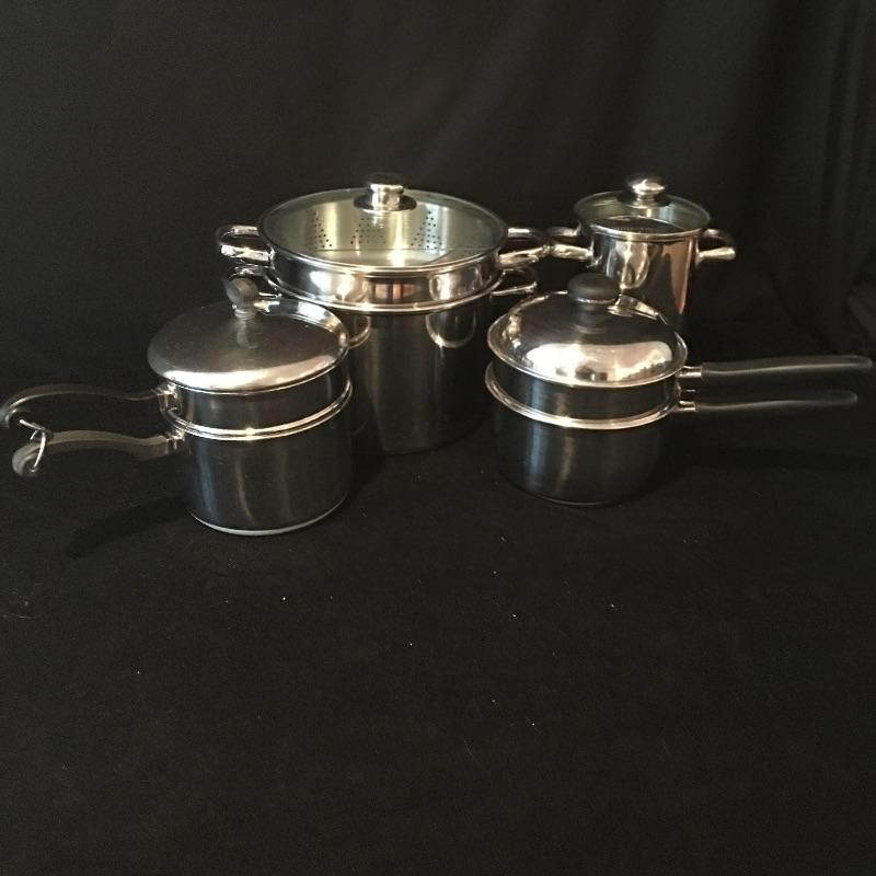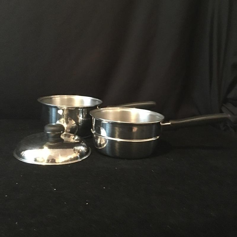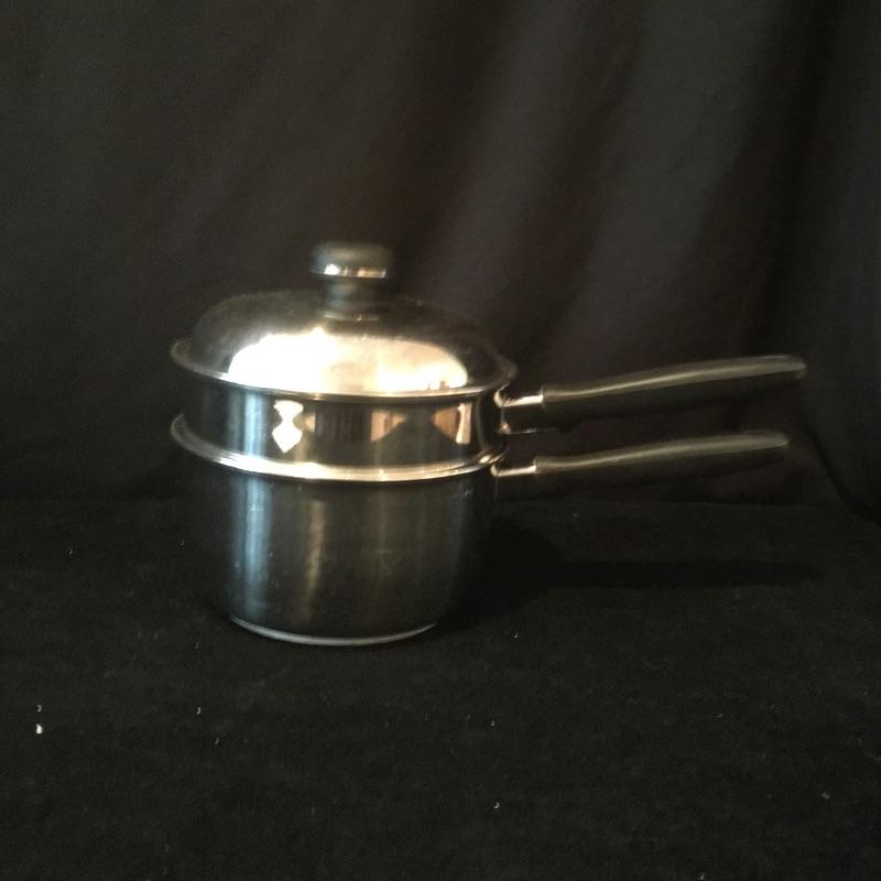 Four double boilers. One is Farberware, one is Endurance and the other two are unmarked. Largest double boiler measures 10”D x 9”.