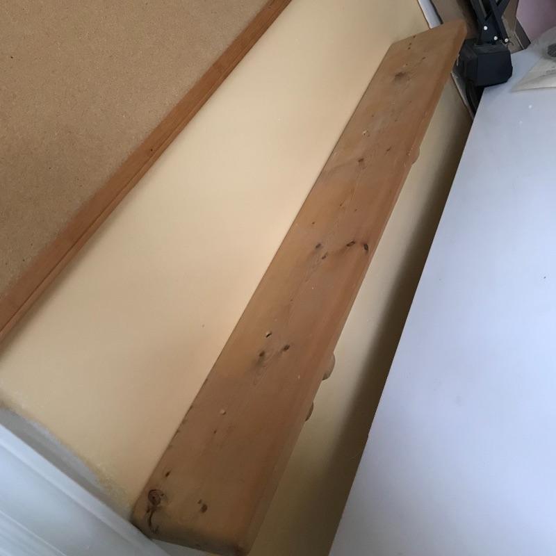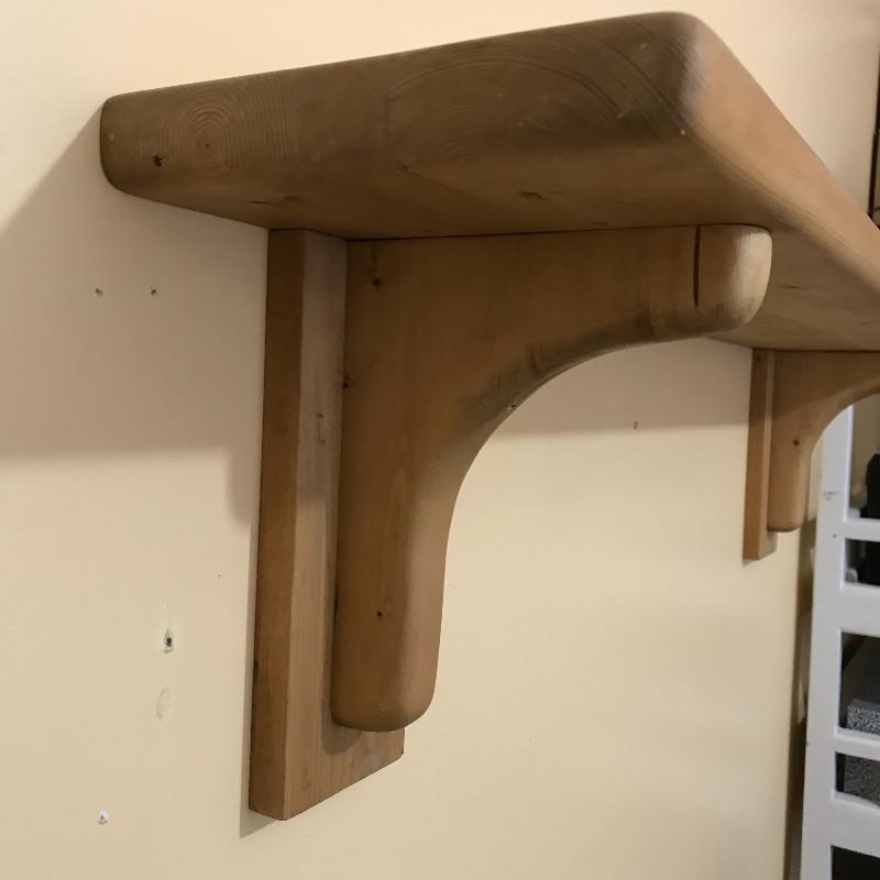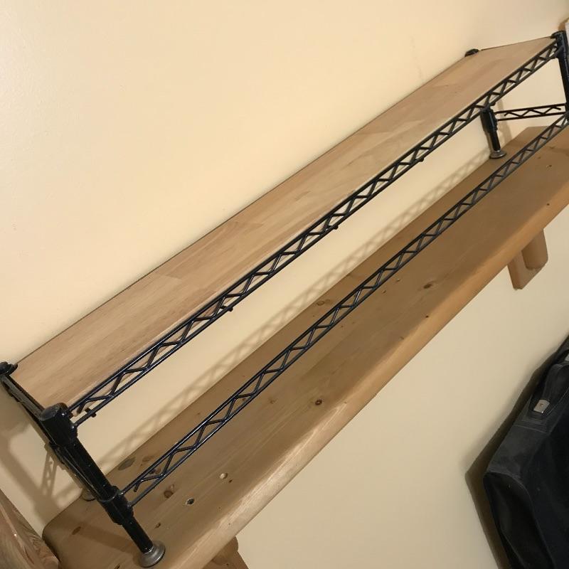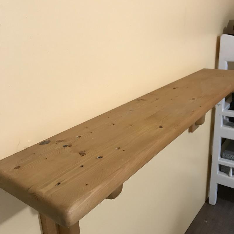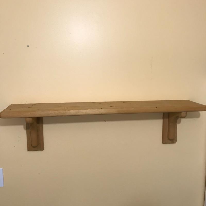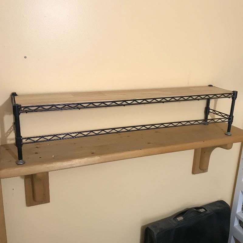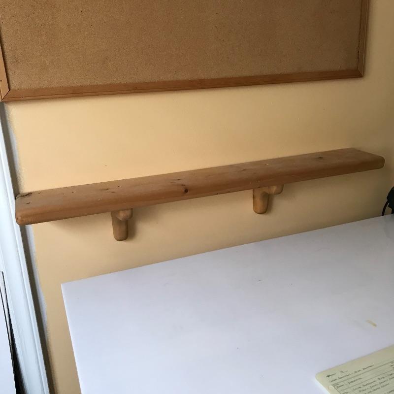 Three matching, well built wall shelves. The longest shelf is photographed above a window and measures approximately 74.5” x 8” x 10.5”. The shelf laying vertically on a wall is 72” long and the smaller wood shelf on the wall under the metal shelf is approximately 41.5” long. The final shelf is the smallest one photographed under a cork board with approximate dimensions of 35.5” x 5.25” x 5.75” These four shelves are accompanied by a metal desk shelf with wooden insert measuring approximately 34” x 6.75” x 7.5”. The metal appears to be adjustable. No shipping.