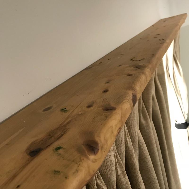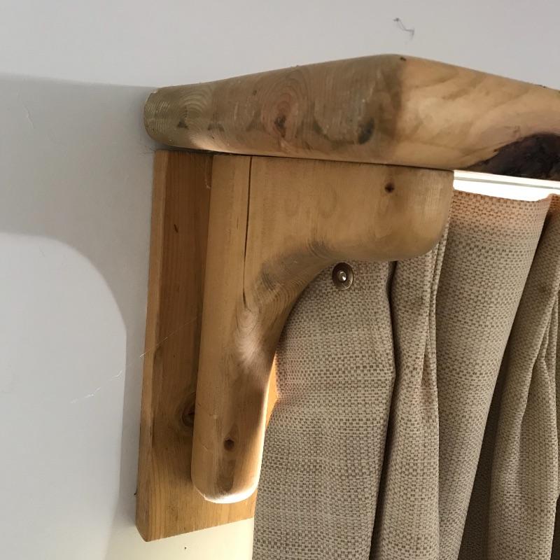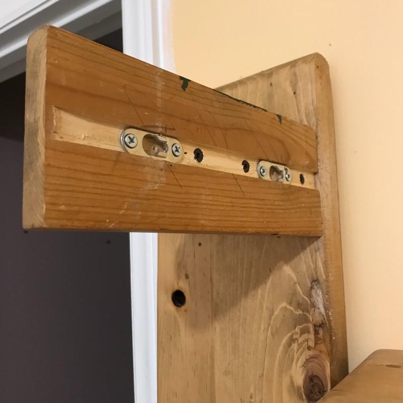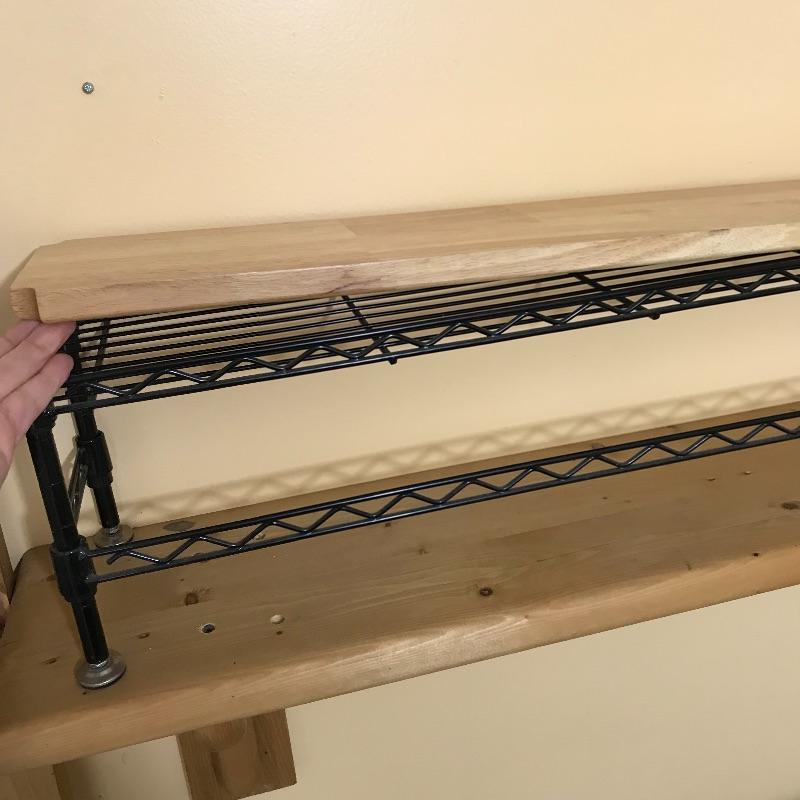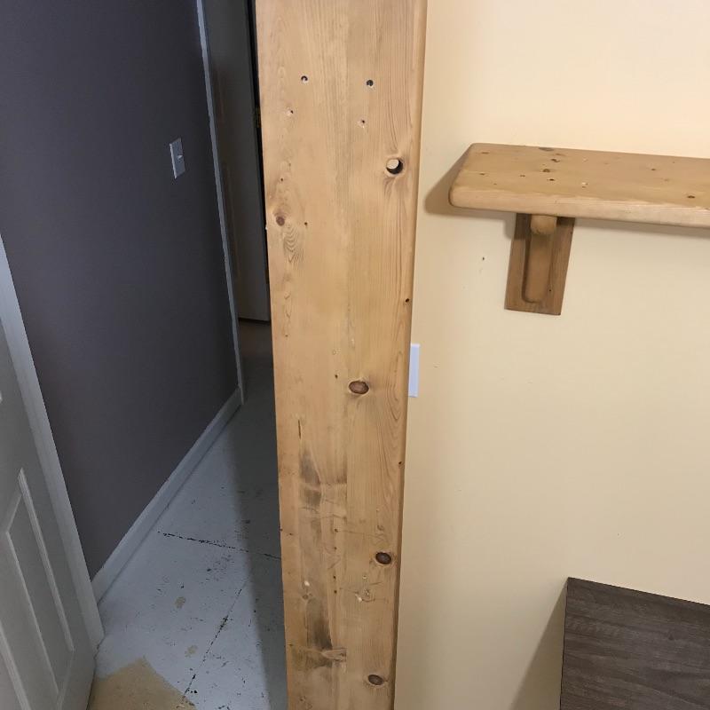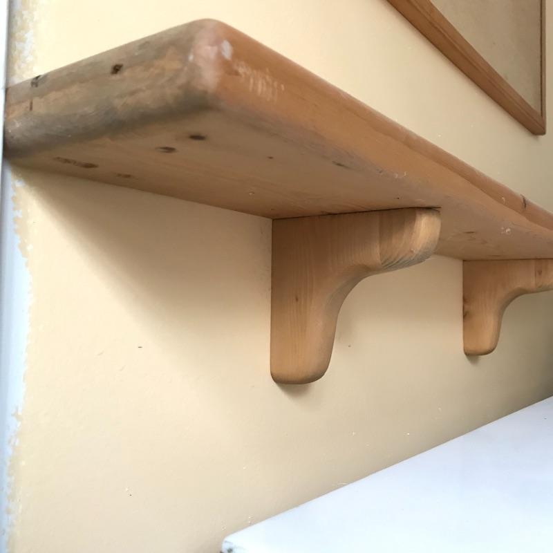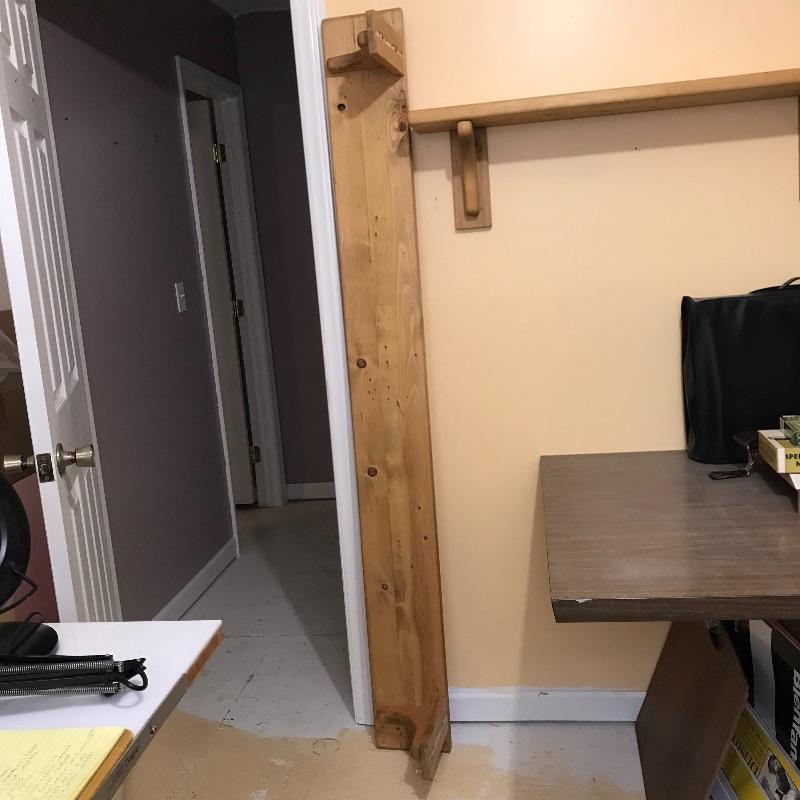 Three matching, well built wall shelves. The longest shelf is photographed above a window and measures approximately 74.5” x 8” x 10.5”. The shelf laying vertically on a wall is 72” long and the smaller wood shelf on the wall under the metal shelf is approximately 41.5” long. The final shelf is the smallest one photographed under a cork board with approximate dimensions of 35.5” x 5.25” x 5.75” These four shelves are accompanied by a metal desk shelf with wooden insert measuring approximately 34” x 6.75” x 7.5”. The metal appears to be adjustable. No shipping.