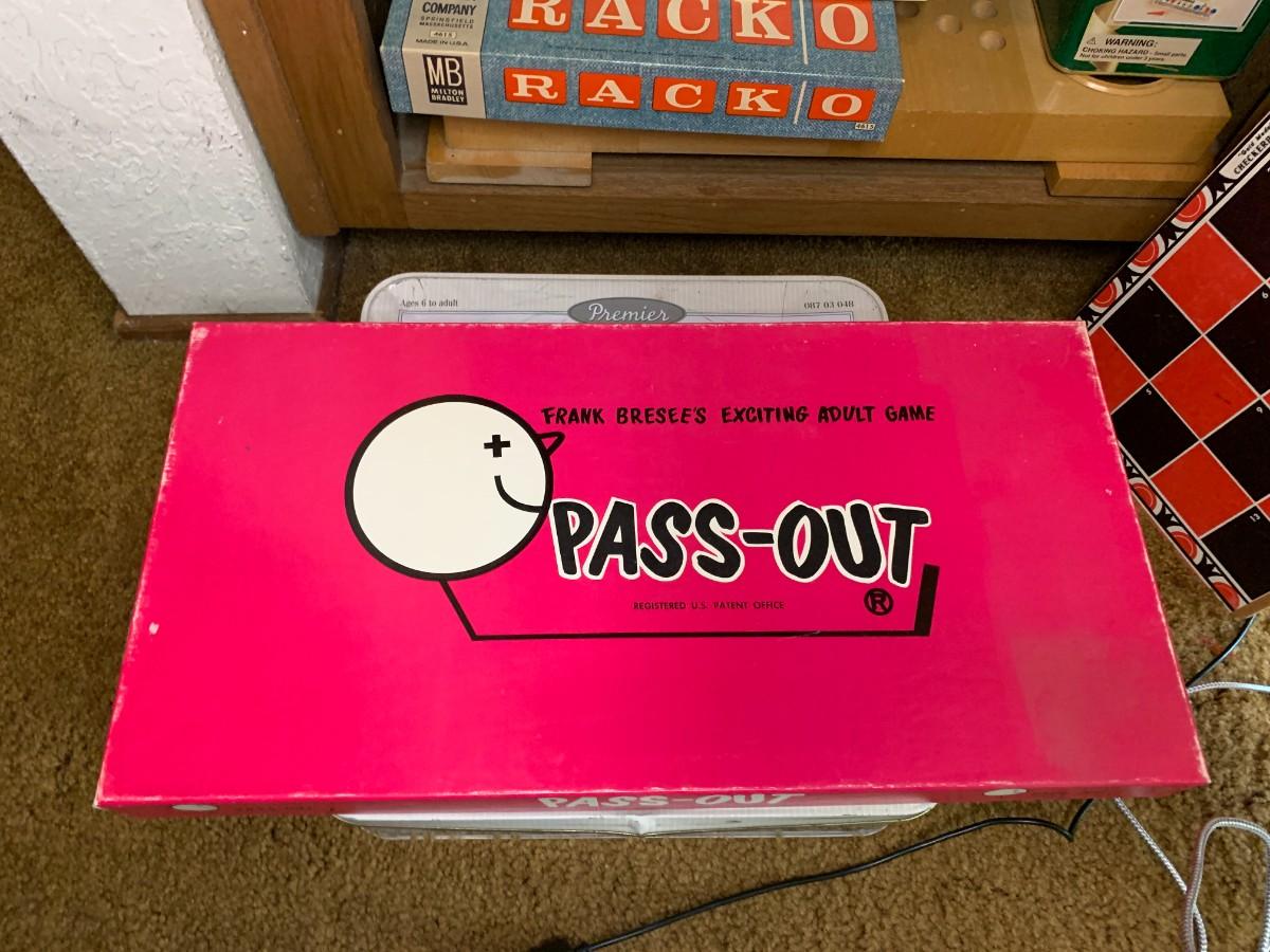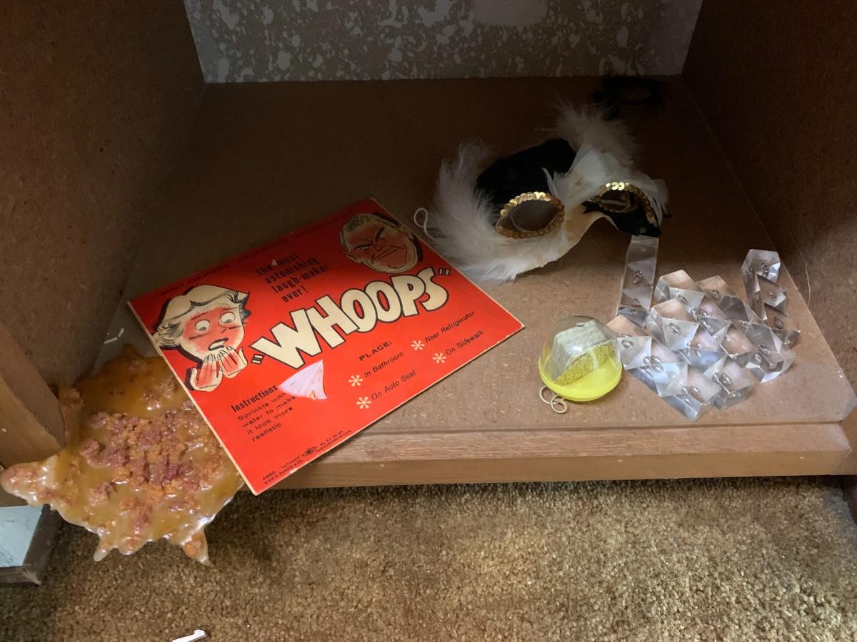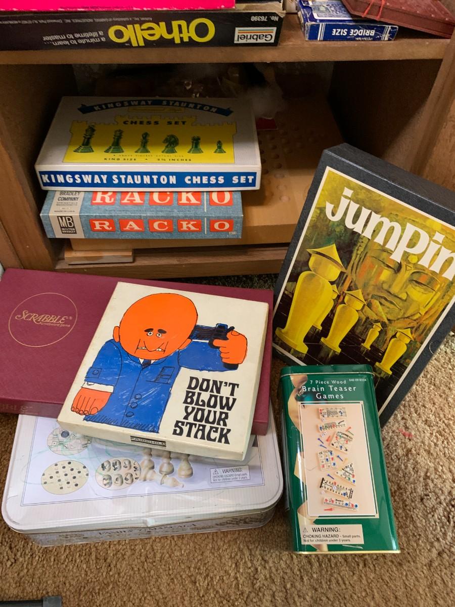 Board games, cards and fun! Not checked for pieces. Vintage Racko and Pass-Out games, and more. Wood chinese checkers board. Novelty vintage fake vomit (!) and feathered mask. Several decks of cards and more games as shown.