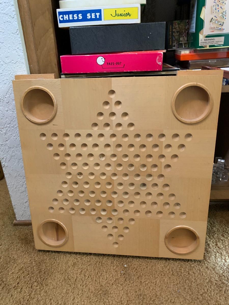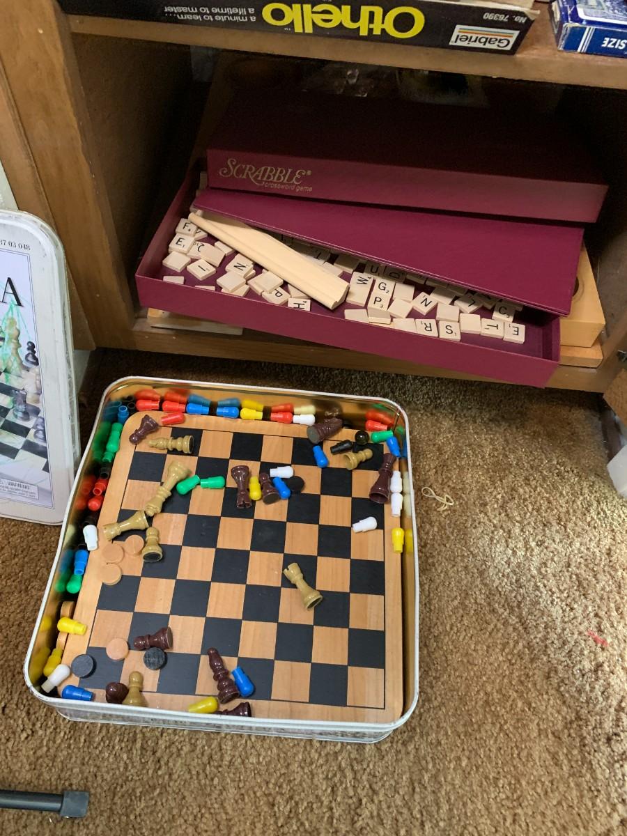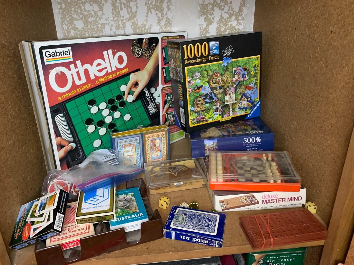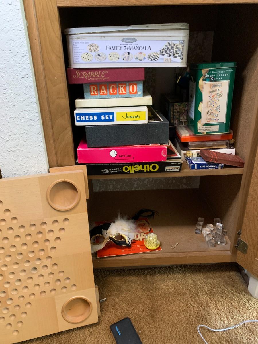 Board games, cards and fun! Not checked for pieces. Vintage Racko and Pass-Out games, and more. Wood chinese checkers board. Novelty vintage fake vomit (!) and feathered mask. Several decks of cards and more games as shown.