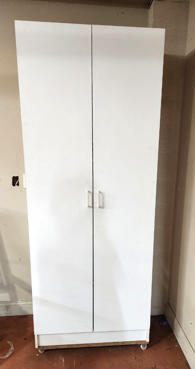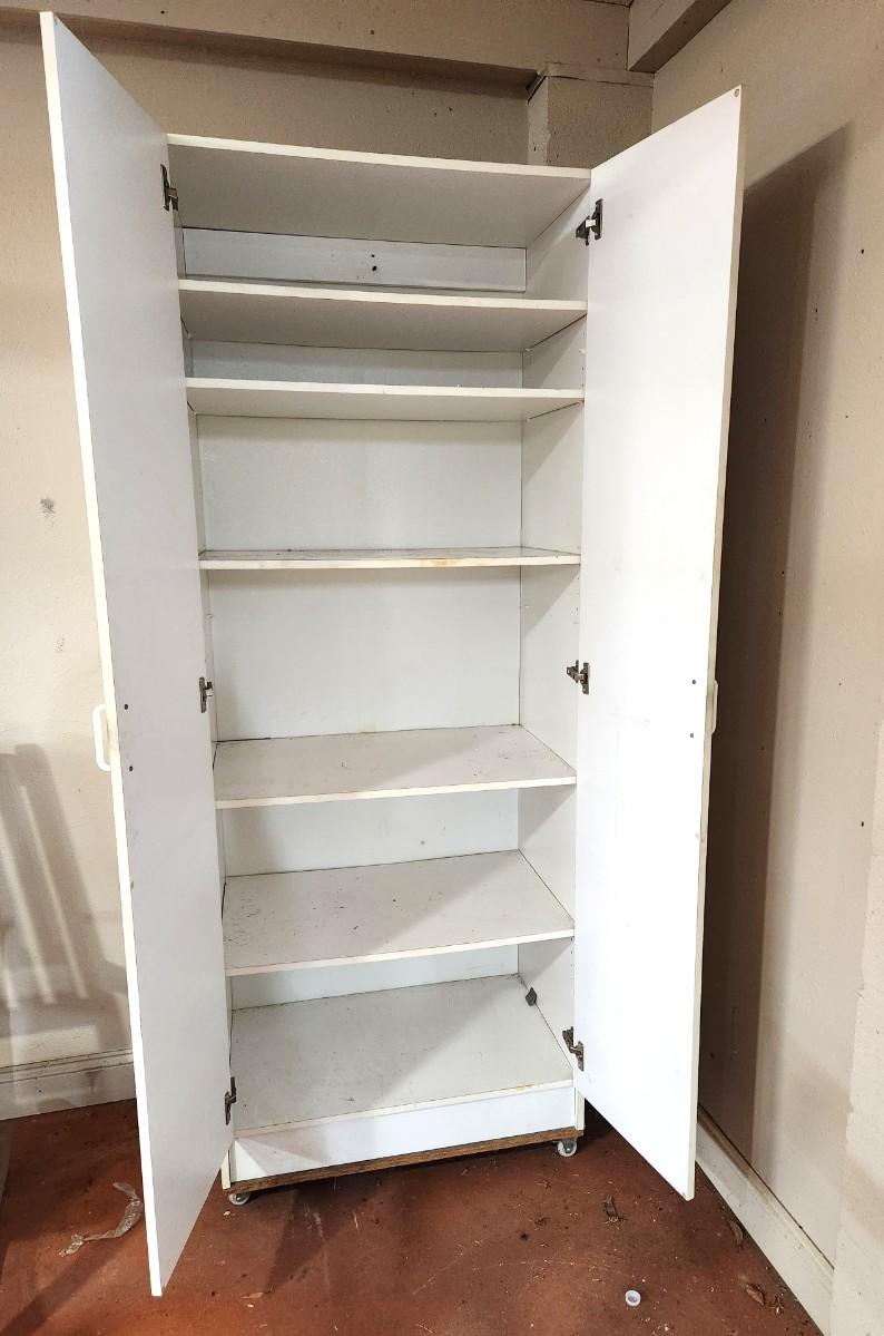 Garage/Pantry White storage cabinet on wheels. adjustable shelves, 82" tall, 32" across. Used condition.