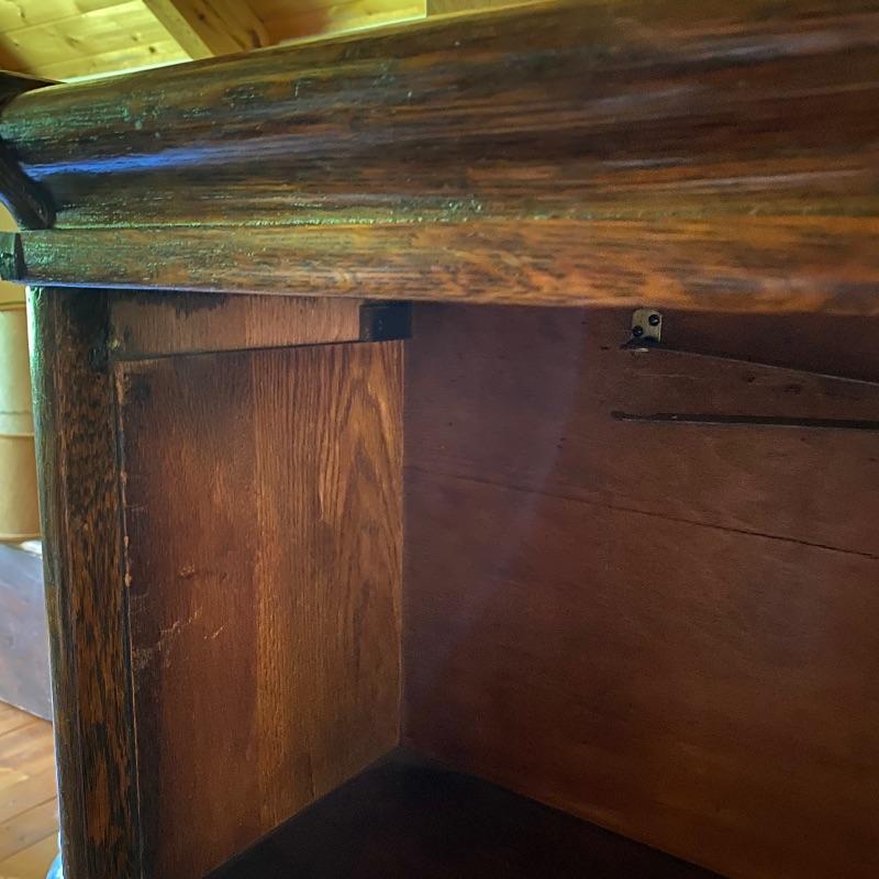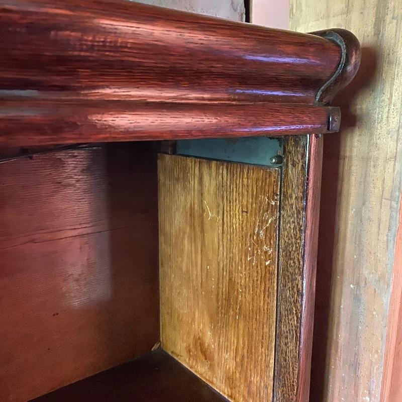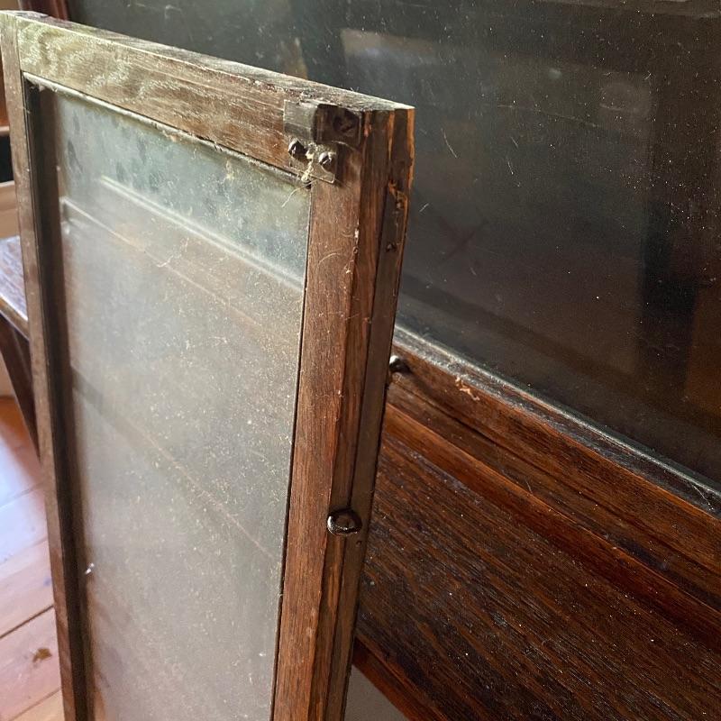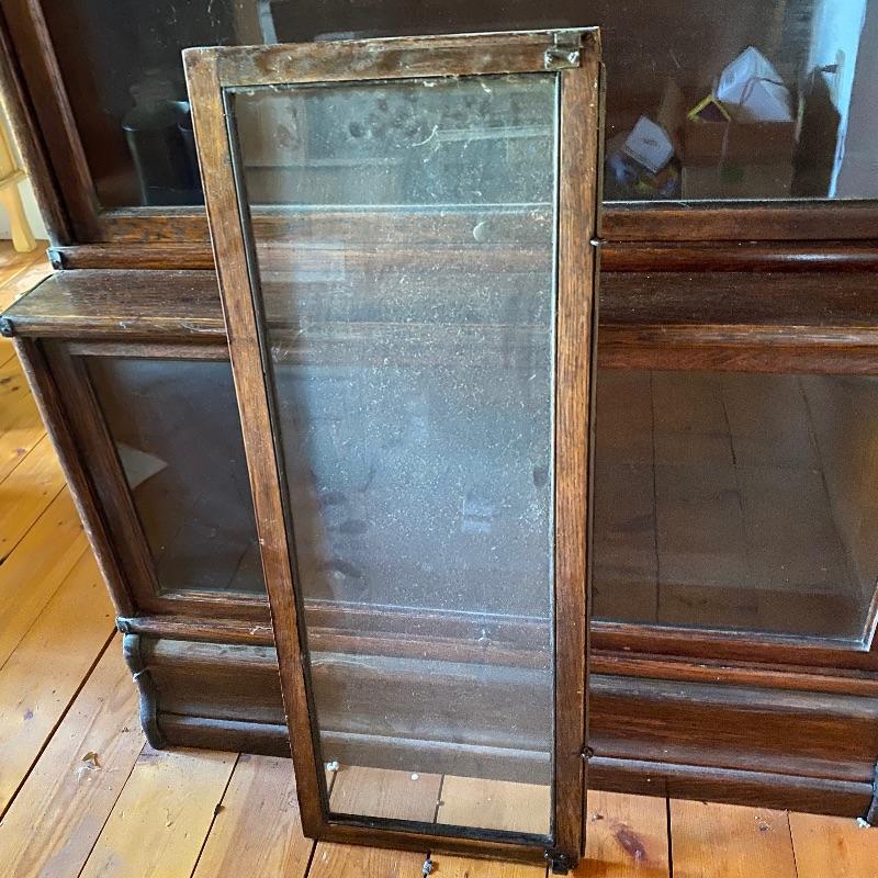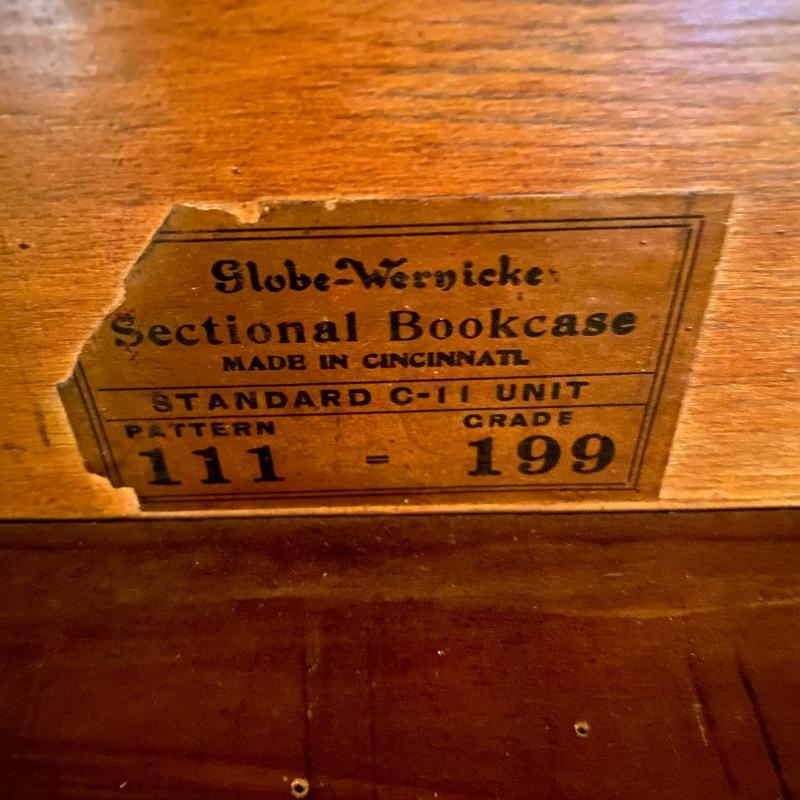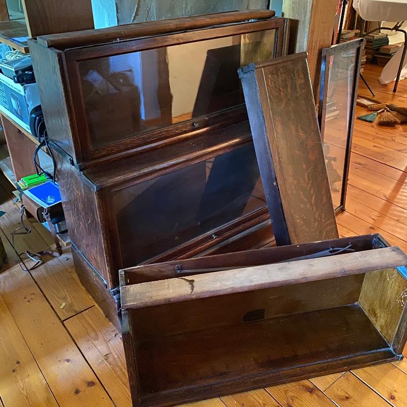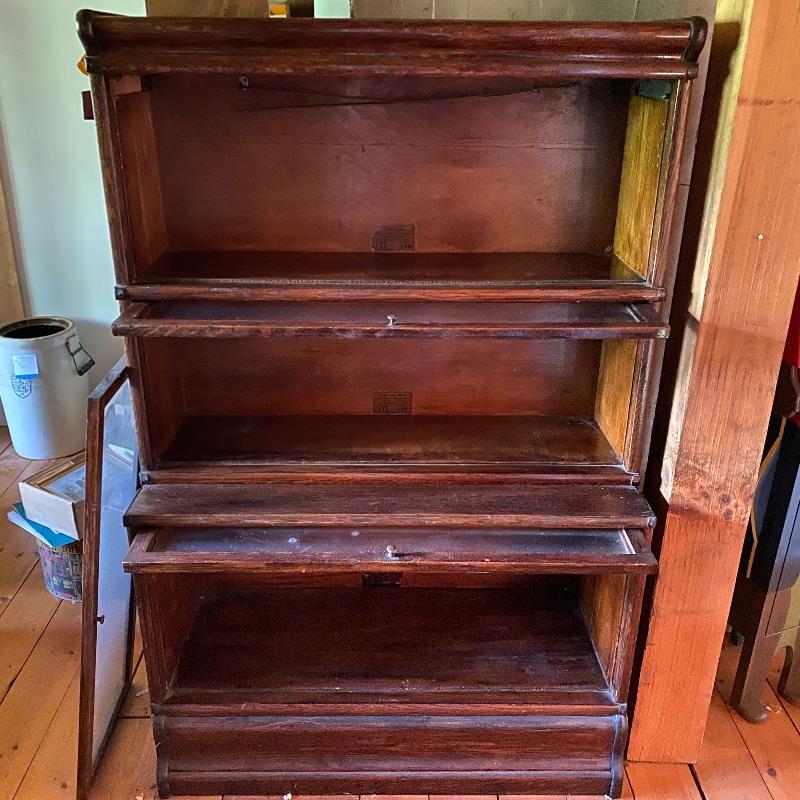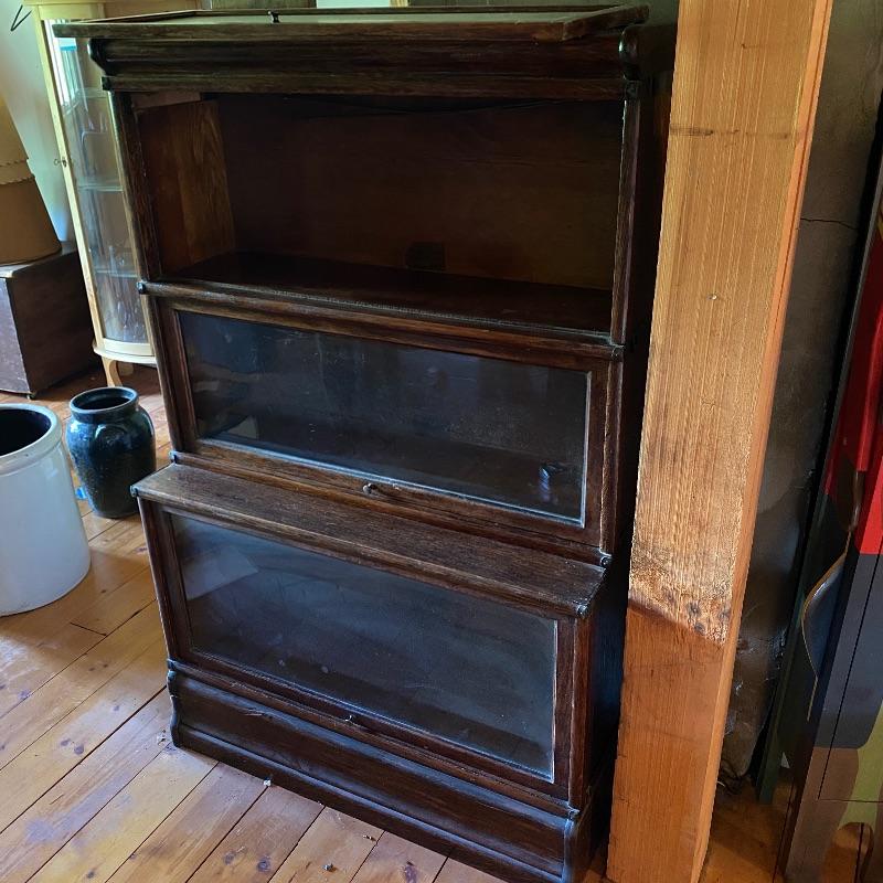 Three shelf bookcase with glass front. Two doors on this lawyer’s bookcase slide out and open and close easily. One door is not attached but could be fixed as glass is still intact. It seems to be missing one side of the track on the inside of the shelf. See pix. Manufacturer sticker is easily seen on back wall of each shelf. Unit Comes apart in fivesections so you can add to it or make it shorter. Easy to move. The bottom piece is a bit wider than the rest and creates a small ledge. There is no hidden drawer at the bottom. Measures 34” x 15” x 53” as configured in photos as one unit. No shipping