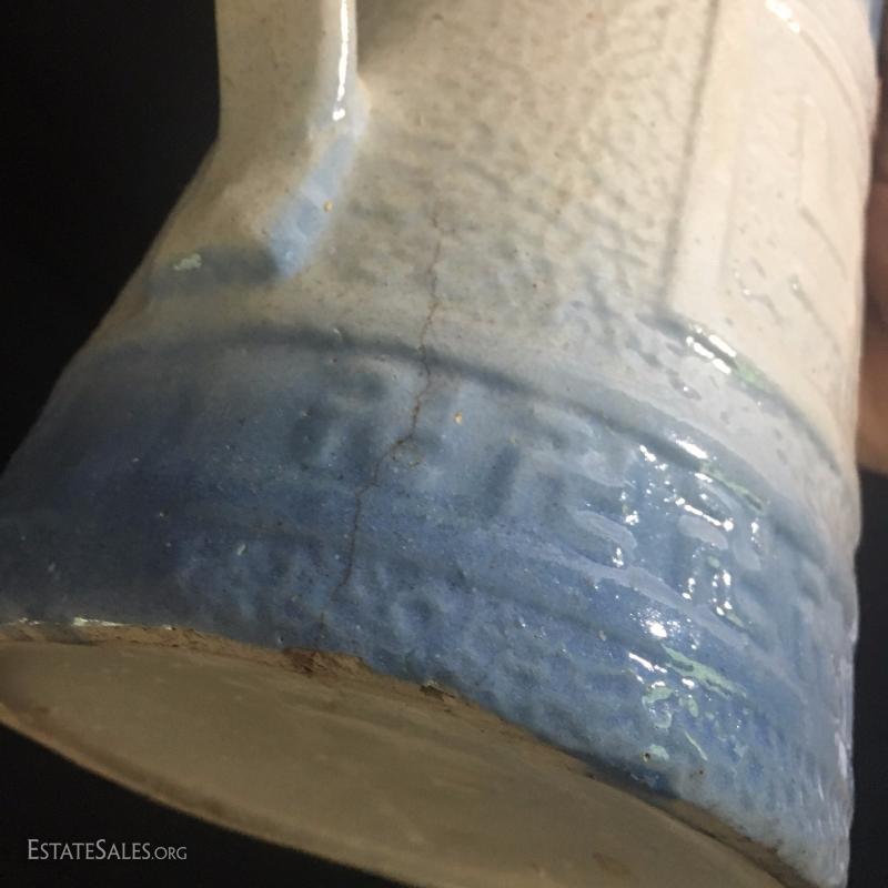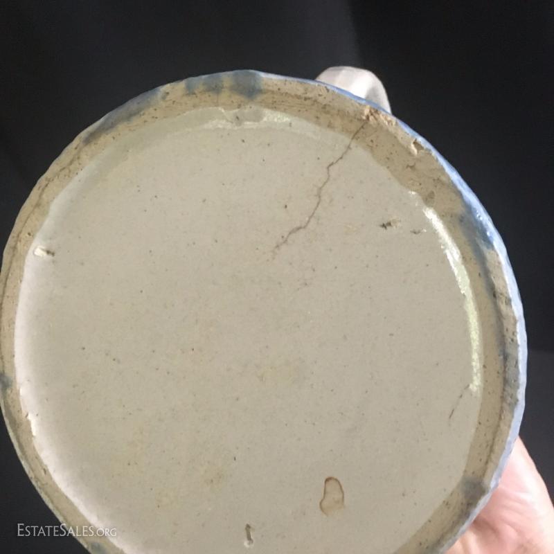 Good Luck McCoy Swastika Pitcher. 8"wide at handle. 8.5" tall. Blue and grey color. A couple small chips at top.