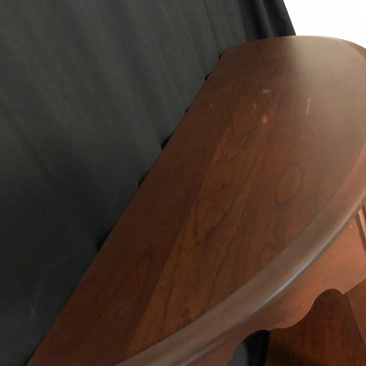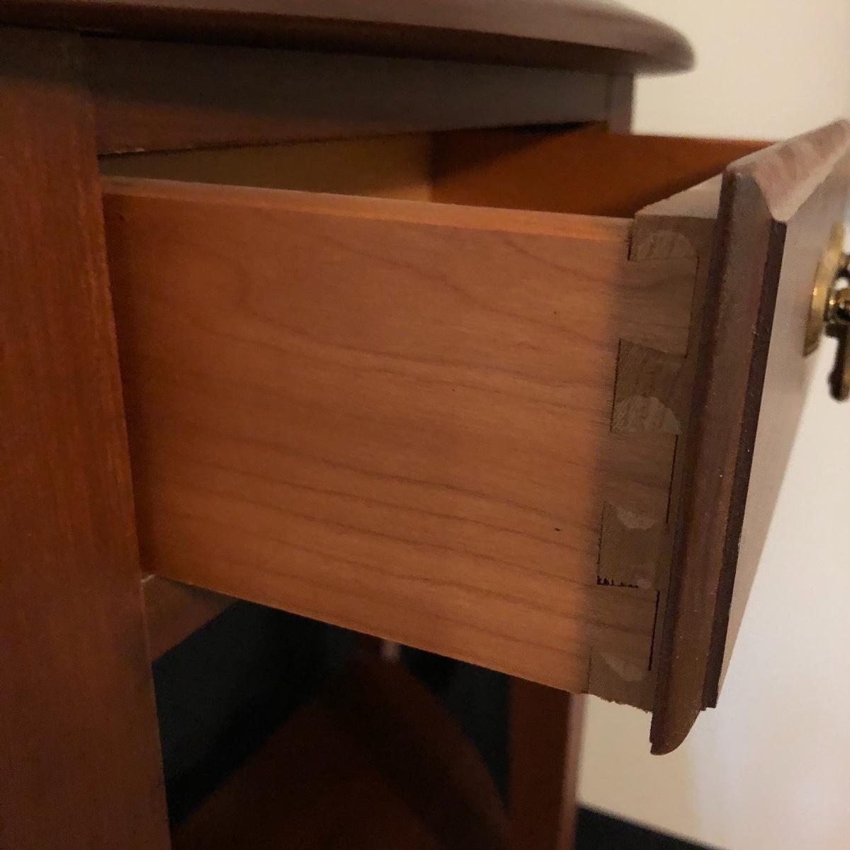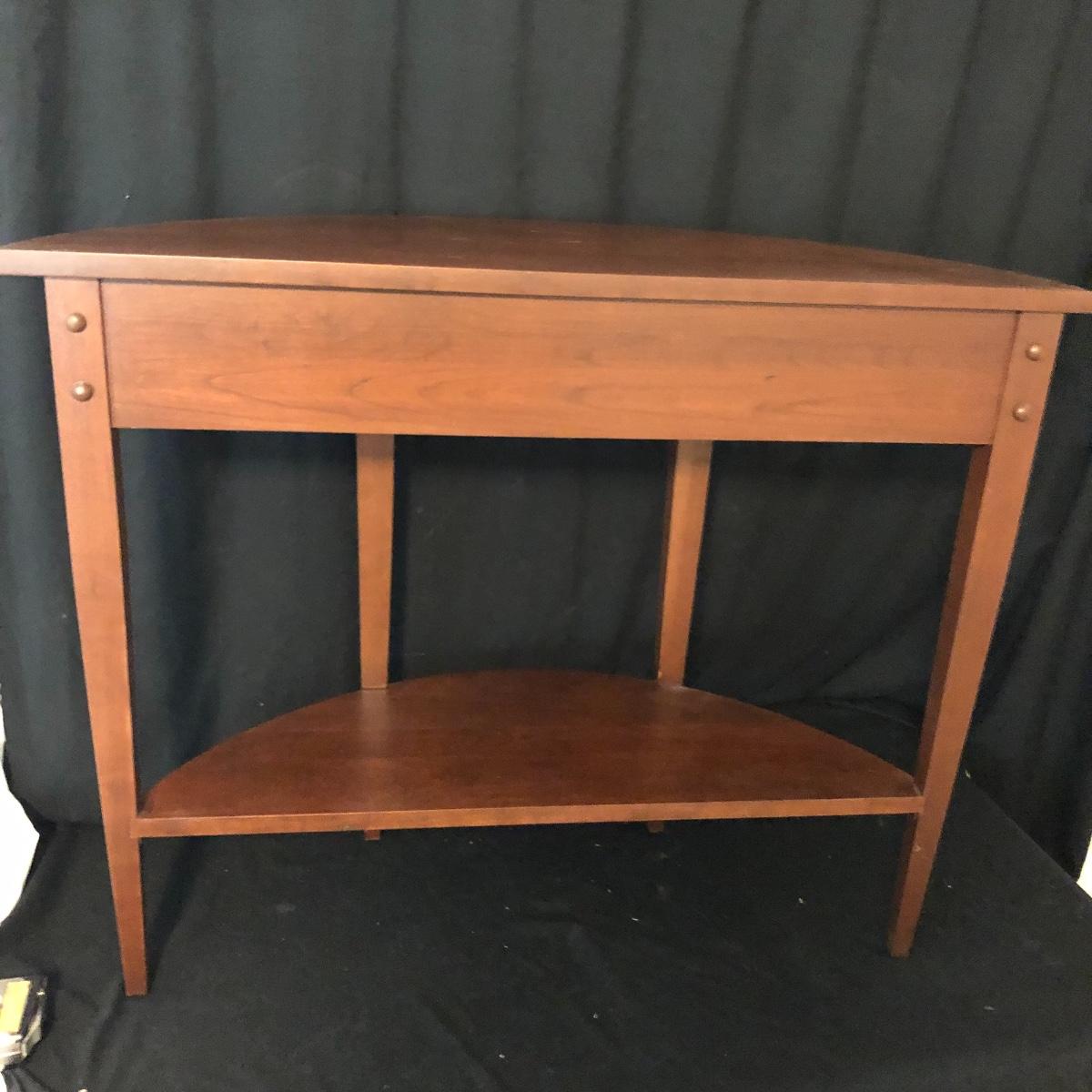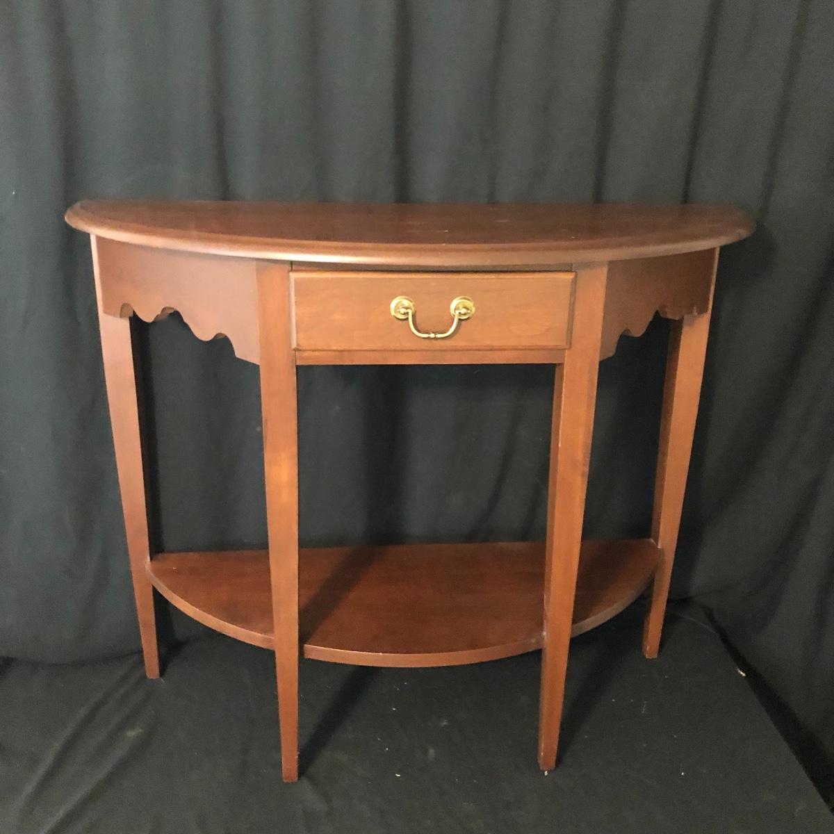 A great table when space is at a premium is this nice wooden half circle table with one dovetailed drawer and a shelf underneath. Table has some slight scratches on top, see pictures.