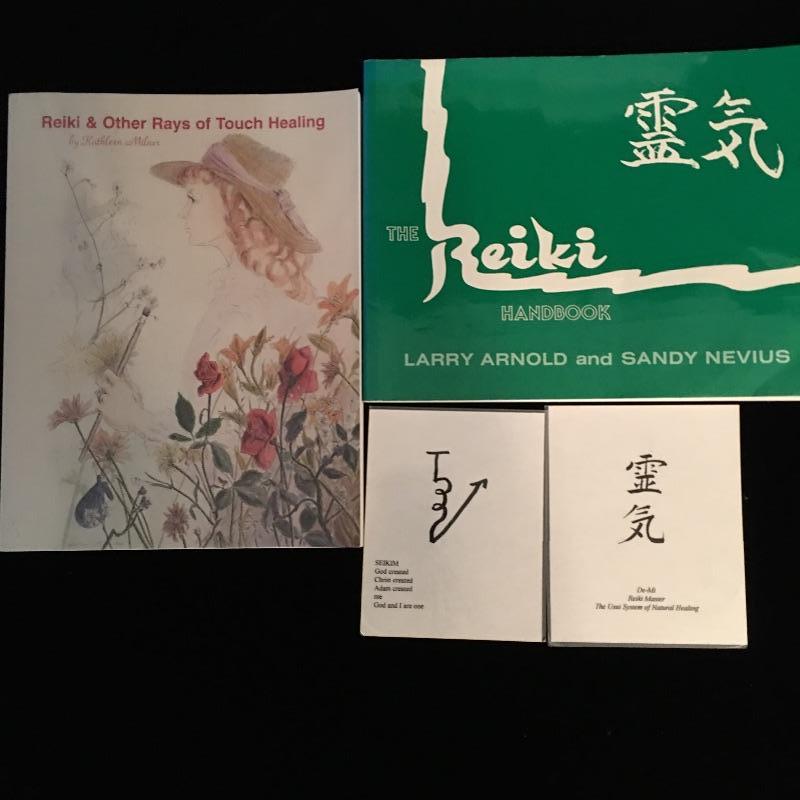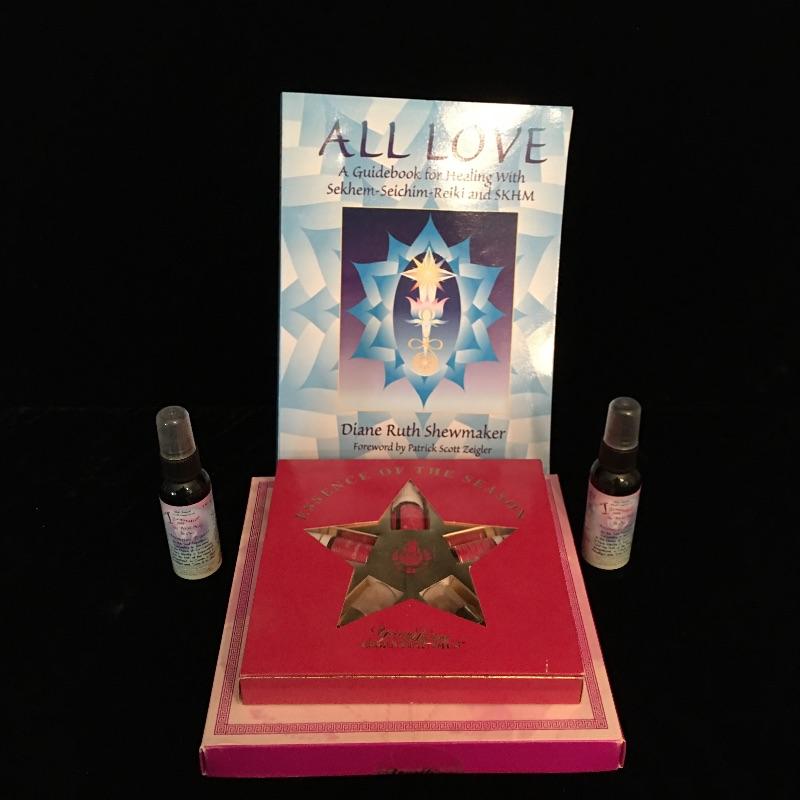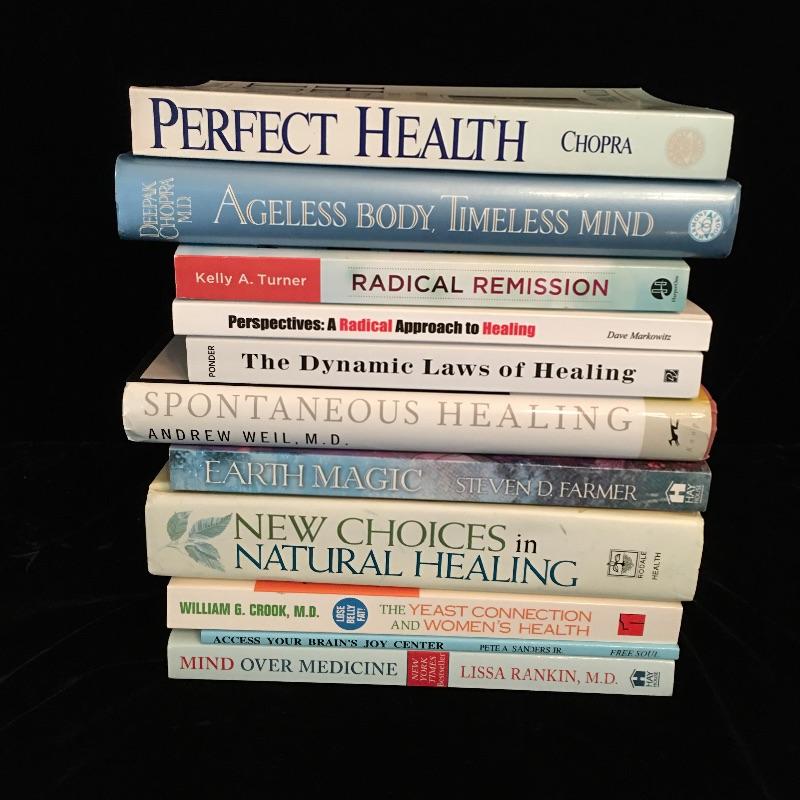 Essential oils and a selection of books on healing including Perfect Health, Radical Remission, Spontaneous Healing, Mind Over Medicine, Reiki and Other Rays of Touch Healing and more.