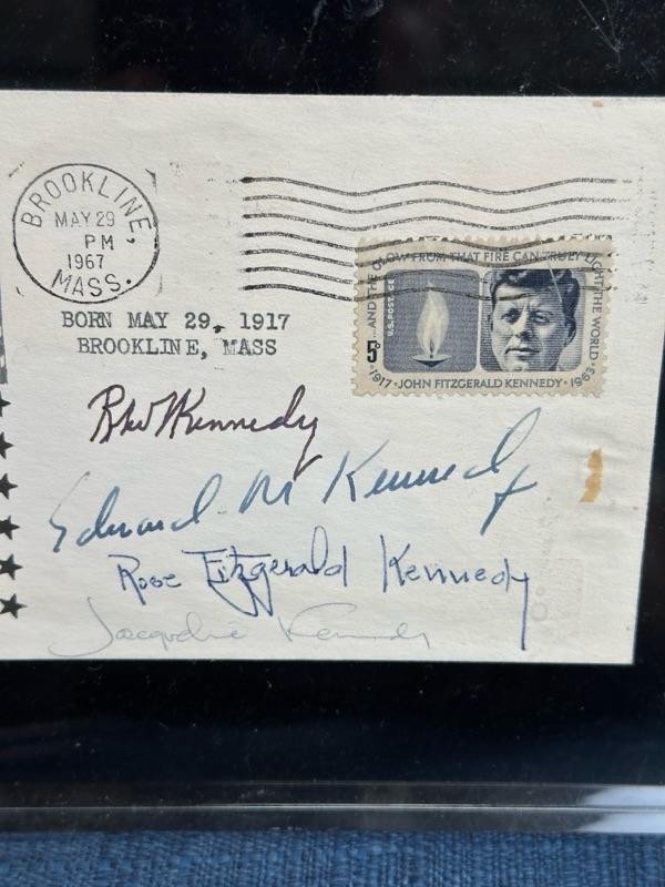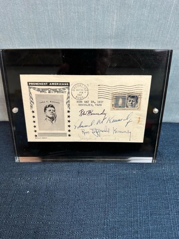 John F. Kennedy postcard signed by various Kennedy family members in Acrylic frame
