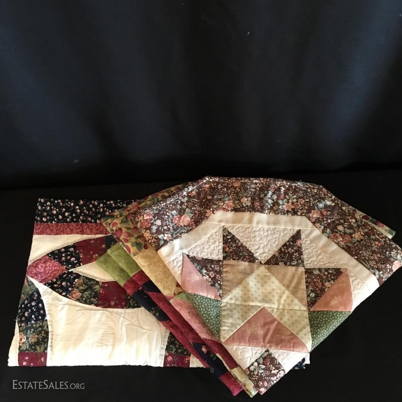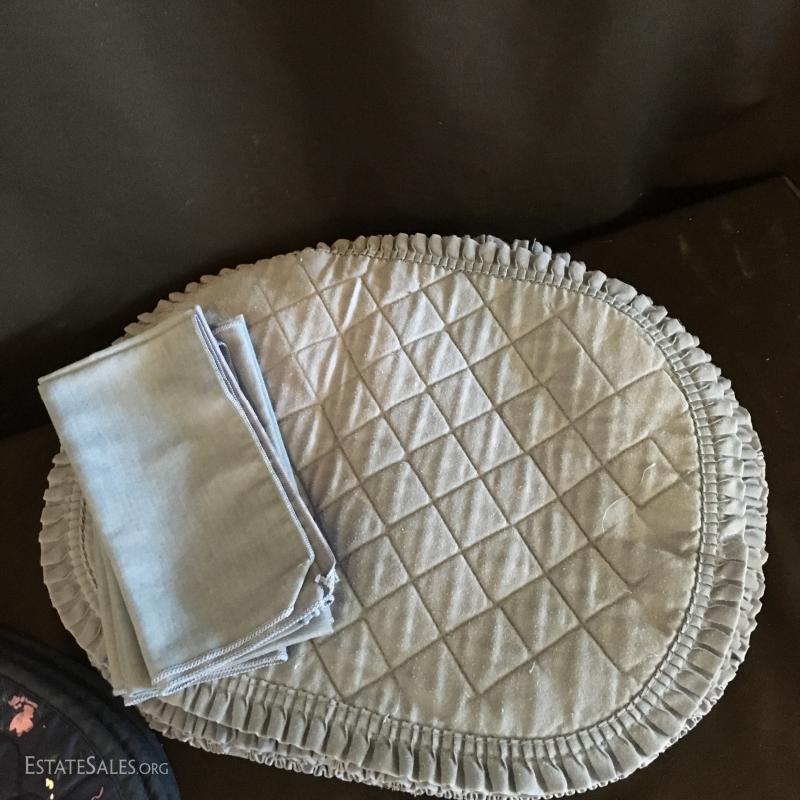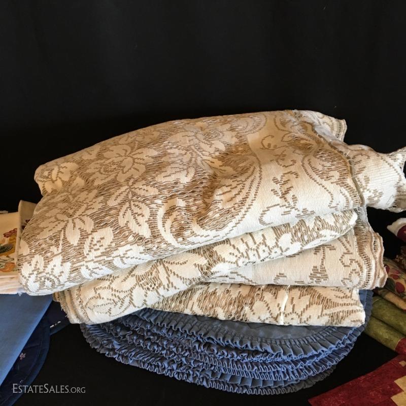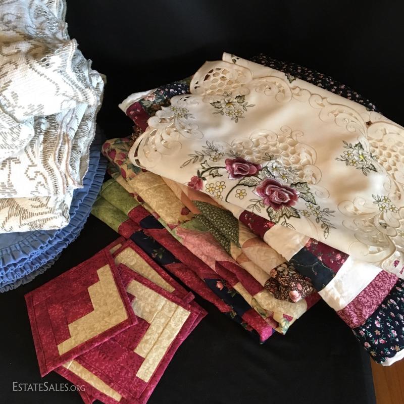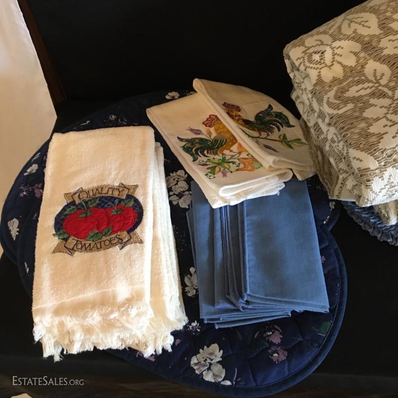 Miscellaneous Lot of Decorative Kitchen Hand Towels, Linen/ Cloth Napkins, Quilted and non Quilted Place Mats, Lace Like Table Cloth, Quilted Pot Holders, Lace/Linen Table Runner with Rose Design