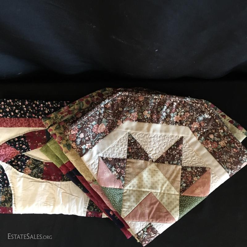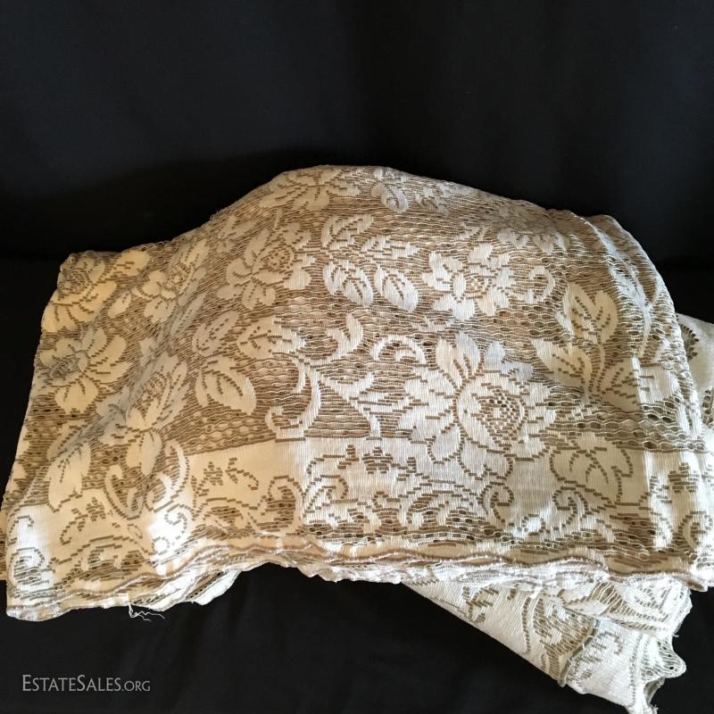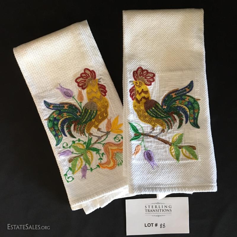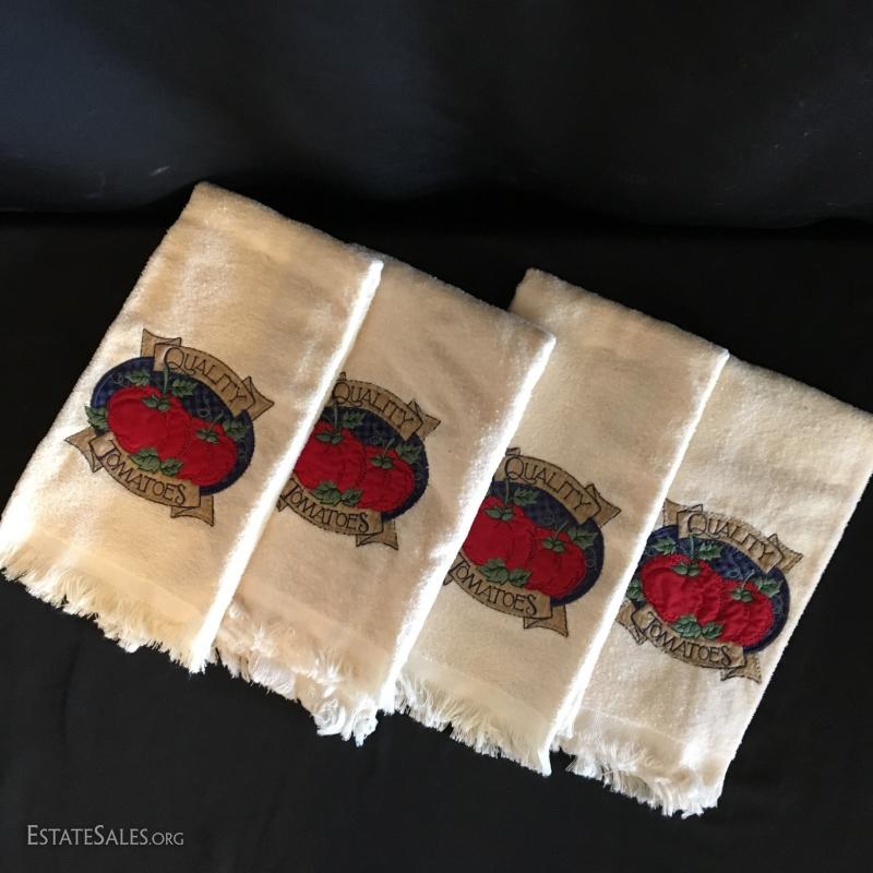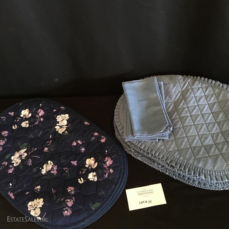 Miscellaneous Lot of Decorative Kitchen Hand Towels, Linen/ Cloth Napkins, Quilted and non Quilted Place Mats, Lace Like Table Cloth, Quilted Pot Holders, Lace/Linen Table Runner with Rose Design