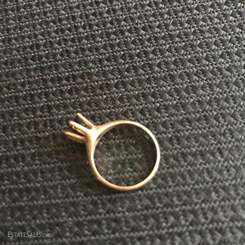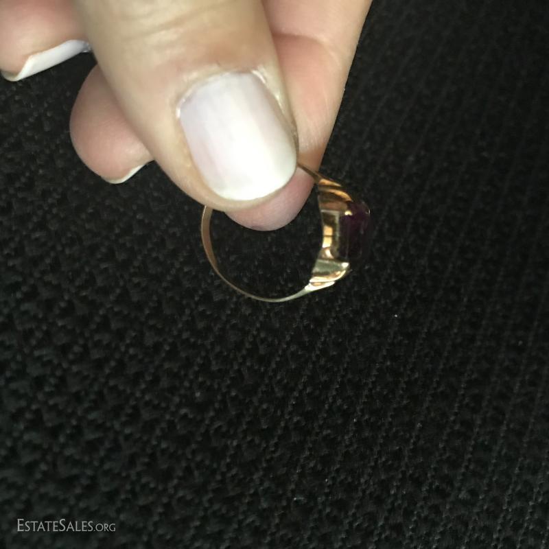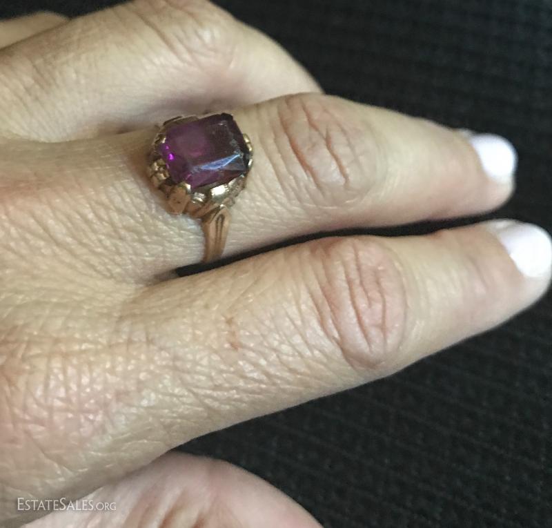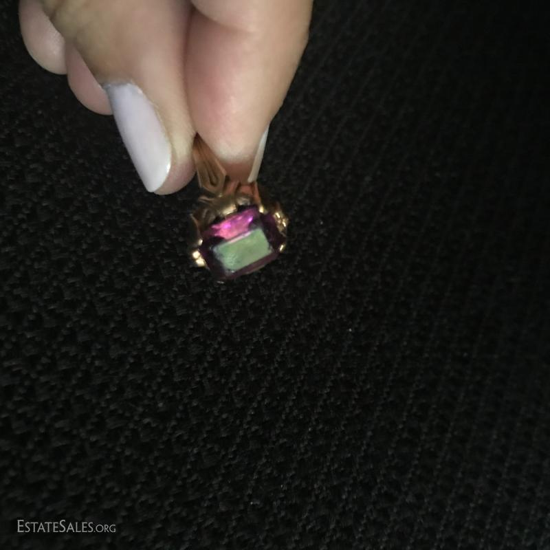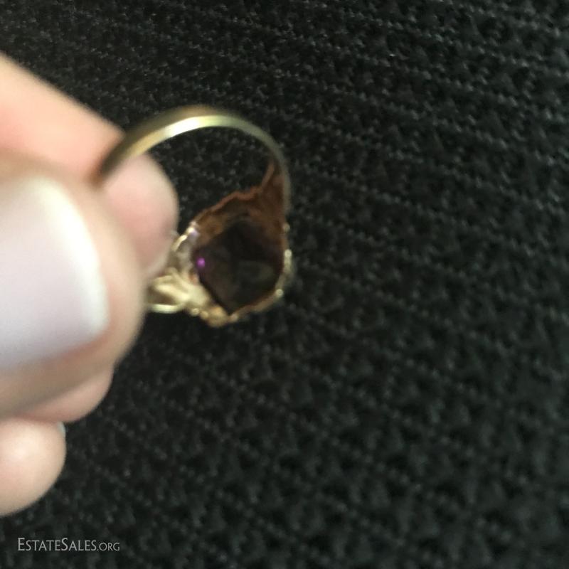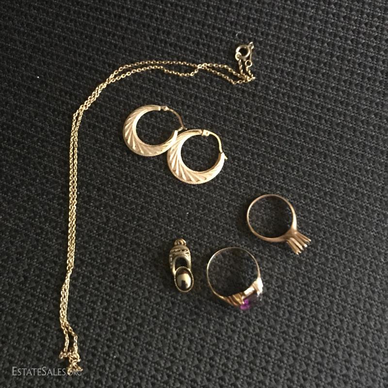Gold necklace marked 10k. Pair of earrings (one broken) with illegible mark. Purple stone ring with 10k mark. Ring with no stone has 10k mark. Small stone pendant. No mark. We can not verify the authenticity of any of these items. We are stating what is seen to the naked eye. Shipping available or local pick up in Saluda, NC.
