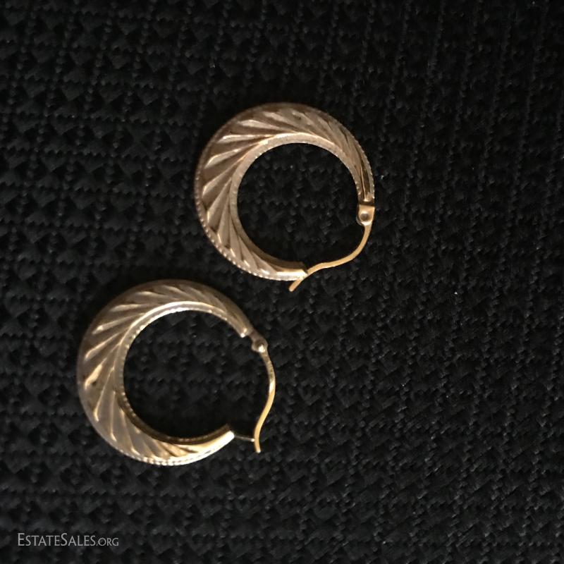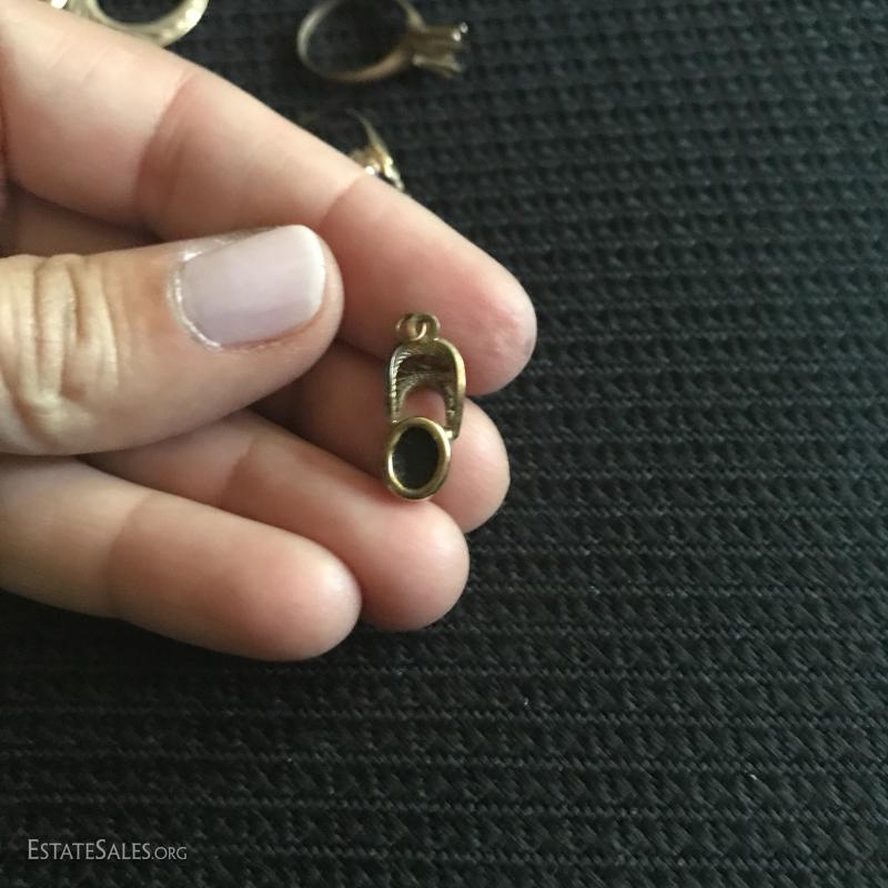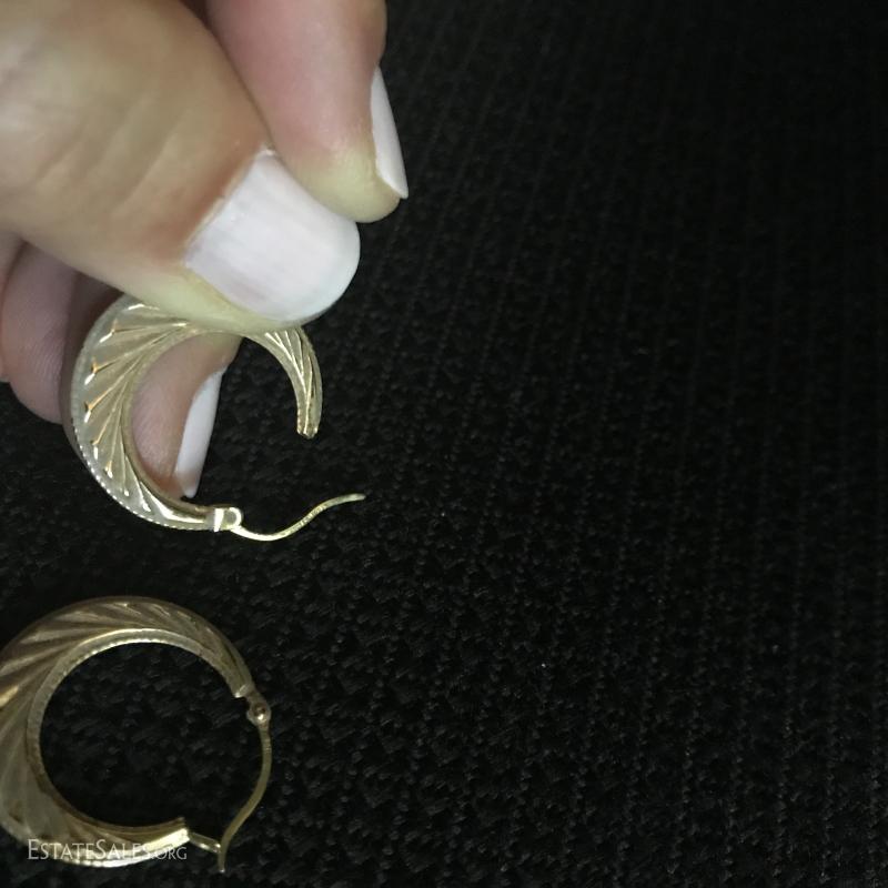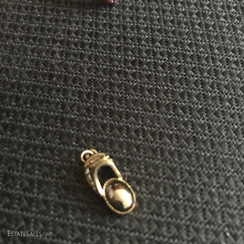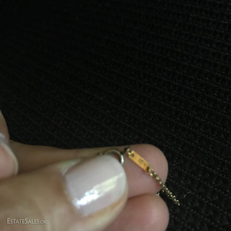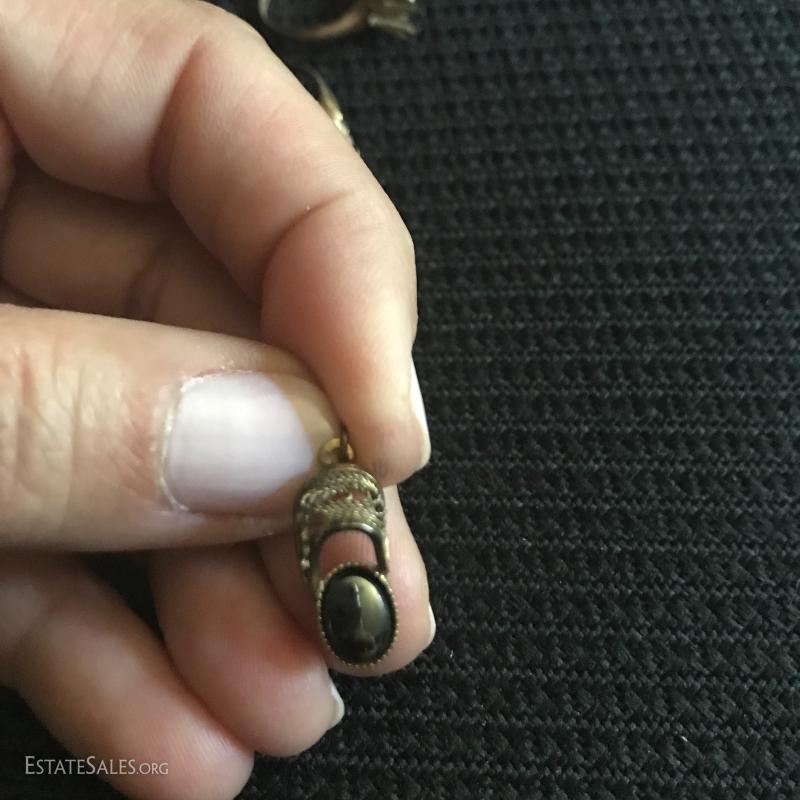Gold necklace marked 10k. Pair of earrings (one broken) with illegible mark. Purple stone ring with 10k mark. Ring with no stone has 10k mark. Small stone pendant. No mark. We can not verify the authenticity of any of these items. We are stating what is seen to the naked eye. Shipping available or local pick up in Saluda, NC.