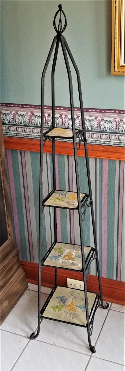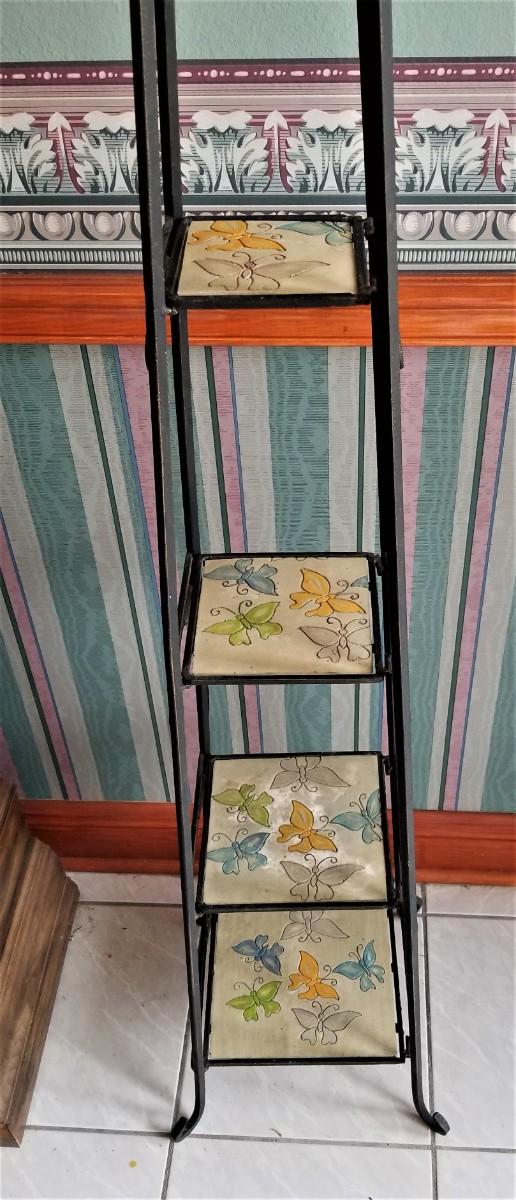 Indoor/Outdoor four shelf metal display rack for plants or whatever. Butterfly motif. 58" tall, 13' wide at the base. Good used condition.