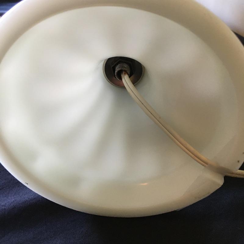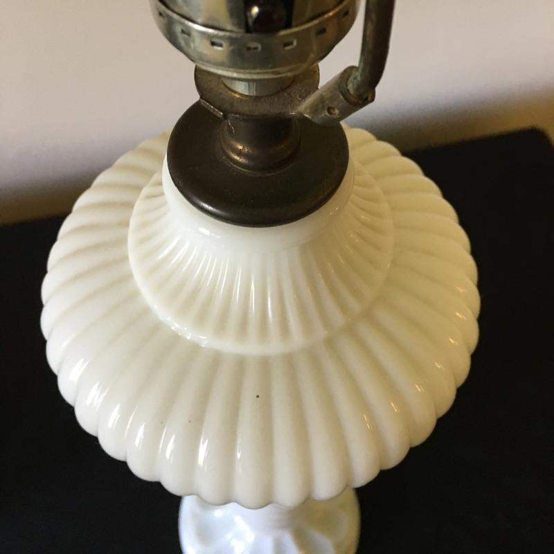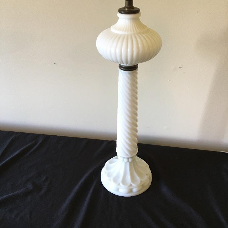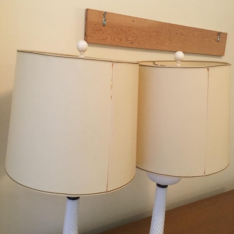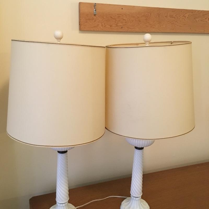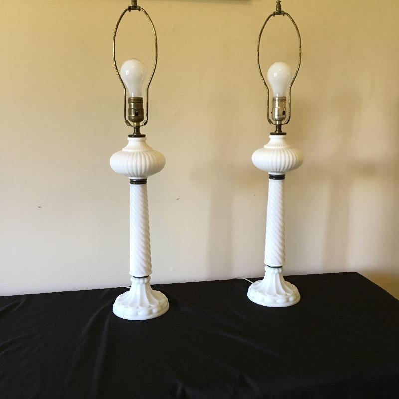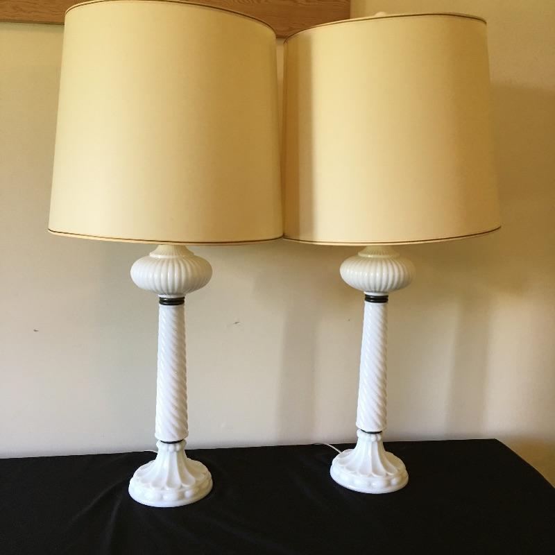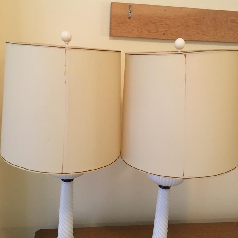 Unique pair of milk glass lamps with shades. Light up the room with this stylish pair of lamps. Both lamps worked when tested.
