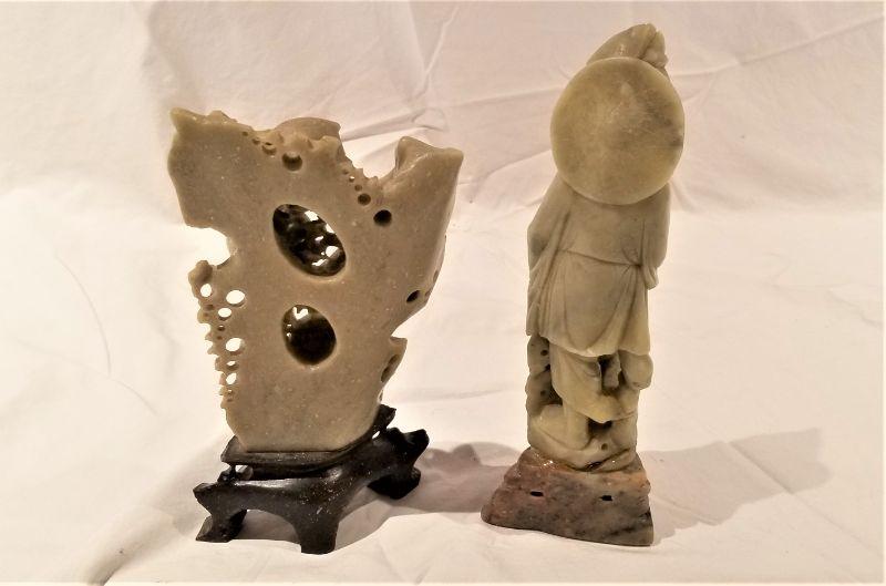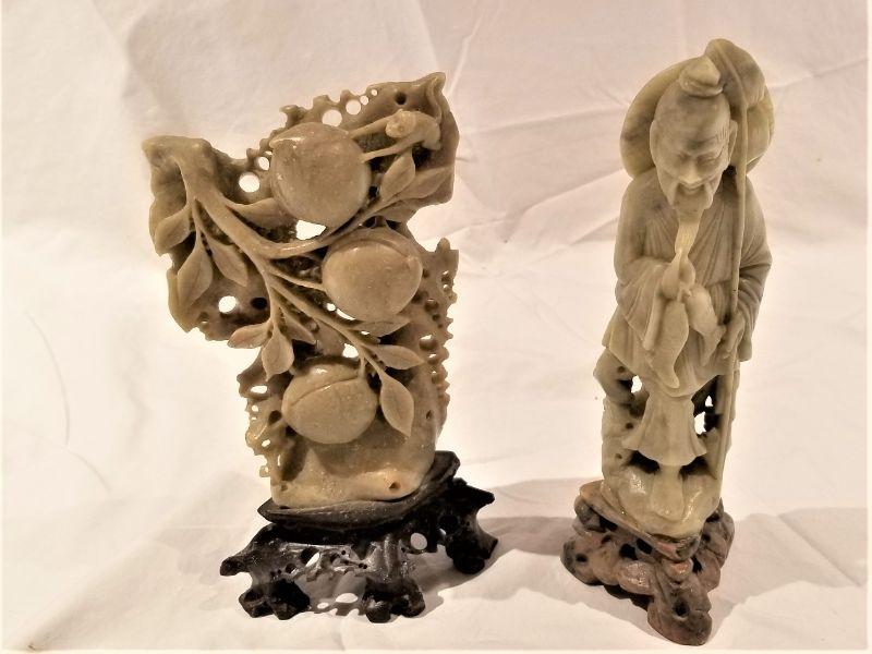 Nice pair of pale green soapstone carvings - fruit and Chinese gentleman. Man has repair at the base. They each stand about 8" tall. Price is for the pair.