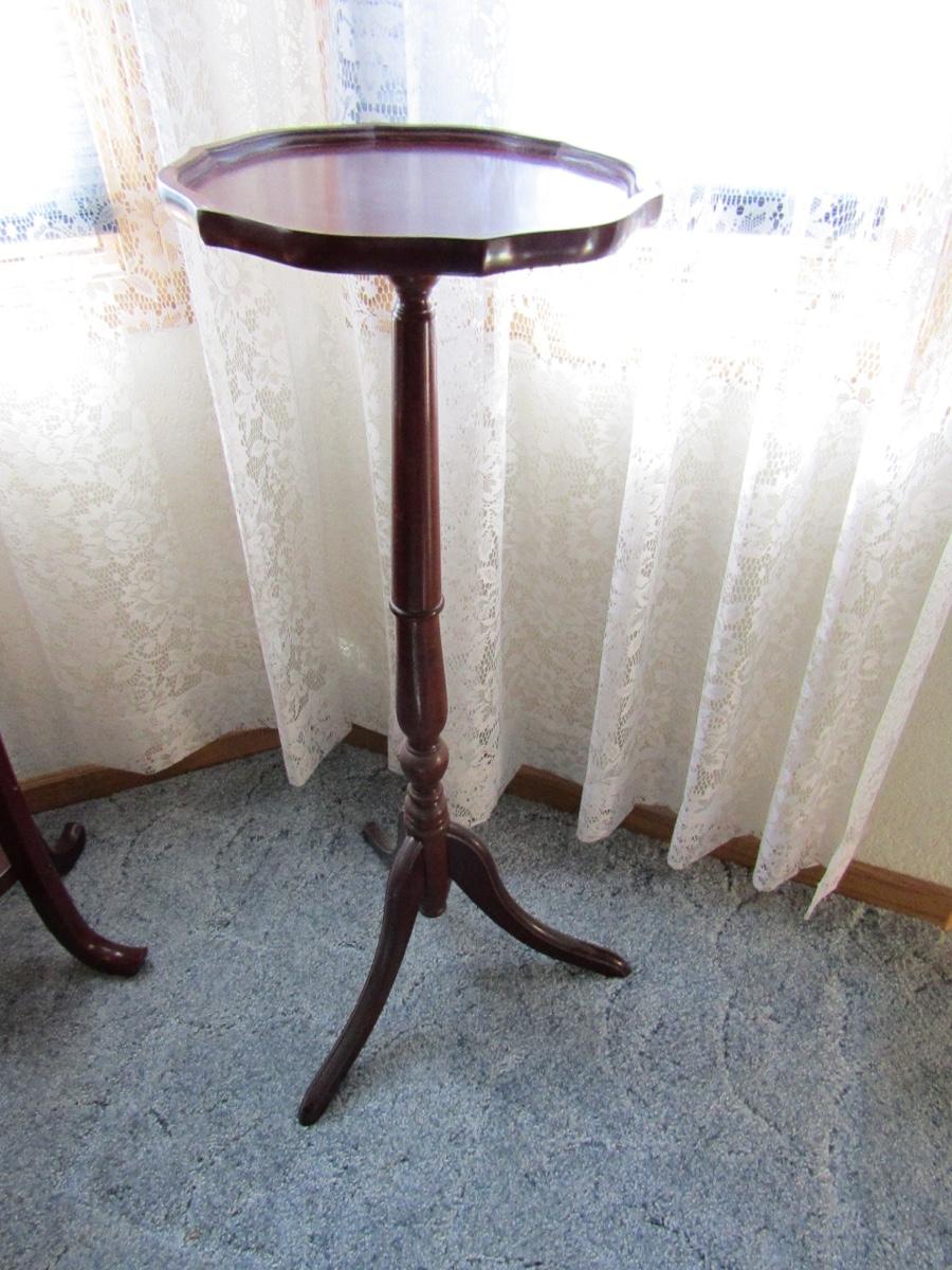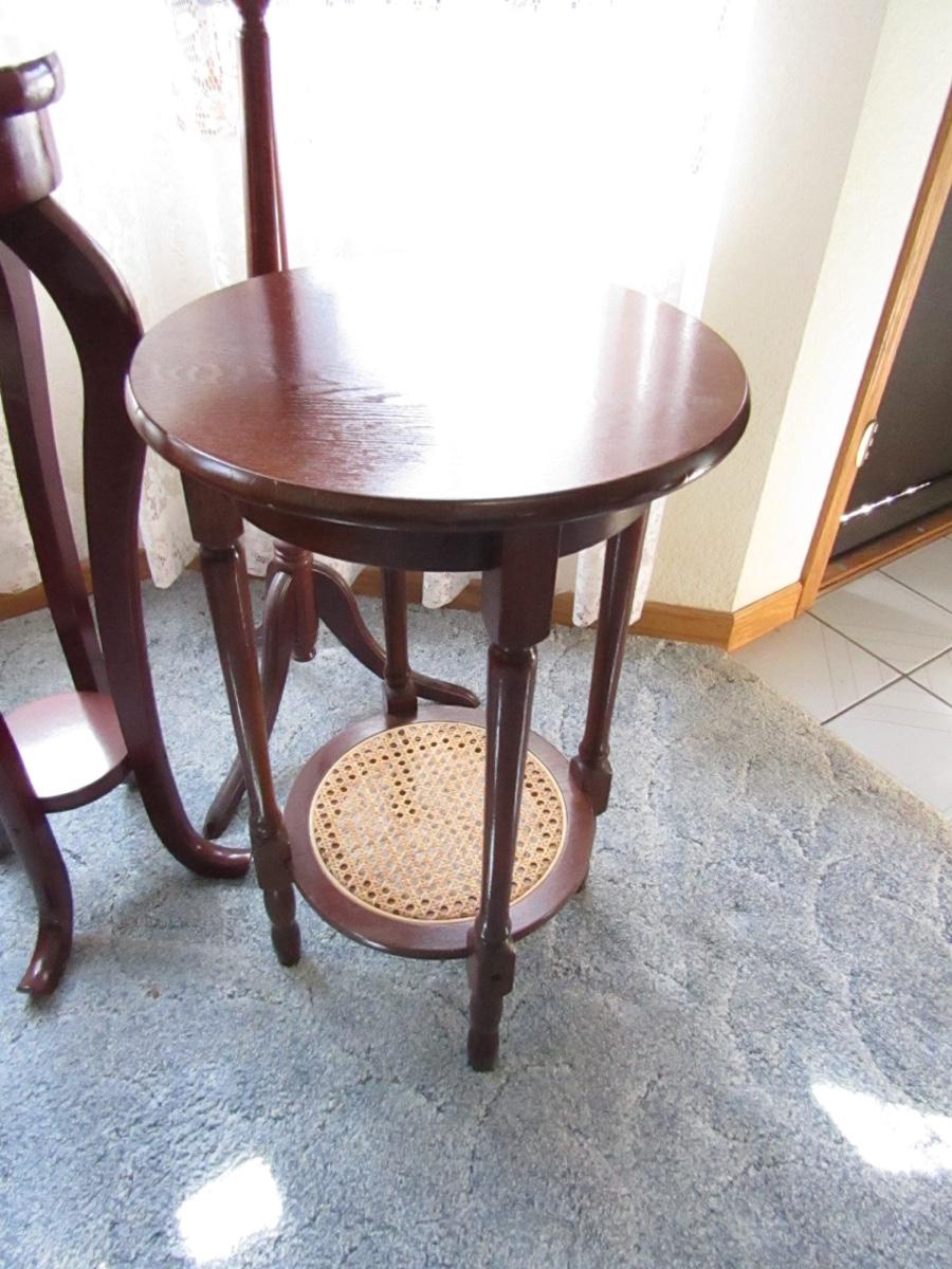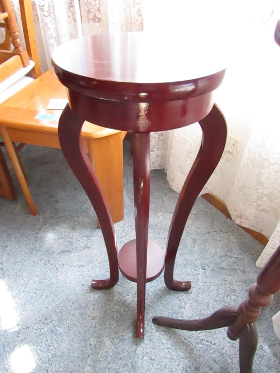 SET OF 3 ROUND PLANT STANDS, ALL VARYING SIZES. APPROXIMATELY 16x35 12x34 & 11x31. ONE HAS WICKER DETAIL ON THE LOWER SHELF. ONE HAS DETAIL ON EDGING. DIFFERENT LEG STYLE ON ALL.