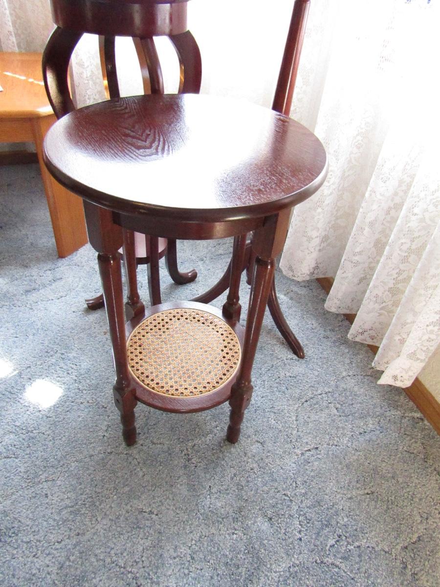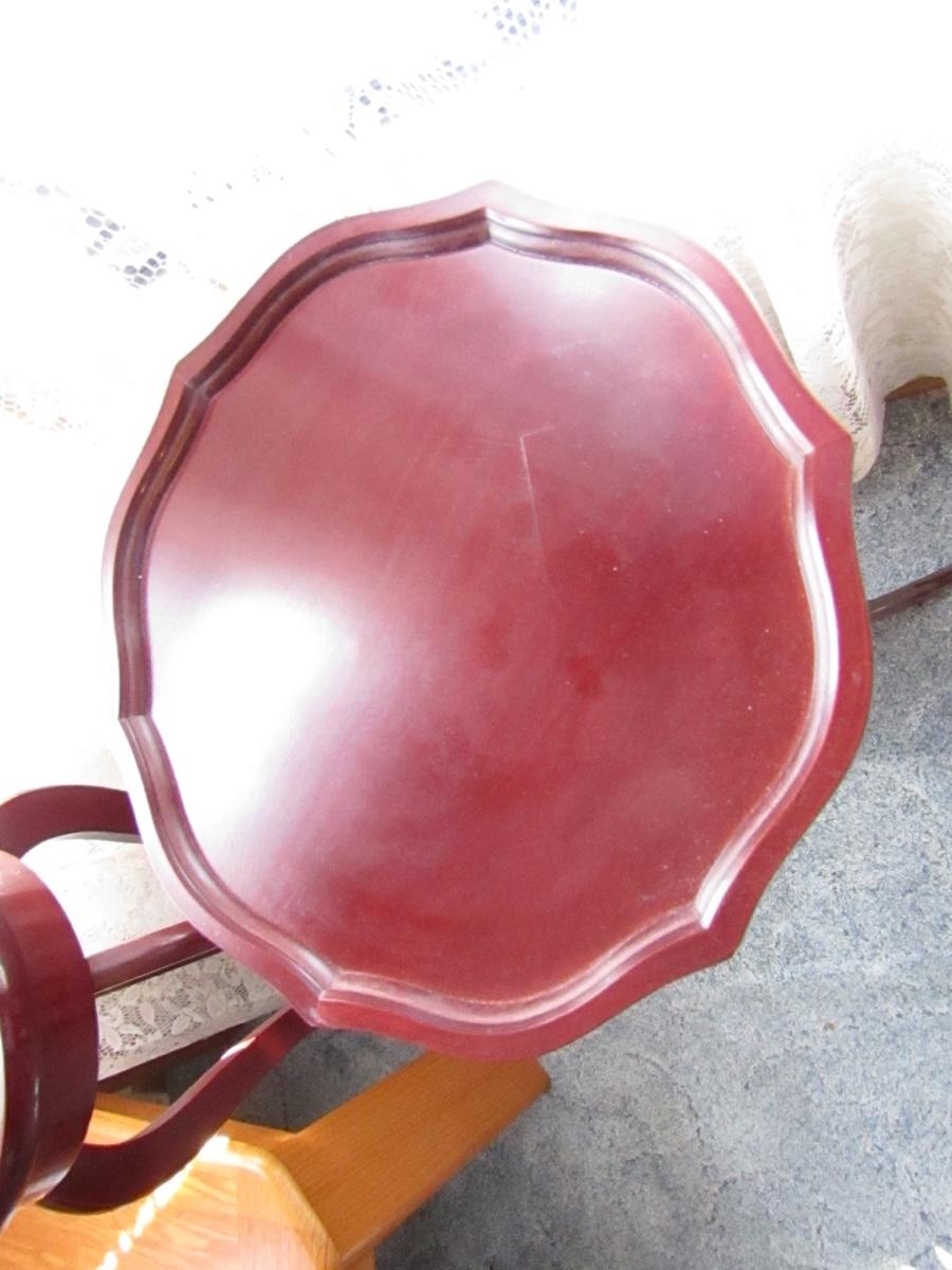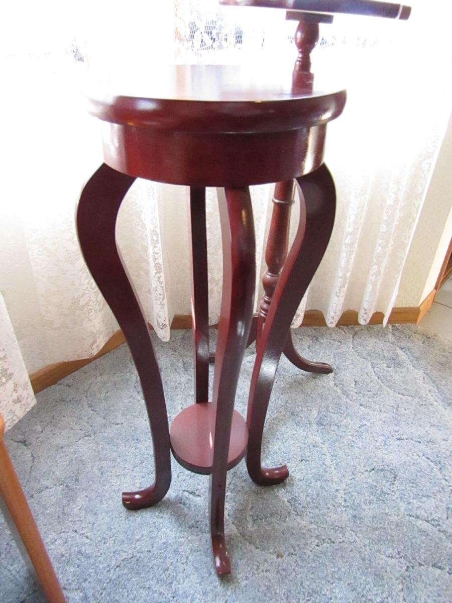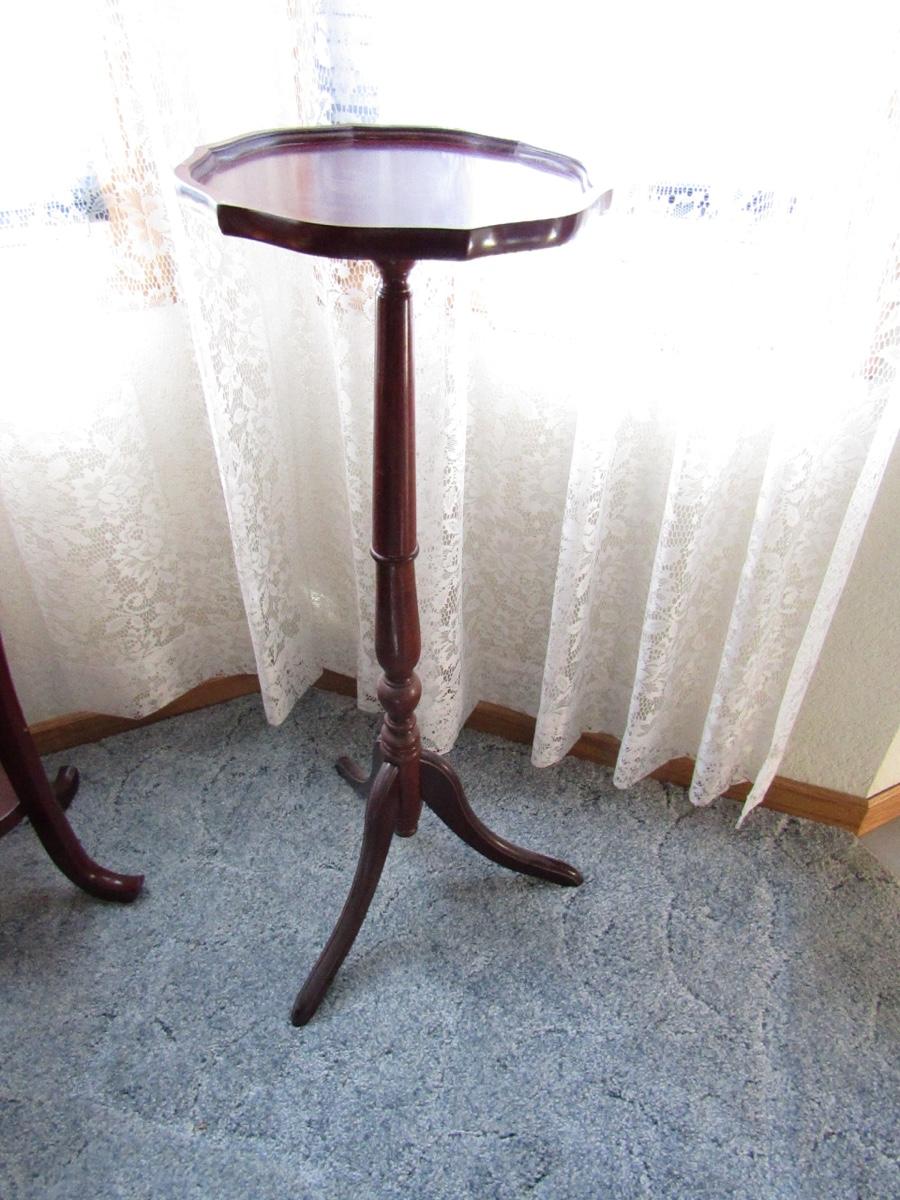 SET OF 3 ROUND PLANT STANDS, ALL VARYING SIZES. APPROXIMATELY 16x35 12x34 & 11x31. ONE HAS WICKER DETAIL ON THE LOWER SHELF. ONE HAS DETAIL ON EDGING. DIFFERENT LEG STYLE ON ALL.