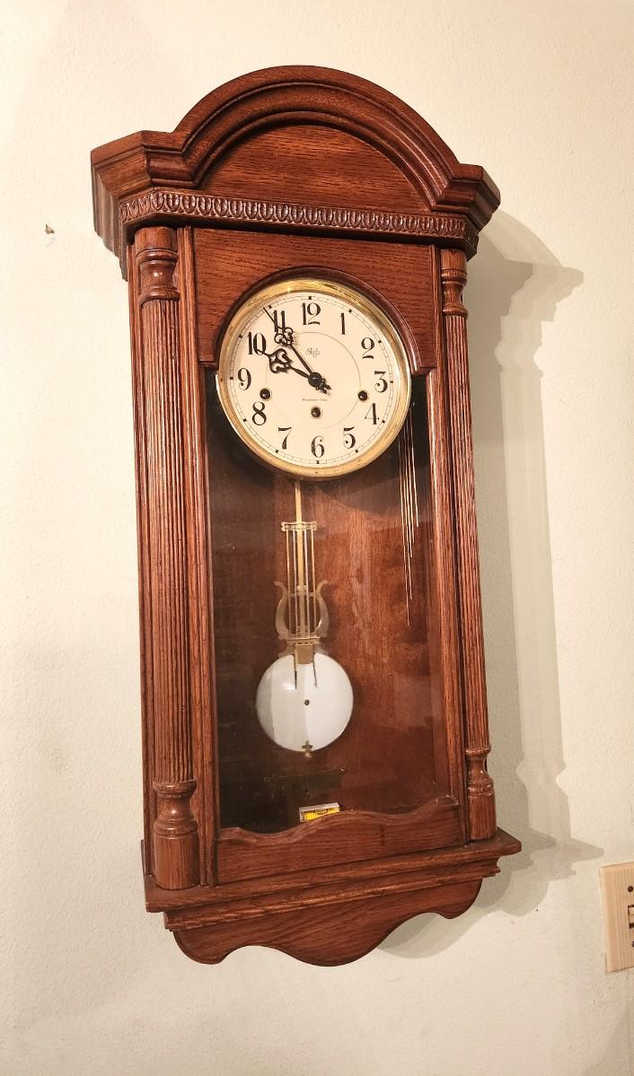 High quality SLIGH Wall clock with Pendulum - Westminster chimes on the hour and the half. Oak finish, built-in level. 30" tall. Has key.