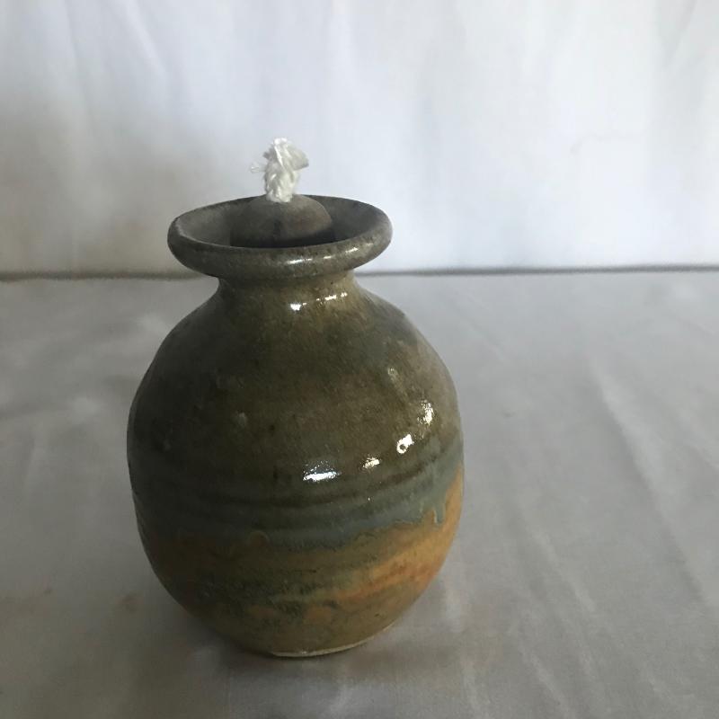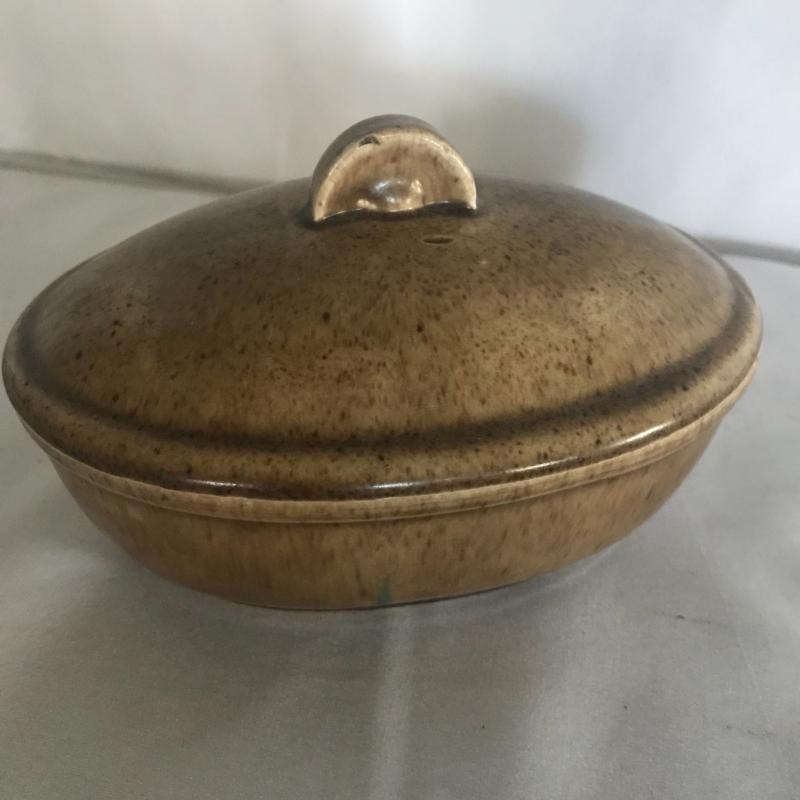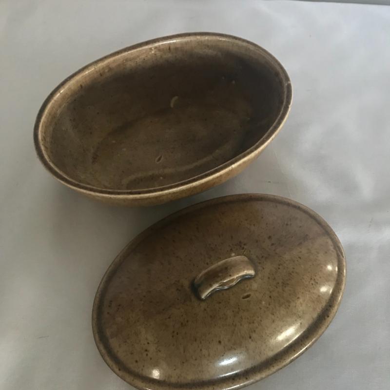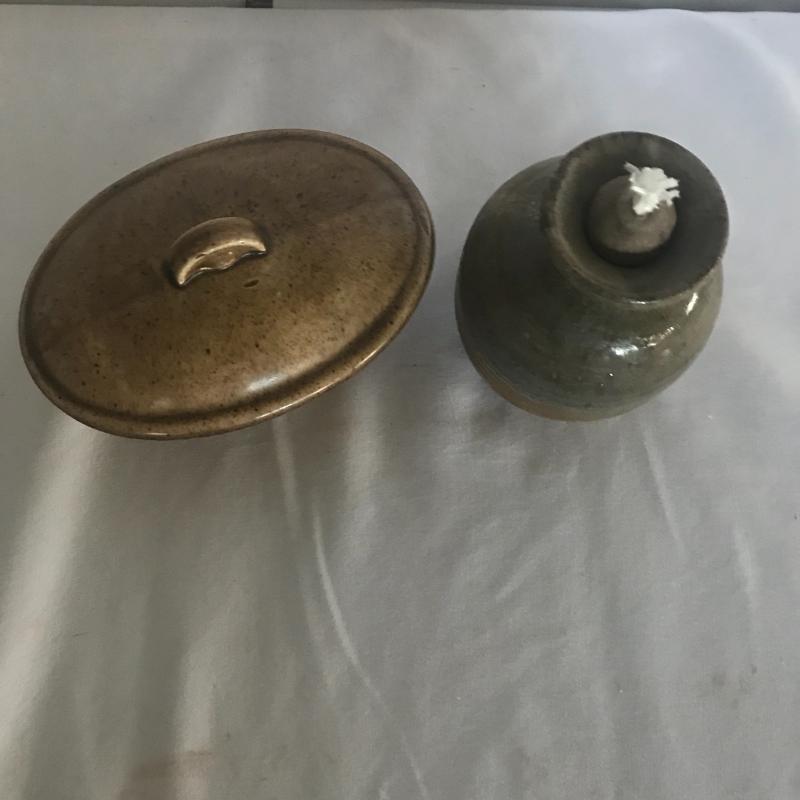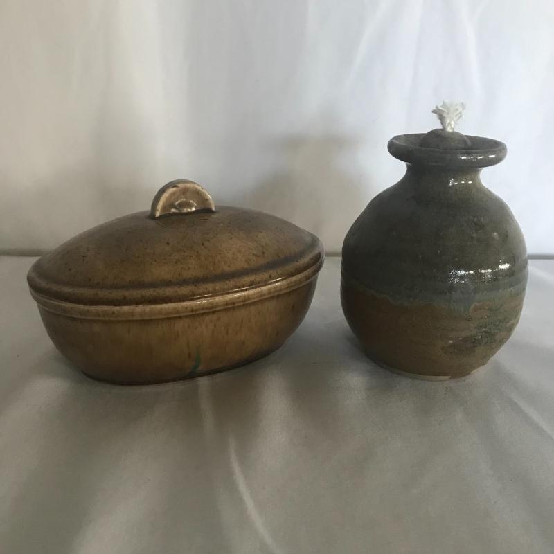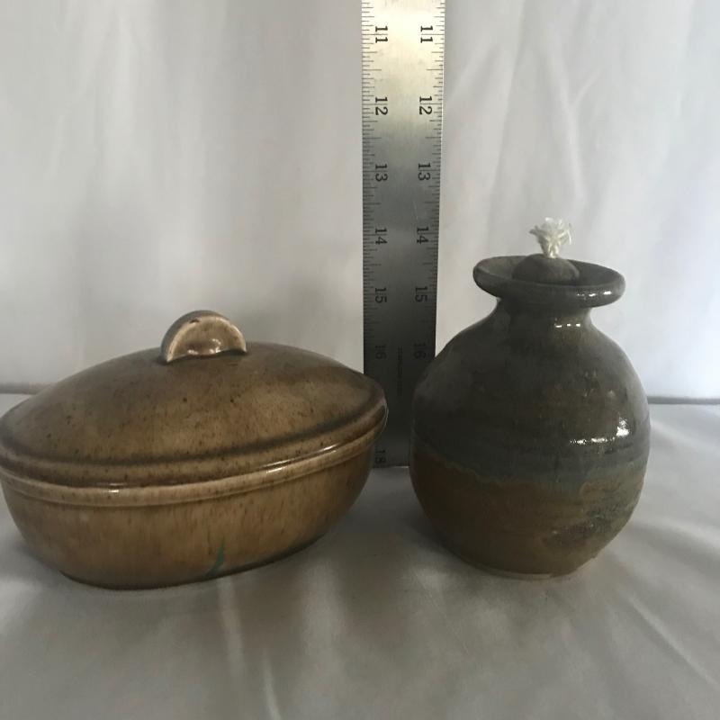 Two sweet pieces that go nicely together and have no markings. Oil lamp has greens and tan coloring measuring 3.5” x 4.5” and covered piece is brown with dark speckles. Shipping available.