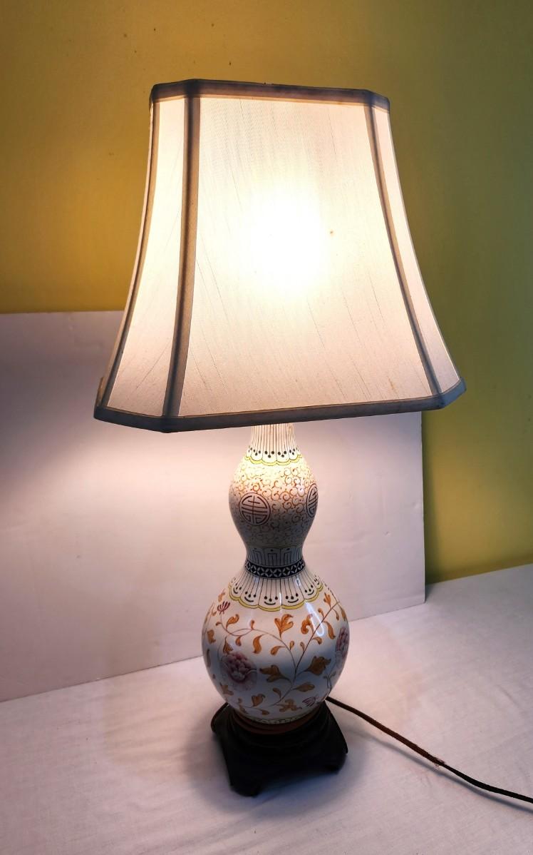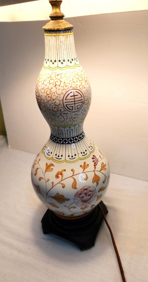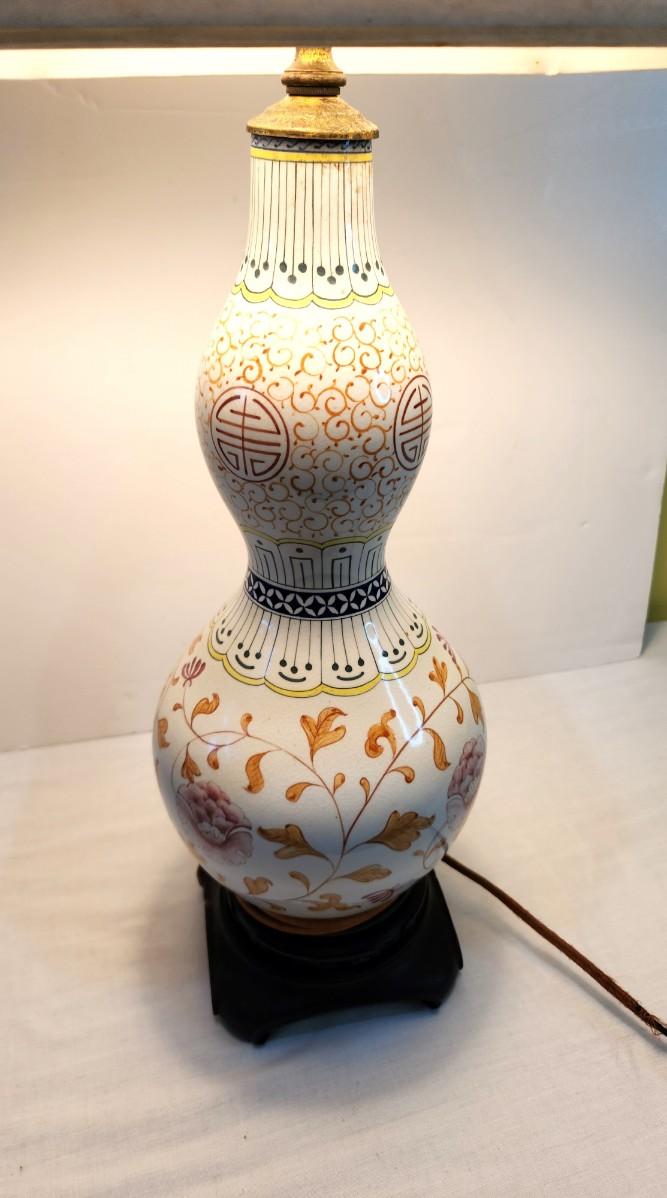 Another piece of classic design - nice table lamp made from an antique Chinese base - works - vintage silk wrap to cord is coming undone, so cord should really be replaced or rewrapped. Wooden base. Some light soiling to shade. The shape/form of this vase is a little different from what you usually see. Very pretty.