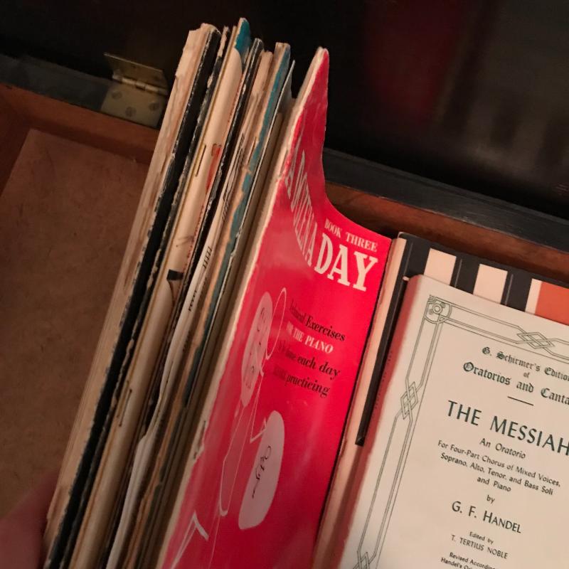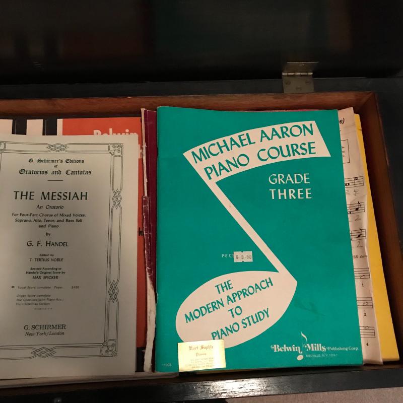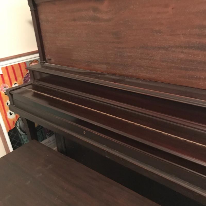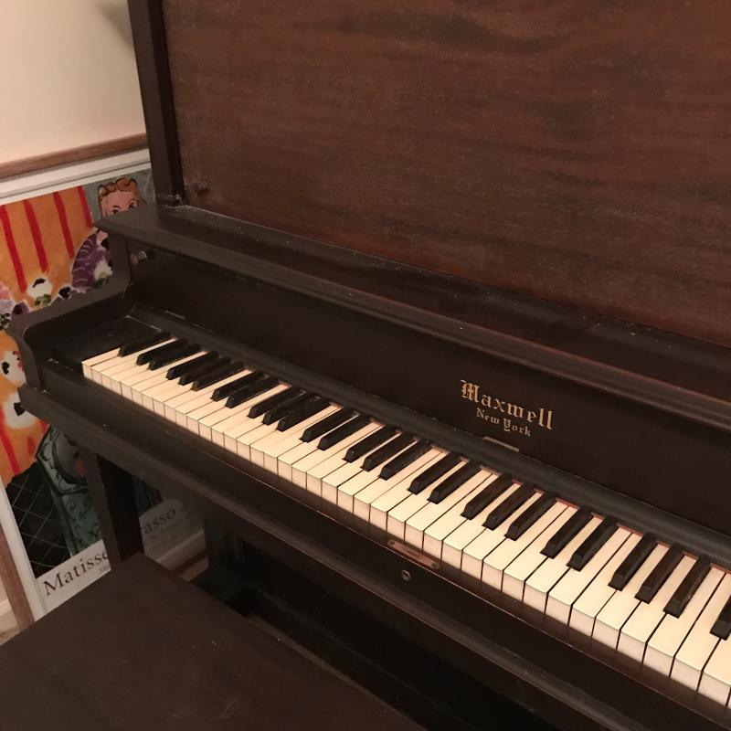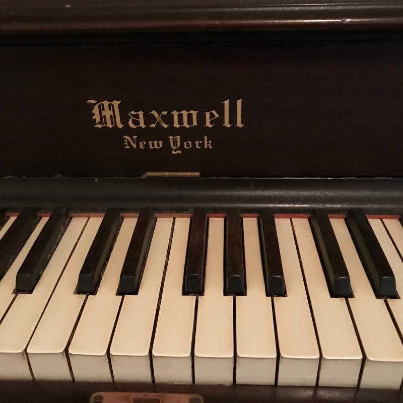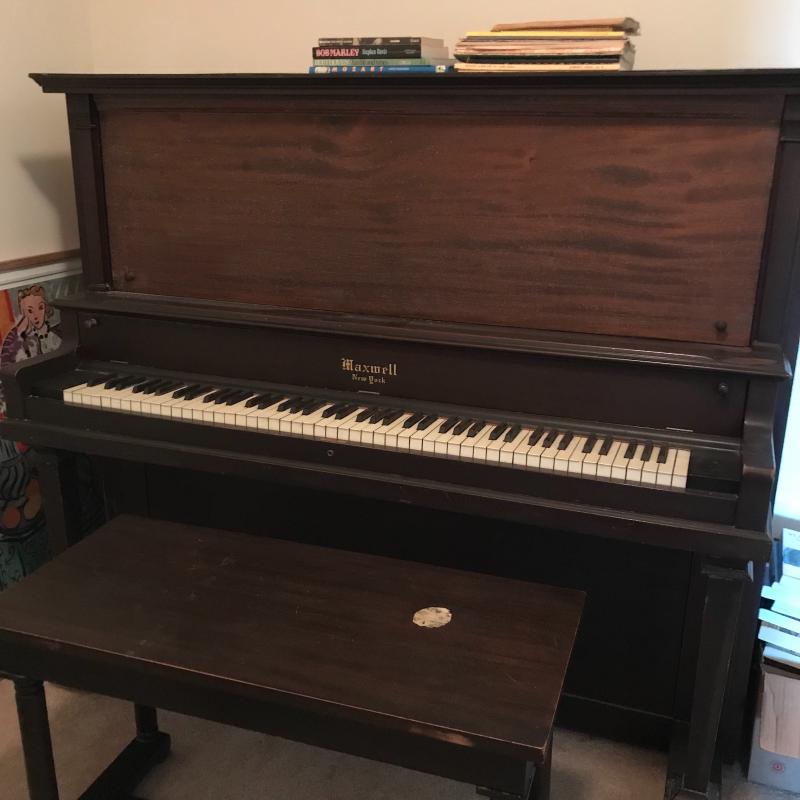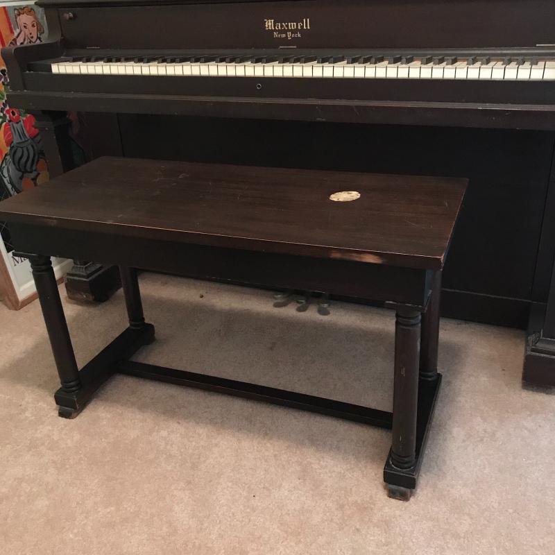 Beautiful, old Maxwell piano with piano bench and dozens of music books. All of the keys work. Cannot verify sound quality. Piano is approximately 64”l x 27”w x 54”h. Bench opens and is approx. 36”l x 16”w x 21”h. Has water stain on top. See pics.