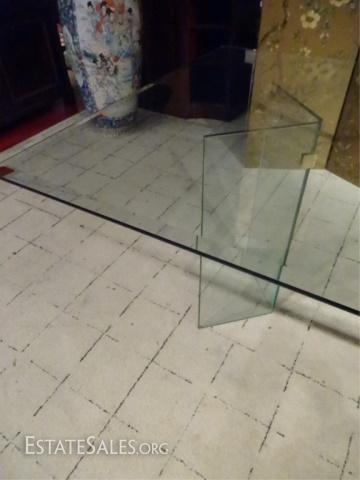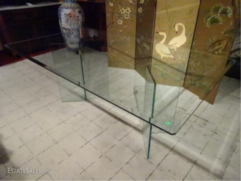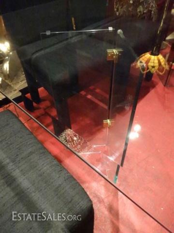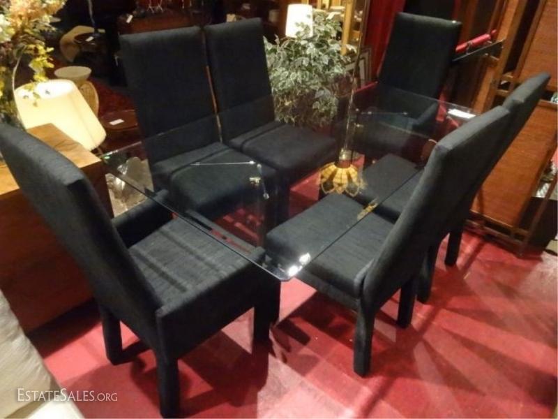 LOT 88: VINTAGE GLASS DINING TABLE & 6 BLACK UPHOLSTERED PARSONS CHAIRS