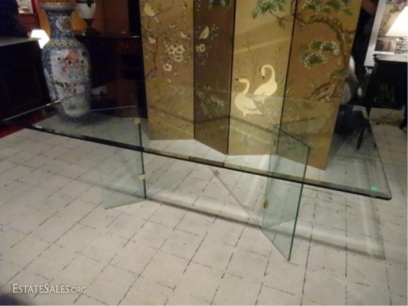 LOT 88: VINTAGE GLASS DINING TABLE & 6 BLACK UPHOLSTERED PARSONS CHAIRS, TABLE IN THE STYLE OF PACE, DUAL V SHAPED PEDESTAL BASES, BEVELED GLASS TOP