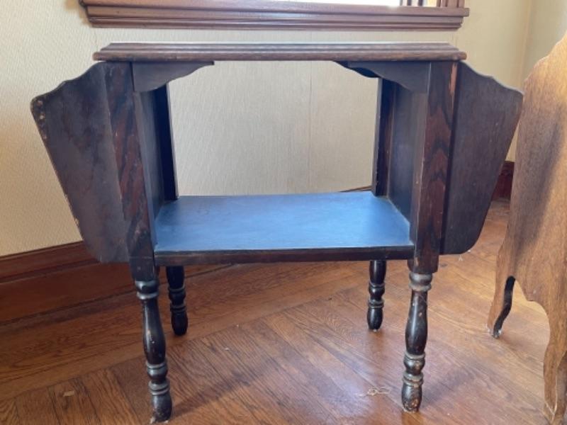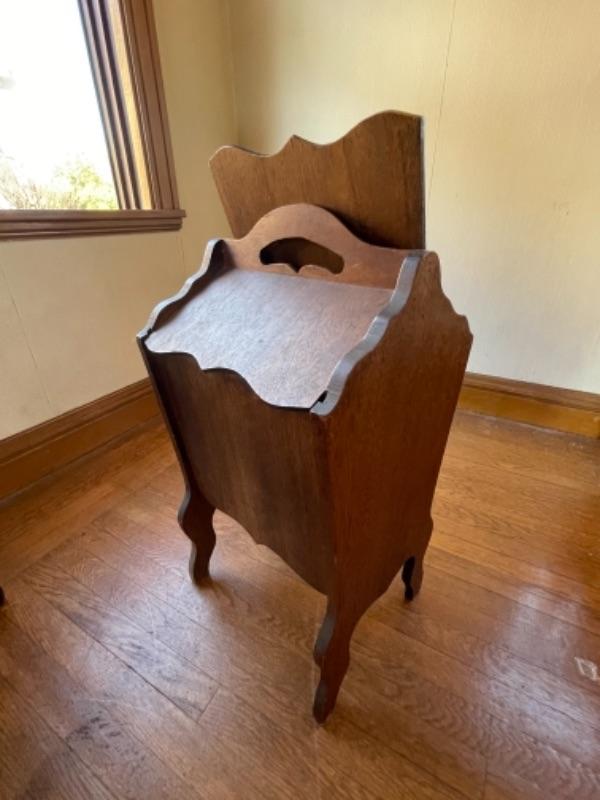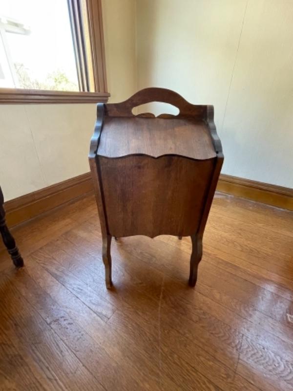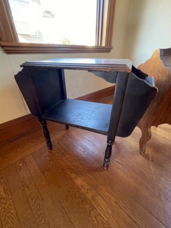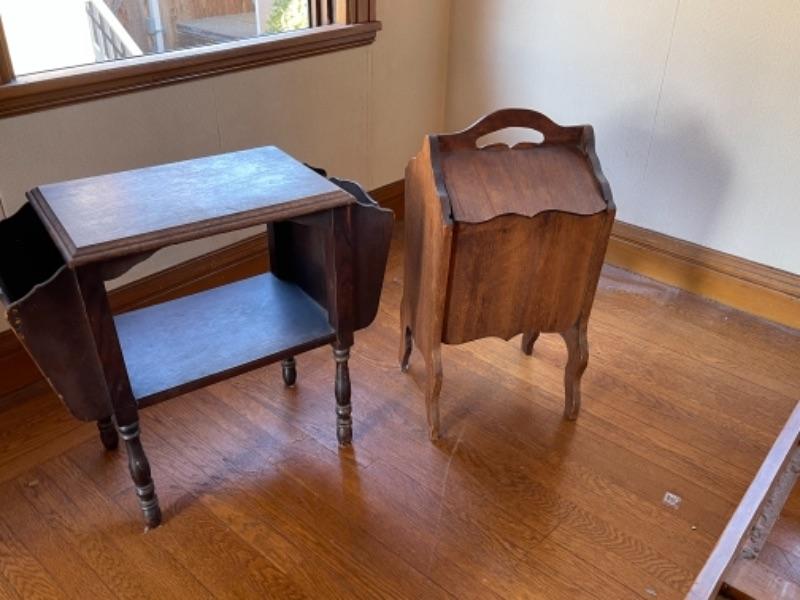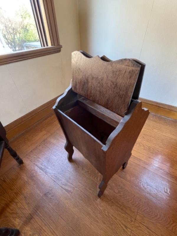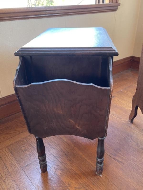 Lot 88. Vintage magazine rack (26’L x 12”W x 23”H) and sewing box (1940s)(13”L x 12”W x 24”H)--Was $40 - -Now $25