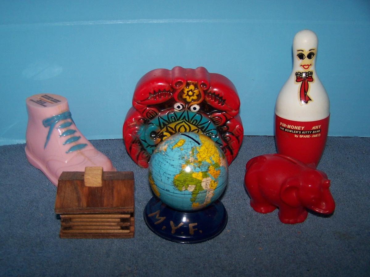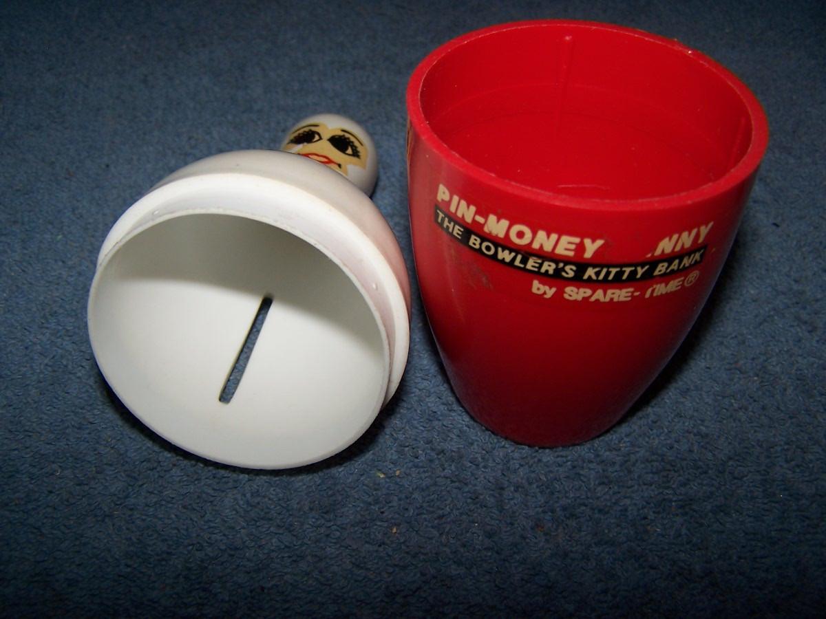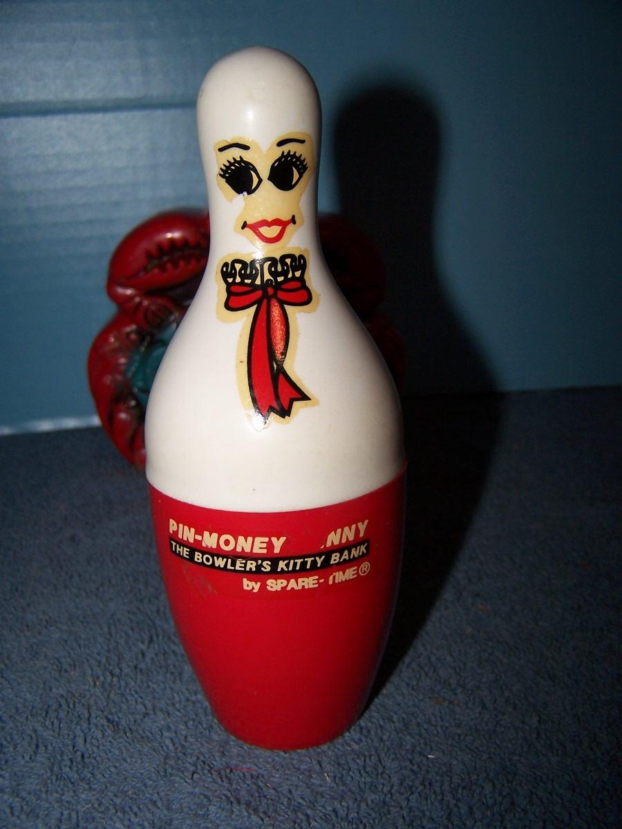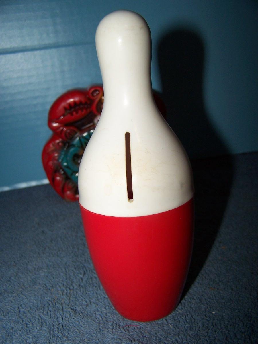 THESE ARE WONDERFUL VINTAGE MCM BANKS!!! METAL/PLASTIC/WOOD/CERAMIC... BOWLING PIN IS 6 5/8'' TALL.. LIGHT WEAR..