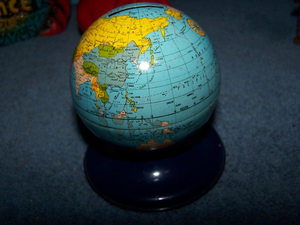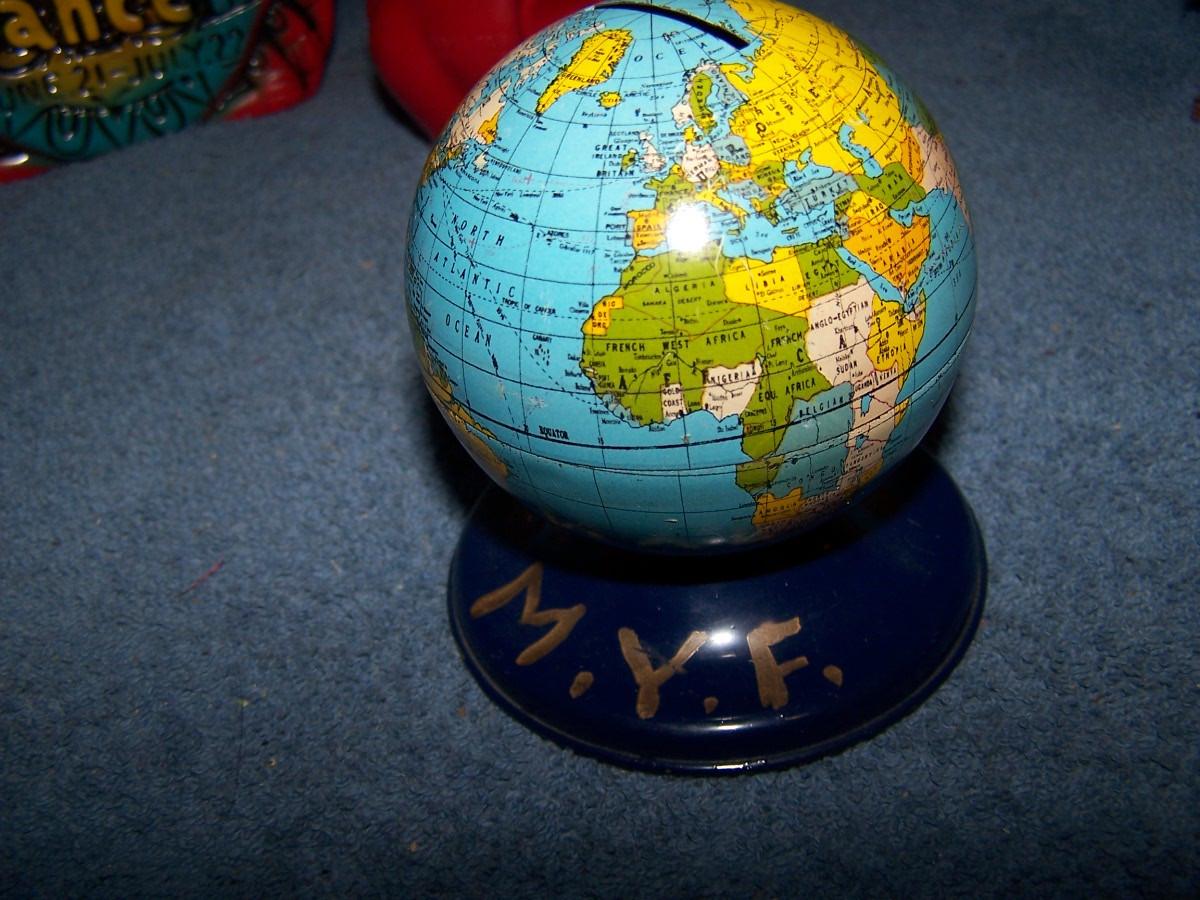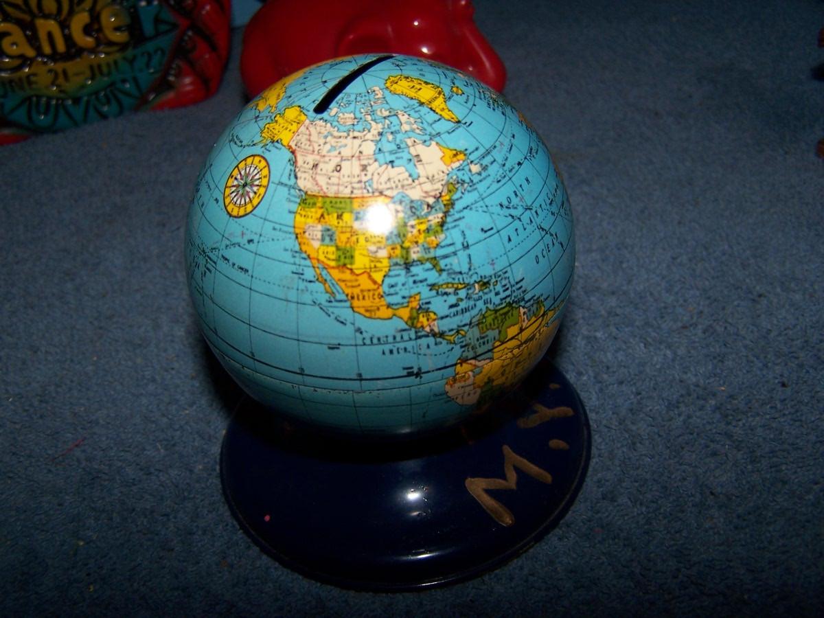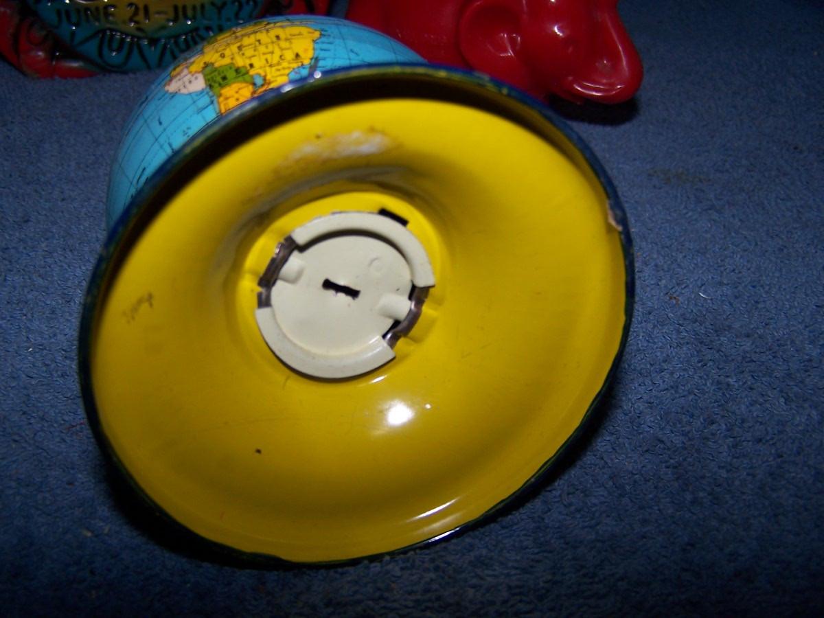 THESE ARE WONDERFUL VINTAGE MCM BANKS!!! METAL/PLASTIC/WOOD/CERAMIC... BOWLING PIN IS 6 5/8'' TALL.. LIGHT WEAR..