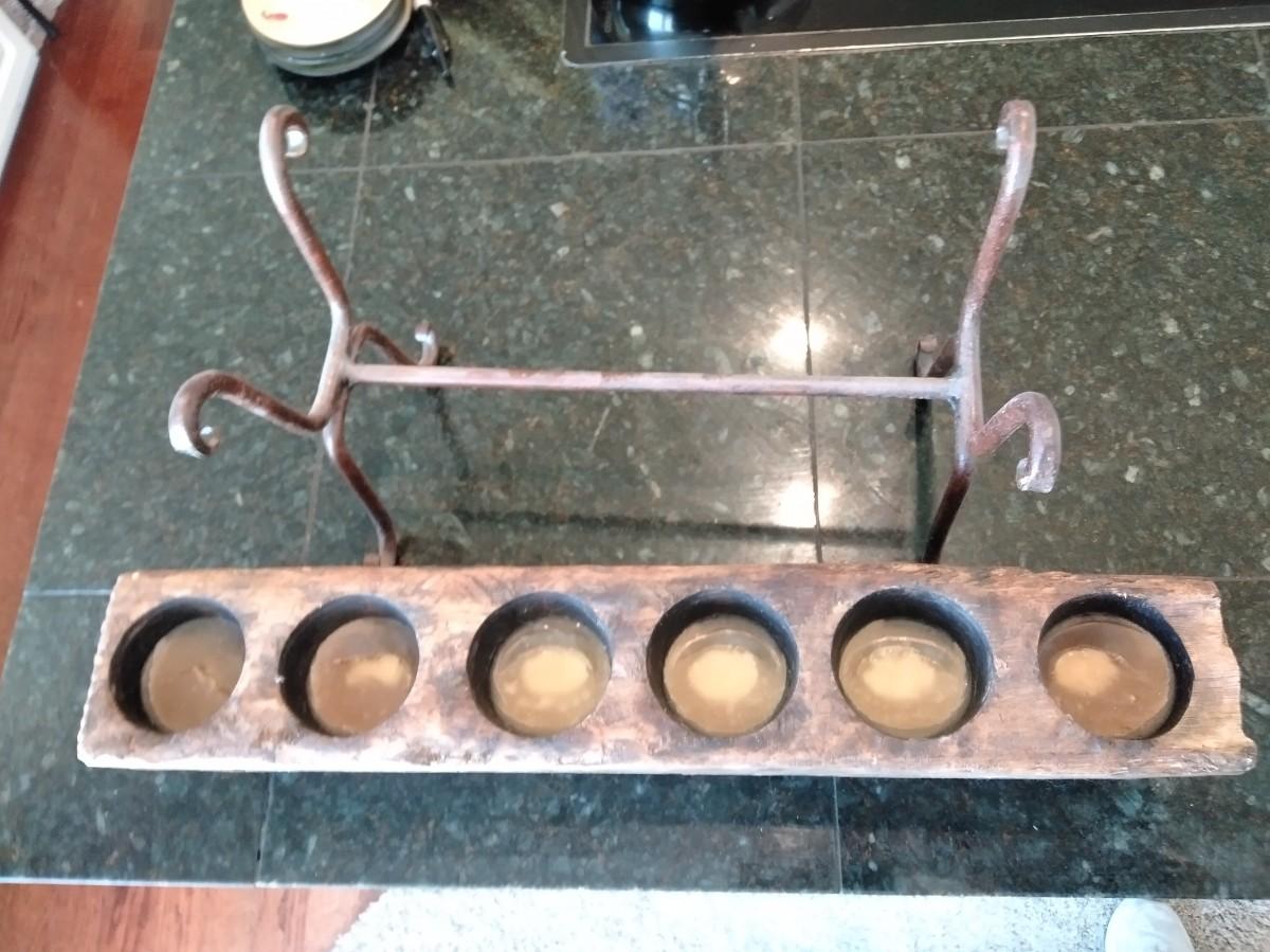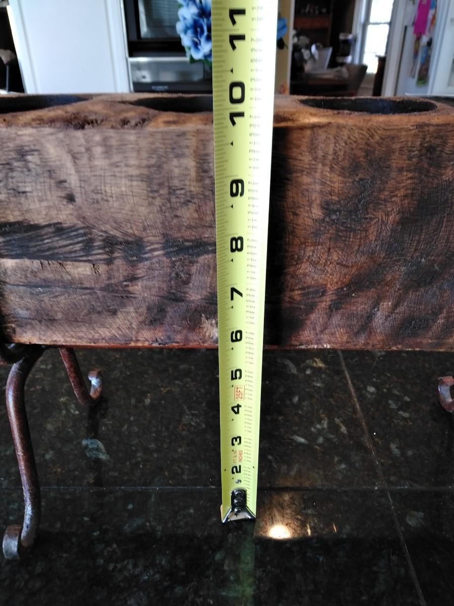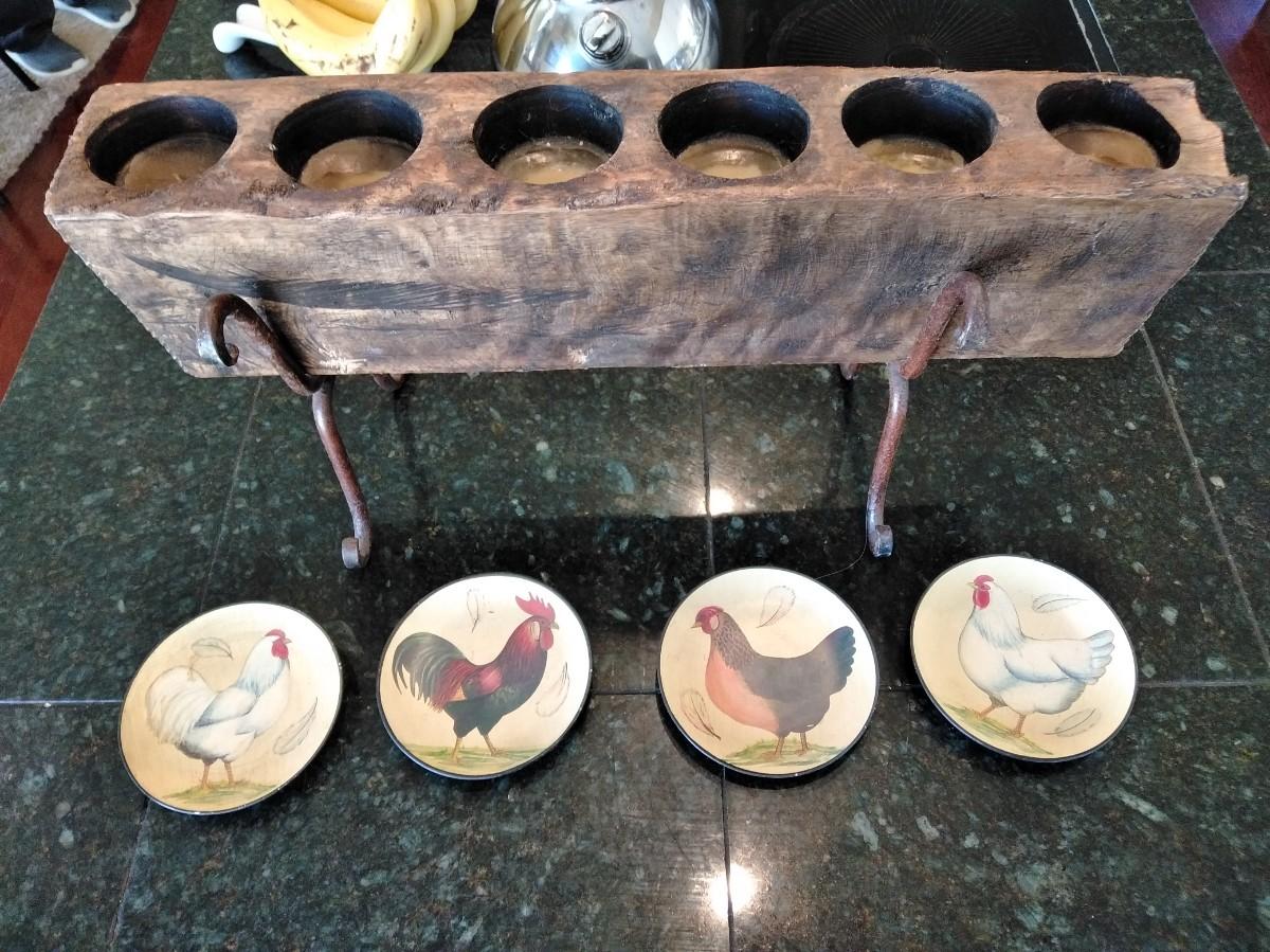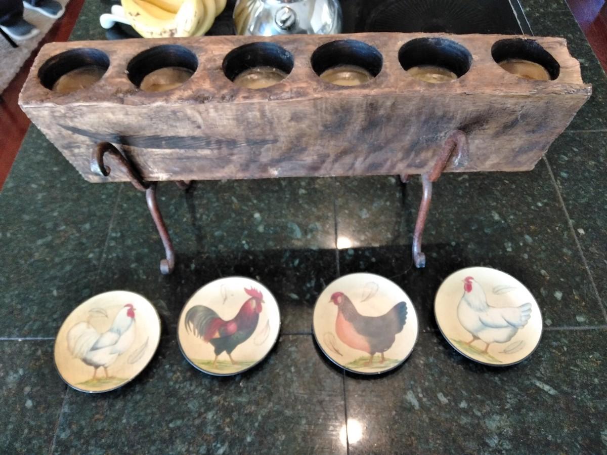 19" LONG 10" HIGH CARVED WOODEN CANDLE HOLDER WITH IRON STAND, AND FOUR SMALL CHICKEN PLATES / COASTERS.