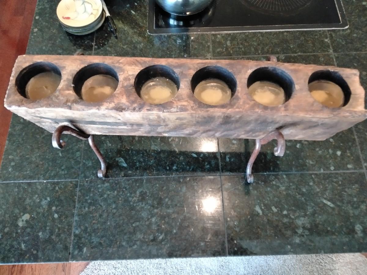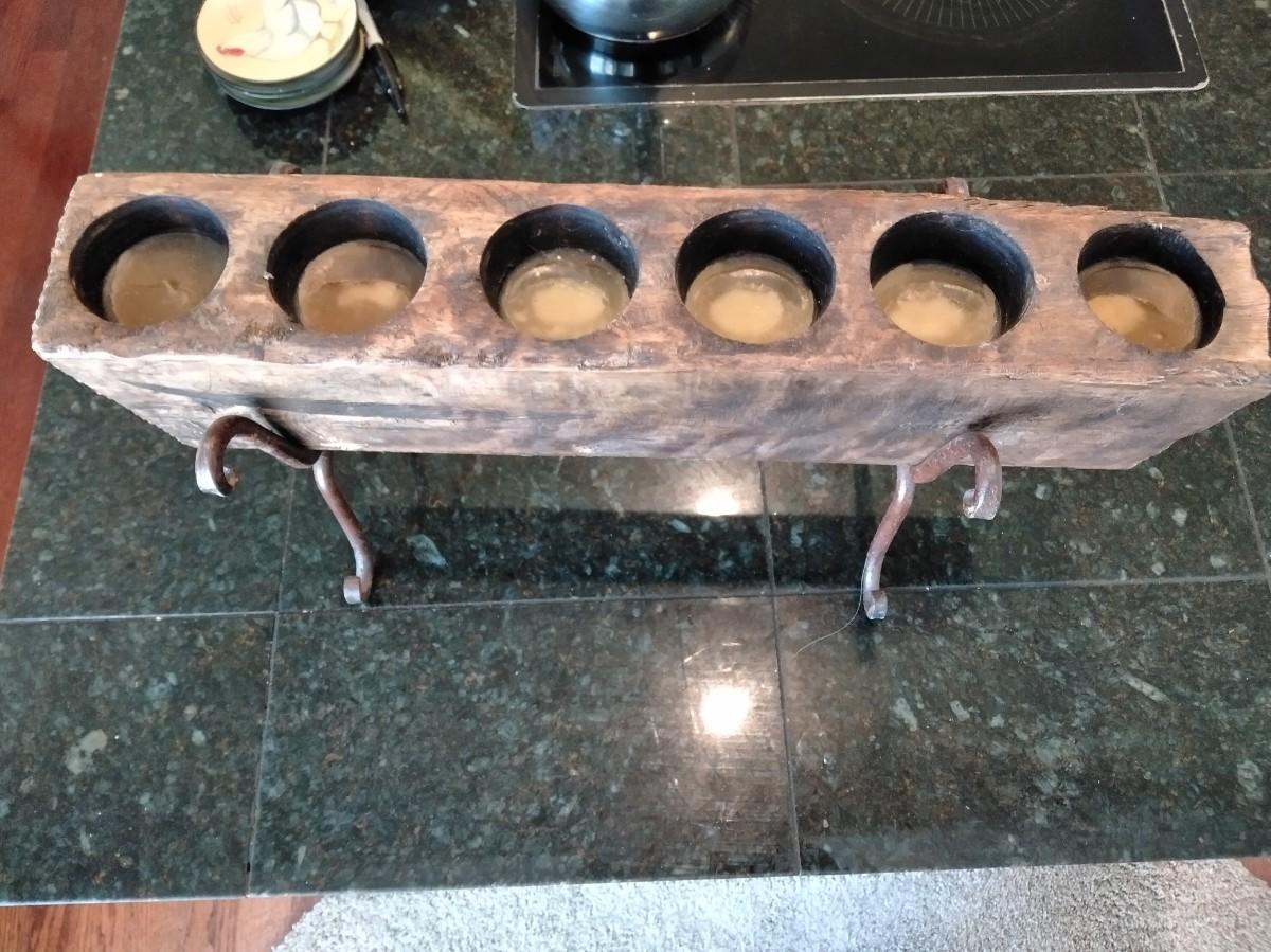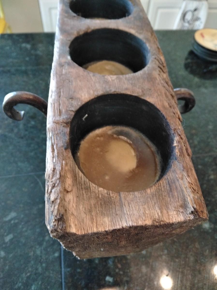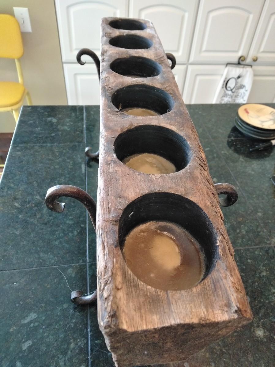 19" LONG 10" HIGH CARVED WOODEN CANDLE HOLDER WITH IRON STAND, AND FOUR SMALL CHICKEN PLATES / COASTERS.