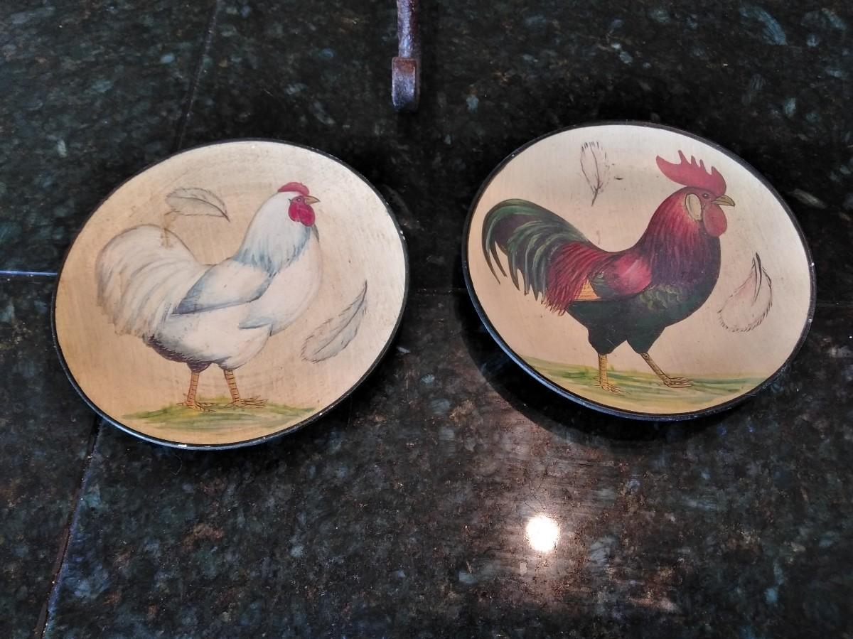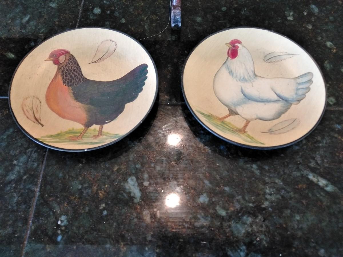 LOT 88 WOODEN CANDLE HOLDER AND CHICKEN PLATES (W)