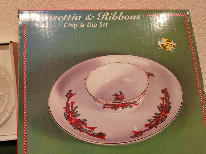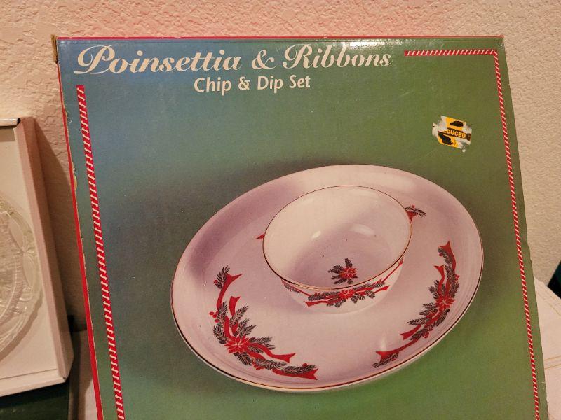 Lot 881: Set of Poinsettia Ribbons Plate/Bowl and NEW MIKASA Christmas Dish
