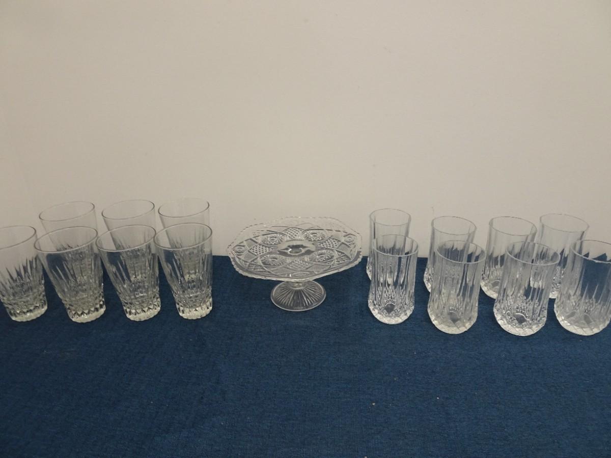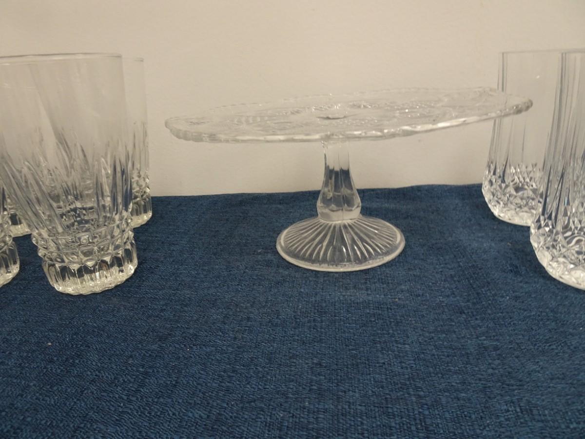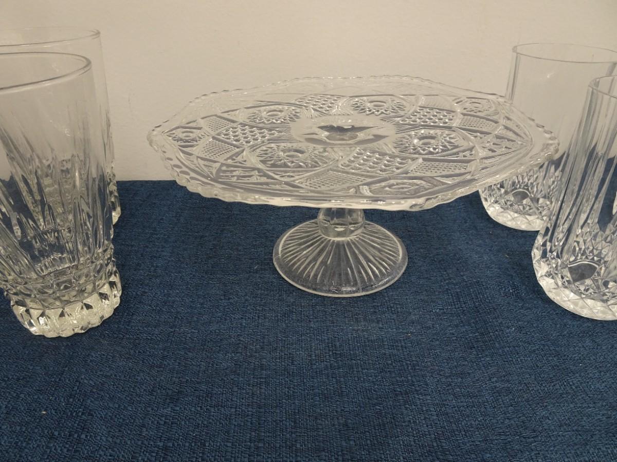 LOT 882 GLASS CAKE PLATE AND GLASSES